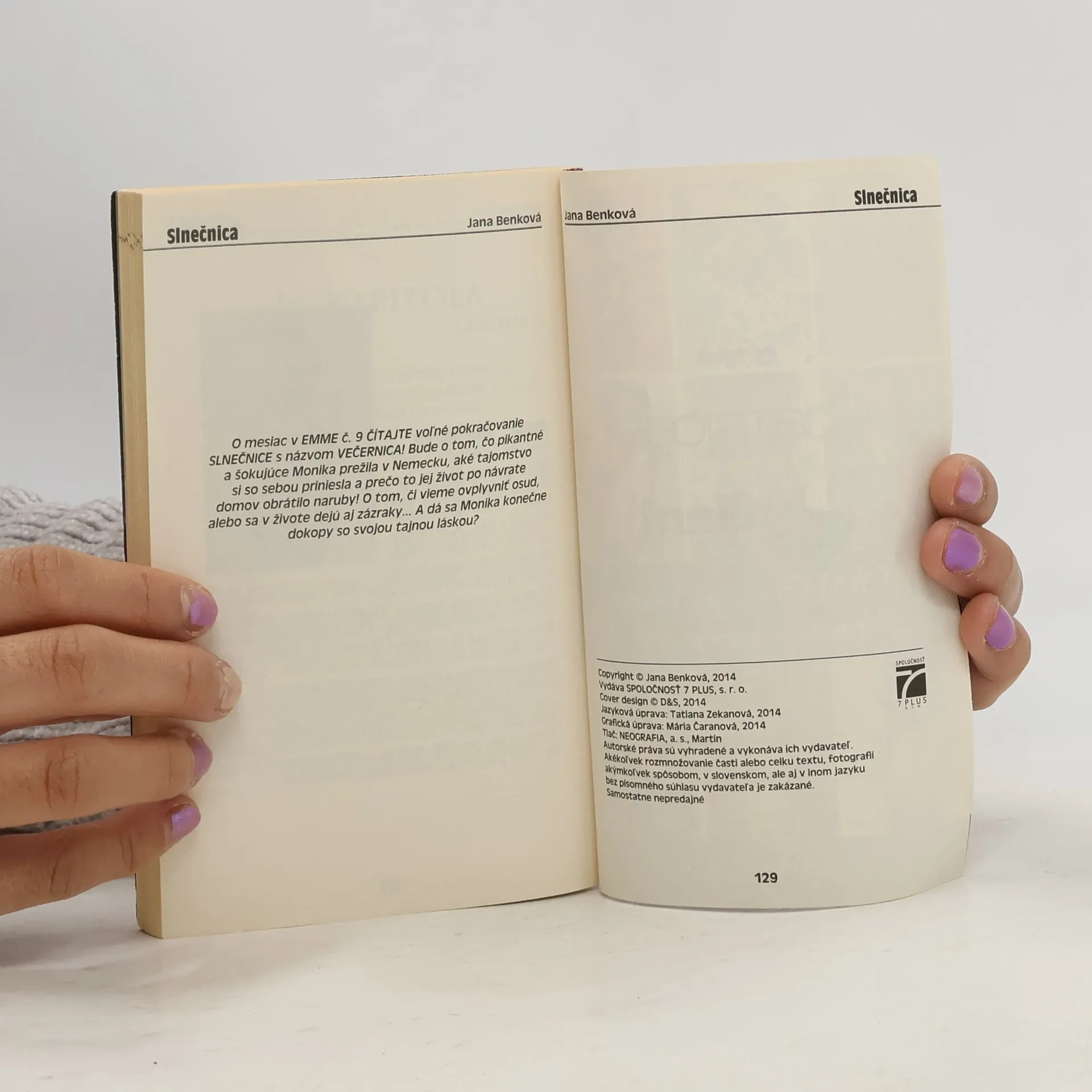 Je to iskrivý, sexi príbeh o tom, aké trapasy sme schopné urobiť pre lásku k milovanému mužovi, a že kvôli chlapovi dokážeme zájsť až za hranicu svojich síl... O tom, že ak ničíme seba, ubližujeme zároveň tým, čo nás ľúbia... prezradila nám autorka Jana Benková. Prvá časť knihy je teda plná toho, čo v lete prežívame všetky - lásky, hľadania, sklamania, druhá časť tohto románu vyjde s názvom Večernica bude šokujúca a okorenená našou ženskou rafinovanosťou a silou, no obe sú plné iskier, ktoré prináša život a láska..