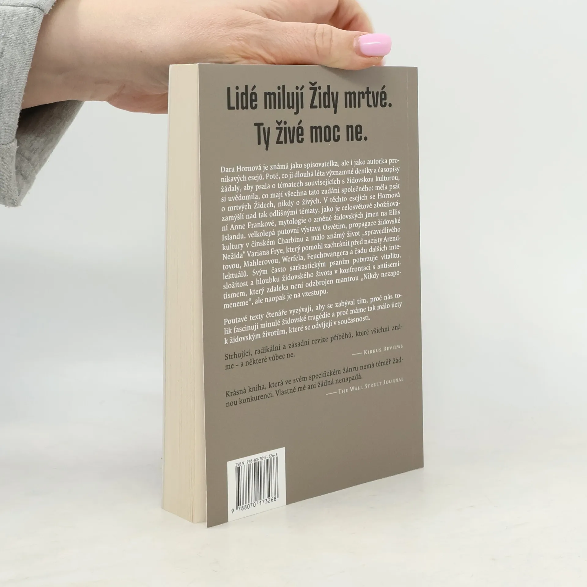 Dara Hornová je známá jako spisovatelka, ale i jako autorka pronikavých esejů. Poté, co ji dlouhá léta významné deníky a časopisy žádaly, aby psala o tématech souvisejících s židovskou kulturou, si uvědomila, co mají všechna tato zadání společného: měla psát o mrtvých Židech, nikdy o živých. V těchto esejích se Hornová zamýšlí nad tak odlišnými tématy, jako je celosvětové zbožňování Anne Frankové, mytologie o změně židovských jmen na Ellis Islandu, velkolepá putovní výstava Osvětim, propagace židovské kultury v čínském Charbinu a málo známý život „spravedlivého Nežida“ Variana Frye, který pomohl zachránit před nacisty Arendtovou, Mahlerovou, Werfela, Chagalla, Feuchtwangera a řadu dalších intelektuálů. Svým často sarkastickým psaním potvrzuje vitalitu, složitost a hloubku židovského života v konfrontaci s antisemitismem, který zdaleka není odzbrojen mantrou „Nikdy nezapomeneme“, ale naopak je na vzestupu. Poutavé texty čtenáře vyzývají, aby se zabýval tím, proč nás tolik fascinují minulé židovské tragédie a proč máme tak málo úcty k židovským životům, které se odvíjejí v současnosti. Bolestně aktuální čtení.