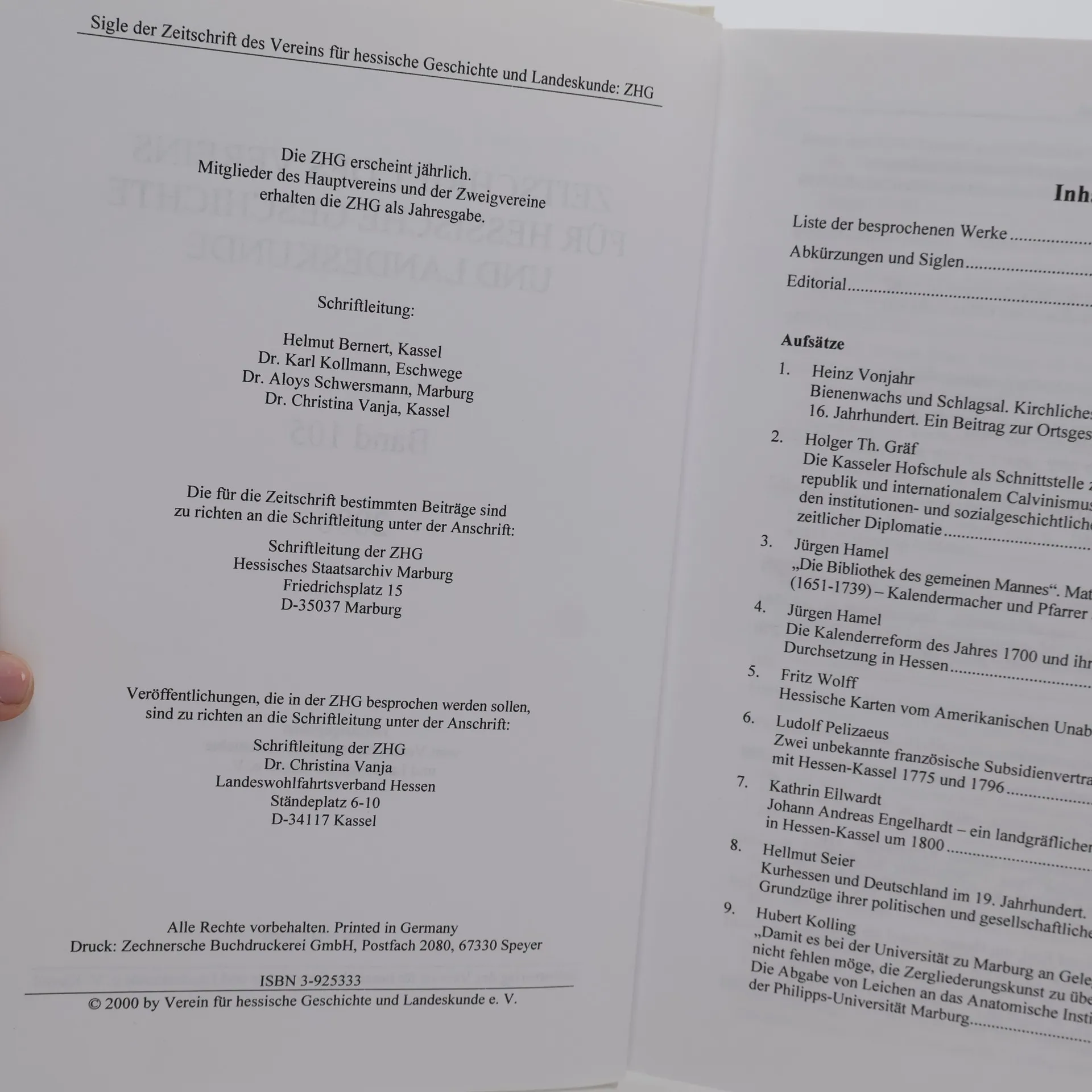 Zeitschrift des Vereins für hessische Geschichte und Landeskunde. Band 105, 2000, Autorenkollektiv