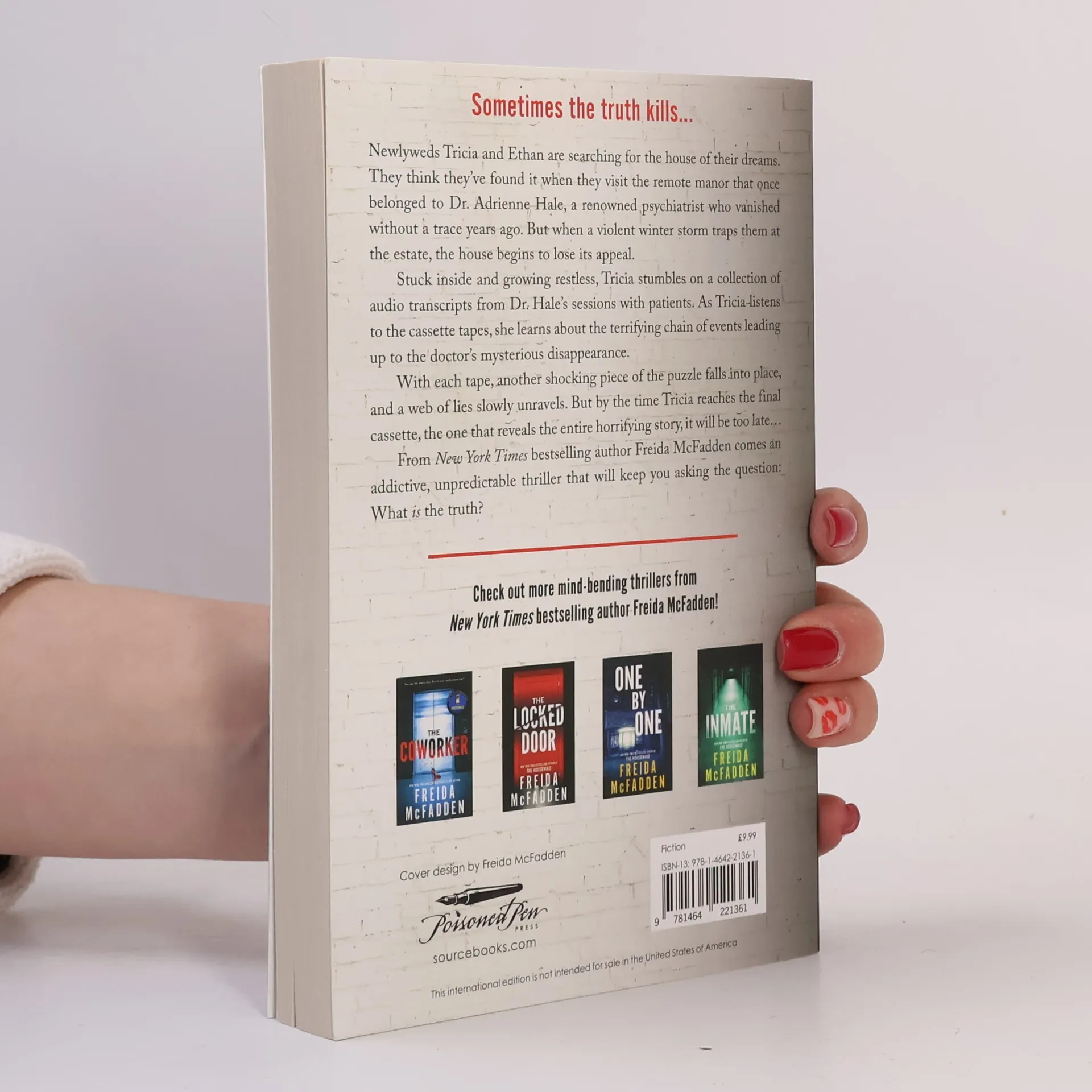 A twisting, pulse-pounding thriller from the Sunday Times bestselling author of The Housemaid and The Coworker! Sometimes the truth kills... Newlyweds Tricia and Ethan are searching for the house of their dreams. They think they've found it when they visit the remote manor that once belonged to Dr. Adrienne Hale, a renowned psychiatrist who vanished without a trace years ago. But when a violent winter storm traps them at the estate, the house begins to lose its appeal. Stuck inside and growing restless, Tricia stumbles on a collection of audio transcripts from Dr. Hale's sessions with patients. As Tricia listens to the cassette tapes, she learns about the terrifying chain of events leading up to the doctor's mysterious disappearance. With each tape, another shocking piece of the puzzle falls into place, and a web of lies slowly unravels. But by the time Tricia reaches the final cassette, the one that reveals the entire horrifying story, it will be too late... From Sunday Times bestselling author Freida McFadden comes an addictive, unpredictable thriller that will keep you asking the question: what is the truth?