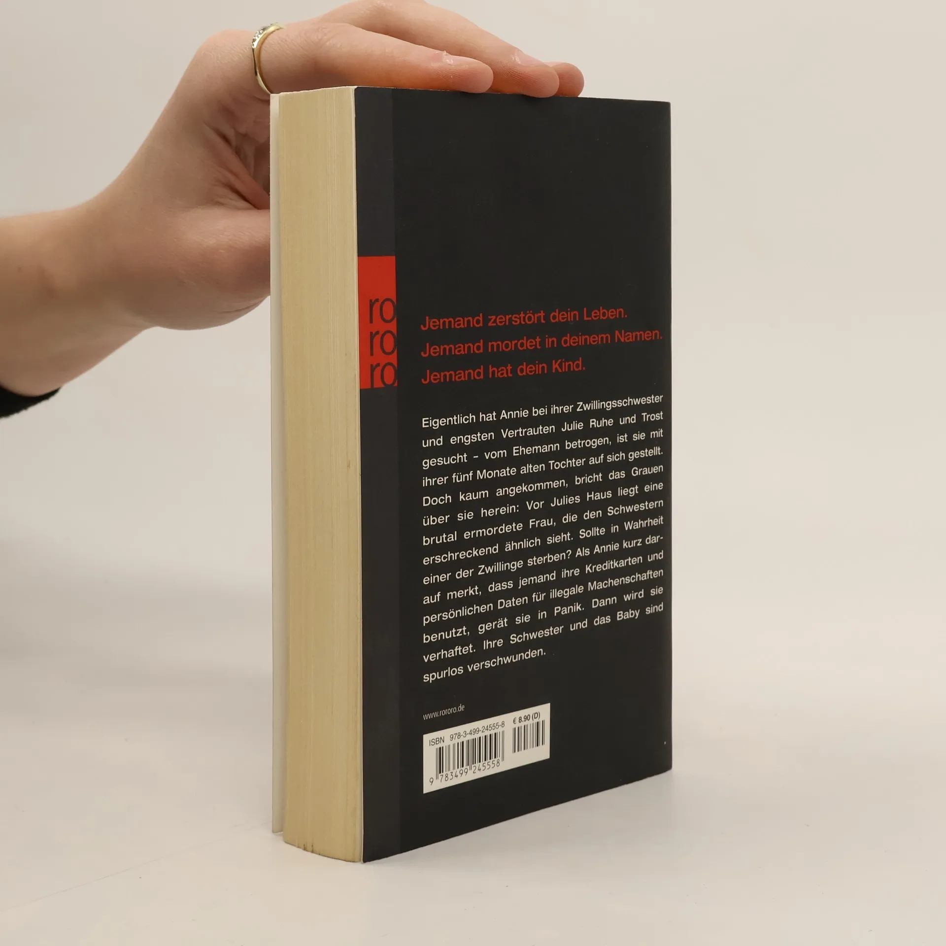 Jemand zerstört dein Leben. Jemand mordet in deinem Namen. Jemand hat dein Kind. Eigentlich hat Annie bei ihrer Zwillingsschwester und engsten Vertrauten Julie Ruhe und Trost gesucht – vom Ehemann betrogen, ist sie mit ihrer fünf Monate alten Tochter auf sich gestellt. Doch kaum angekommen, bricht das Grauen über sie herein: Vor Julies Haus liegt eine brutal ermordete Frau, die den Schwestern erschreckend ähnlich sieht. Sollte in Wahrheit einer der Zwillinge sterben? Als Annie kurz darauf merkt, dass jemand ihre Kreditkarten und persönlichen Daten für illegale Machenschaften benutzt, gerät sie in Panik. Dann wird sie verhaftet. Ihre Schwester und das Baby sind spurlos verschwunden.