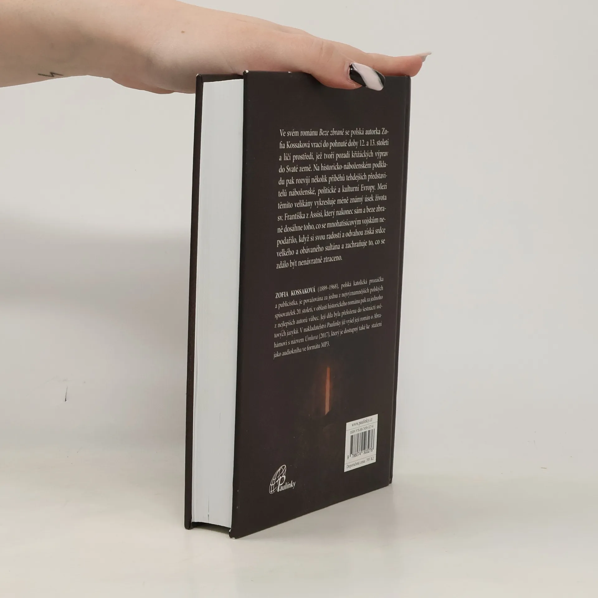 Ve svém románu Beze zbraně se autorka vrací k přelomu 12. a 13. století, kdy začínají bujet nové myšlenky a hereze a kdy vyvíjejí činnost různé náboženské sekty, jež se snaží rozbít samotné základy společenské struktury. Na tomto historicko-náboženském podkladě rozvíjí autorka poutavě několik příběhů tehdejších představitelů náboženské, politické a kulturní Evropy. Mezi nimi je i příběh prosťáčka Františka z Assisi, který jako by se svou opravdovostí vymykal tehdejší době plné neklidu a intrik a který nakonec dosáhne toho, co se nepodařilo mnohatisícové křížové výpravě - dobude Svatý hrob pro křesťanstvo sám a beze zbraně.