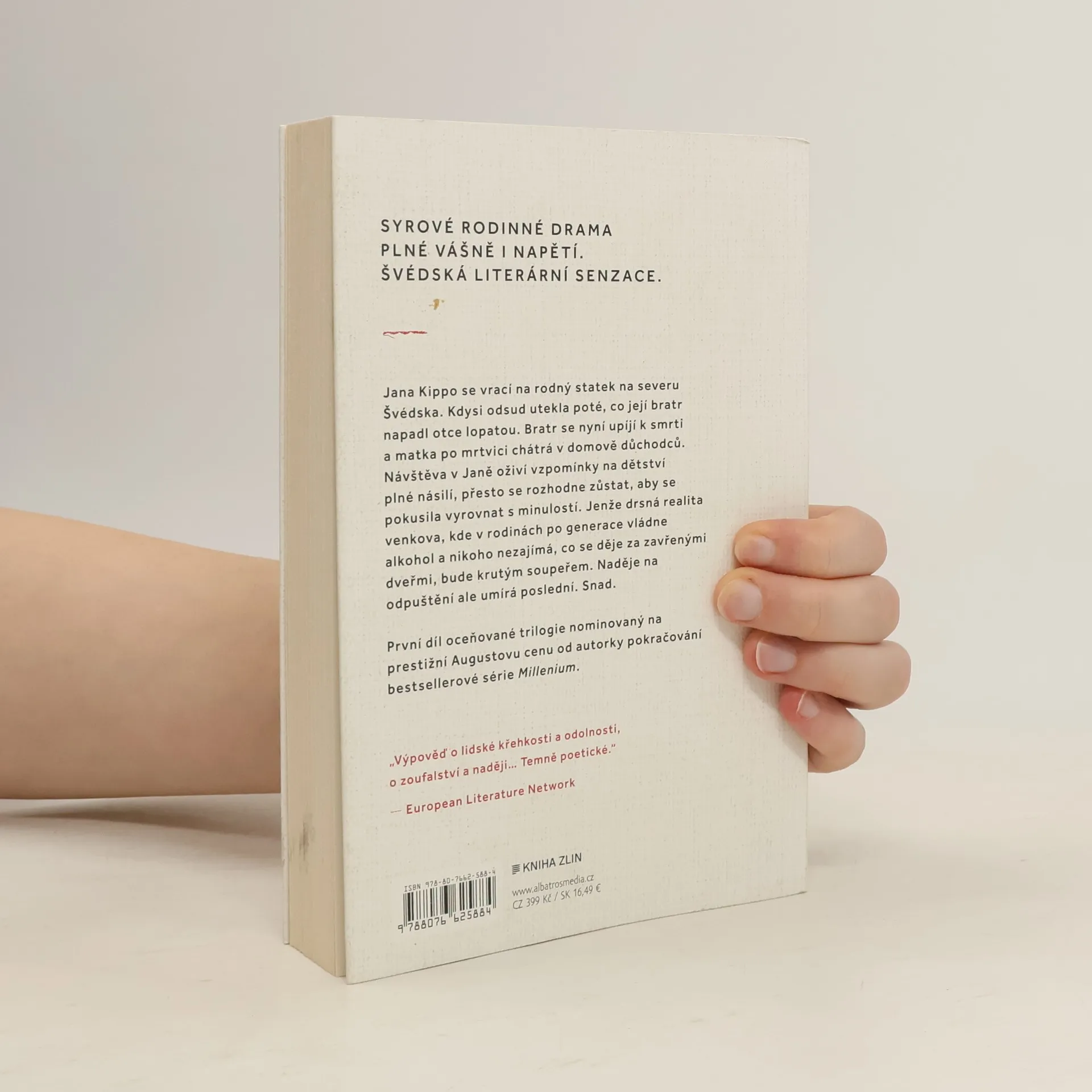 Syrové rodinné drama plné vášně i napětí. Švédská literární senzace. Jana Kippo se vrací na rodný statek na severu Švédska. Kdysi odsud utekla poté, co její bratr napadl otce lopatou. Bratr se nyní upíjí k smrti a matka po mrtvici chátrá v domově důchodců. Návštěva v Janě oživí vzpomínky na dětství plné násilí, přesto se rozhodne zůstat, aby se pokusila vyrovnat s minulostí. Jenže drsná realita venkova, kde v rodinách po generace vládne alkohol a nikoho nezajímá, co se děje za zavřenými dveřmi, bude krutým soupeřem. Naděje na odpuštění ale umírá poslední. Snad. Karin Smirnoff je švédská spisovatelka, původně pracovala jako novinářka, ale pak se rozhodla změnit obor a koupila dřevařskou firmu v severním Švédsku. Později vystudovala literární akademii při univerzitě v Lundu a právě v té době začala psát trilogii s hlavní hrdinkou Janou Kippovou, jejíž děj se odehrává ve vesnici nedaleko autorčina rodiště v Umea. Hned první díl se stal ve Švédsku senzací a byl nominován na prestižní Augustovu cenu. Celá trilogie je ceněna jak čtenáři, tak kritiky za svou literární kvalitu. Rodinné drama vypráví o skrytých traumatech, boji se závislostmi a touze někam patřit. Na osudech Kippových líčených se syrovou něhou a jedinečným jazykem autorka odhaluje kruté lidské pohnutky v celé jejich bolestné obnaženosti. Boří při tom nejen pravidla gramatiky.