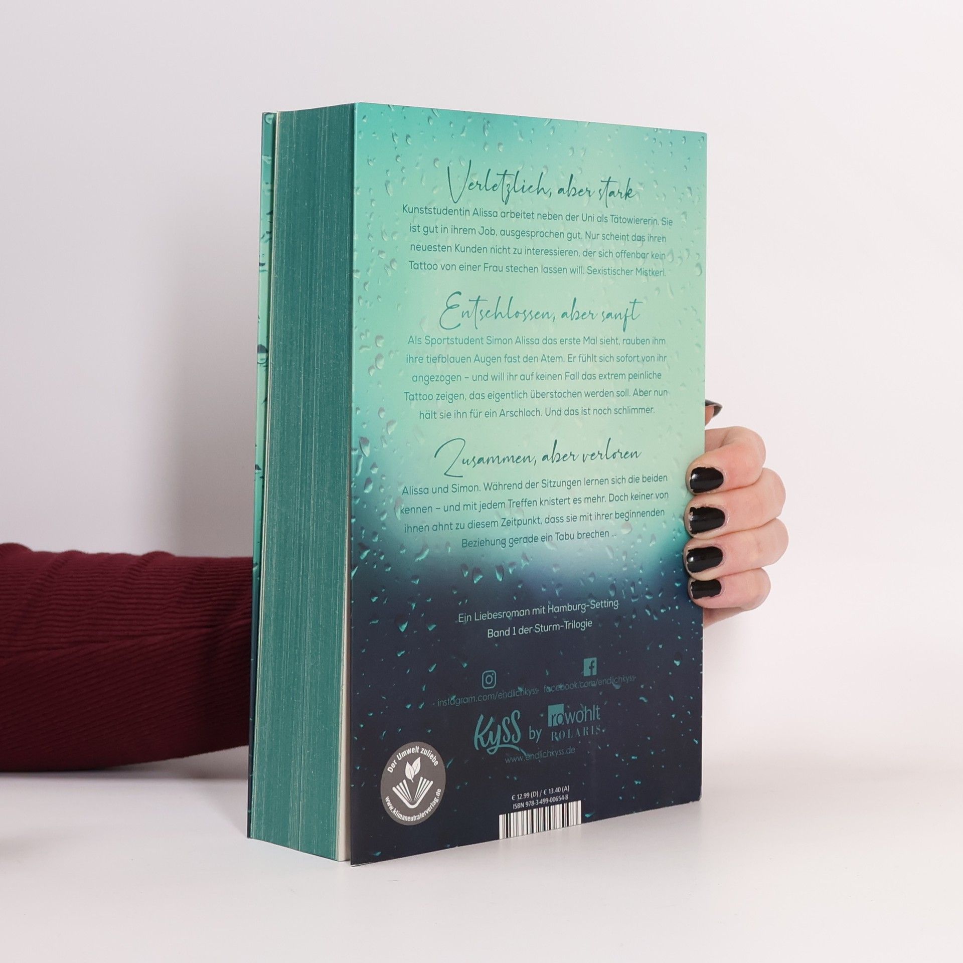 Verletzlich, aber stark Kunststudentin Alissa arbeitet neben der Uni als Tätowiererin. Sie ist gut in ihrem Job, ausgesprochen gut. Nur scheint das ihren neuesten Kunden nicht zu interessieren, der sich offenbar kein Tattoo von einer Frau stechen lassen will. Sexistischer Mistkerl.   Entschlossen, aber sanft Als Sportstudent Simon Alissa das erste Mal sieht, rauben ihm ihre tiefblauen Augen fast den Atem. Er fühlt sich sofort von ihr angezogen – und will ihr auf keinen Fall das extrem peinliche Tattoo zeigen, das eigentlich überstochen werden soll. Aber nun hält sie ihn für ein Arschloch. Und das ist noch schlimmer.   Zusammen, aber verloren Alissa und Simon. Während der Sitzungen lernen sich die beiden kennen – und mit jedem Treffen knistert es mehr. Doch keiner von ihnen ahnt zu diesem Zeitpunkt, dass sie mit ihrer beginnenden Beziehung gerade ein Tabu brechen … Band 1 der Sturm-Trilogie mit Setting Hamburg. Modern, authentisch, nahbar: Eine deutsche Autorin schreibt über deutsche Settings.