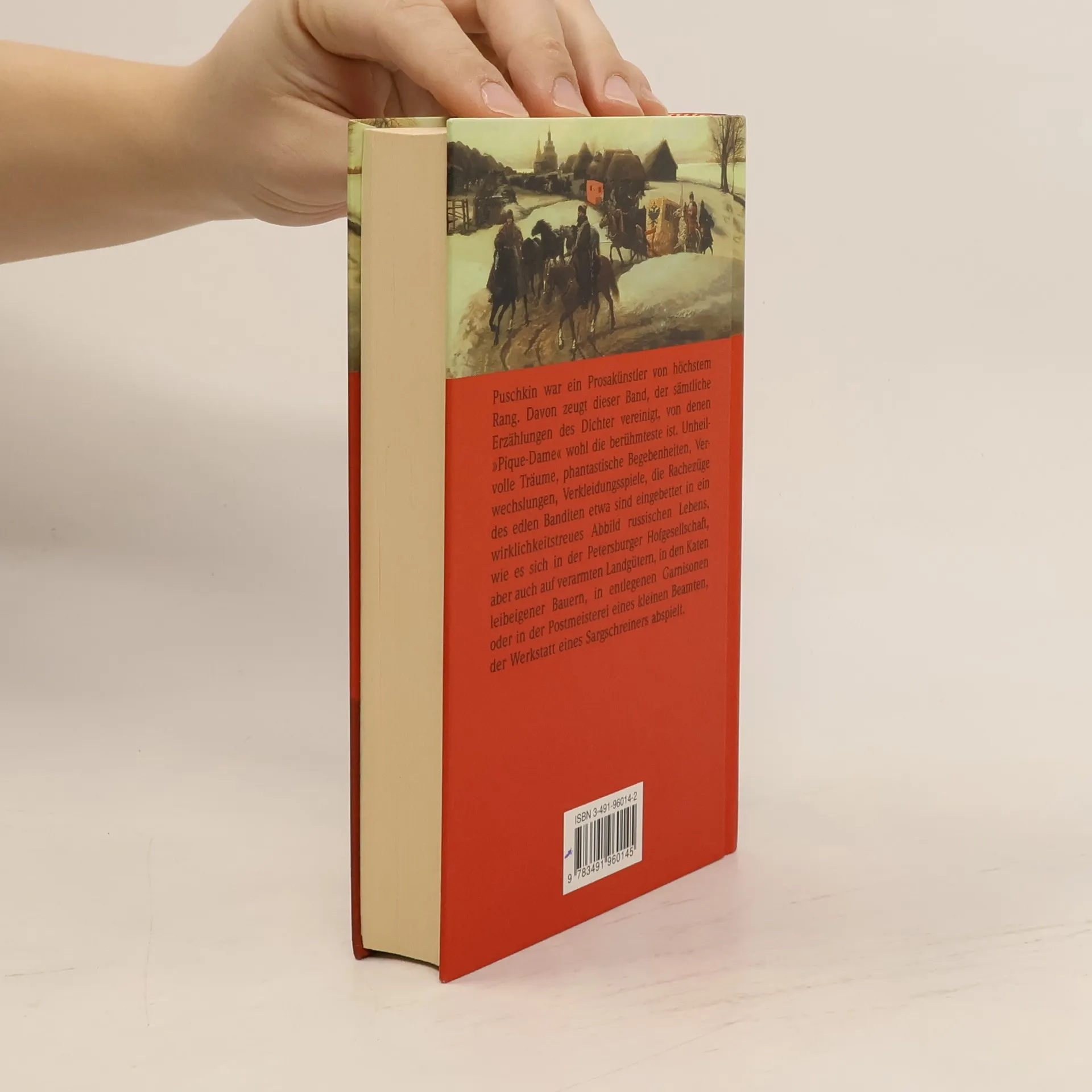"Puschkin war ein Prosakünstler von höchstem Rang. Davon zeugt dieser Band, der sämtliche Erzählungen des Dichter ereinigt, von denen "Pique -dame" wohl die berühmteste ist. Unheilvolle Träume, phantastische Begebenheiten, Verwechslungen, Verkleidungsspiele, die Rachezüge des edlen Banditen etwa sind eingebettet in ein wirklichkeitstreues Abbild russichen Lebens, wie es sich in der Petersburger Hofgesellschaft, aber auch auf verarmten Landgütern, in den Katen leibeigener Bauernm in entlegenen Garnisonen oder in der Postmeisterei eines kleinen Beamten, der Werkstatt eines Sargschreiners abspielt."--Page [4] of cover