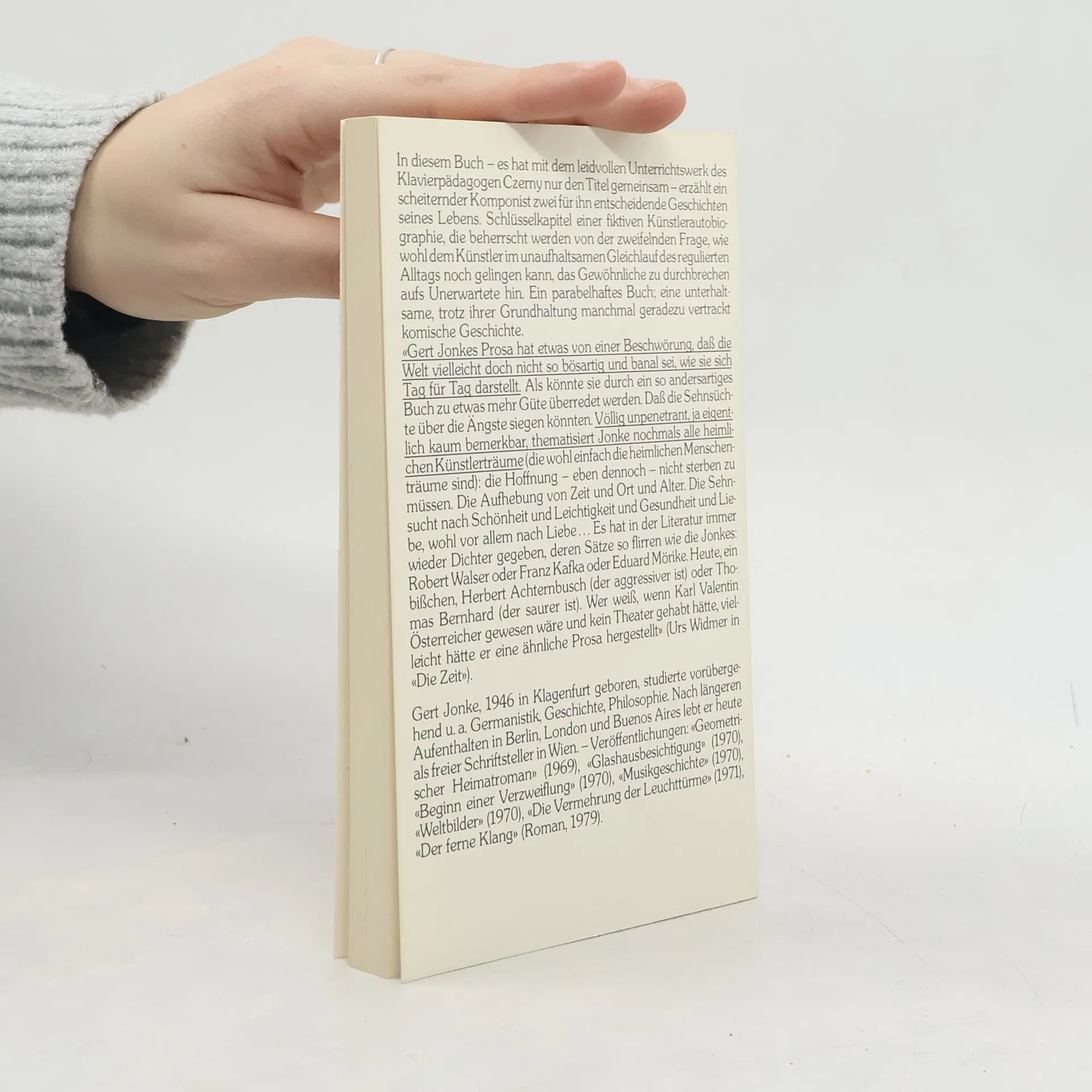 Gert Jonkes Welt, schreibt Jochen Jung in seinem Nachwort, einem Porträt des Autors,entsteht nicht, sie ist da, auf einmal und unvermittelt. Es gibt keine Brücken, die dort hinführen. Wer beim ersten Sprung hinüber zu kurz gesprungen ist und ins Wasser fällt, muß eben ein zweites Mal springen. Beim dritten Mal ist er dann drüben, wie von einem Magnet hinübergezogen, und will am liebsten nie mehr zurück.In Jonkes Schule der Geläufigkeit - sie hat mit dem leidvollen Unterrichtswerk des Klavierpädagogen Czerny nur den Titel gemeinsam - gerät ein Komponist in ein Fest bei dem Fotografen Anton Diabelli und dessen Schwester Johanna, dasin Wirklichkeitdie genaue Wiederholung des Festes vom vorigen Jahr zu sein scheint, worauf sich auch nach dem Fest alles immer wieder nur wie im vorigen Jahr ereignen könnte und der Eintritt einerZeitkatastrophenur mit Mühe abwendbar zu sein scheint.