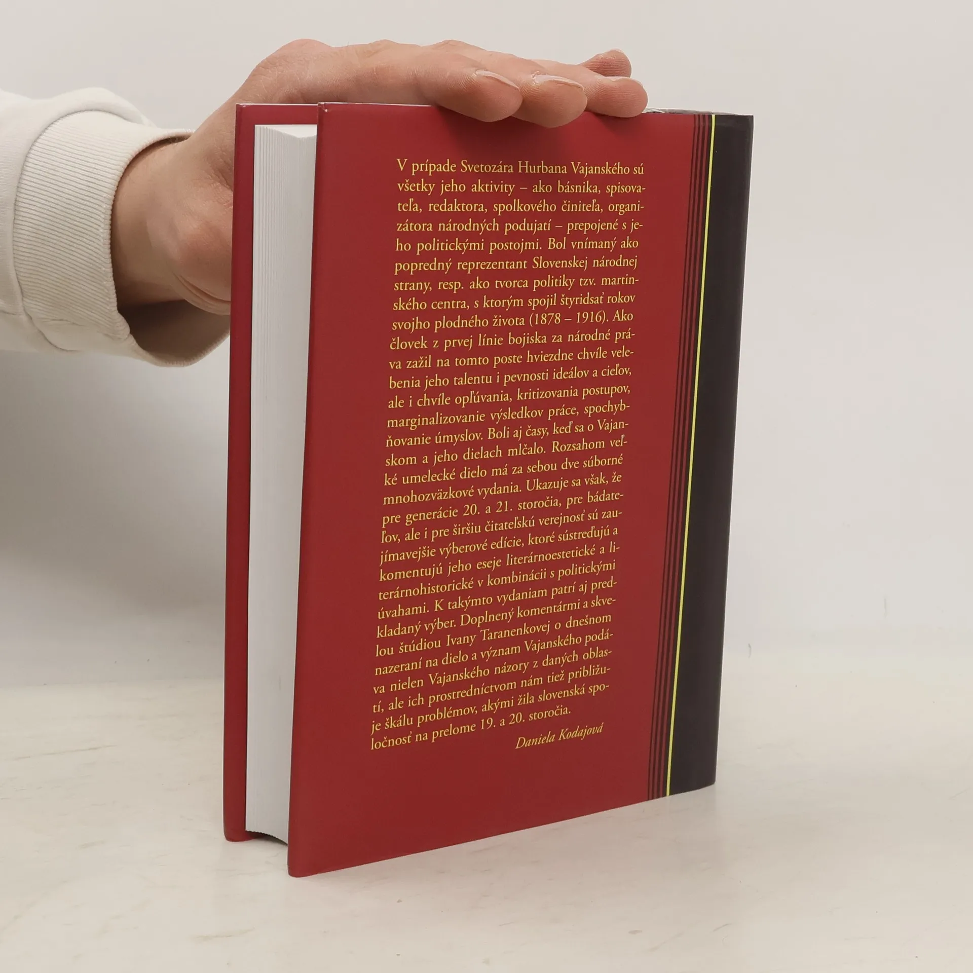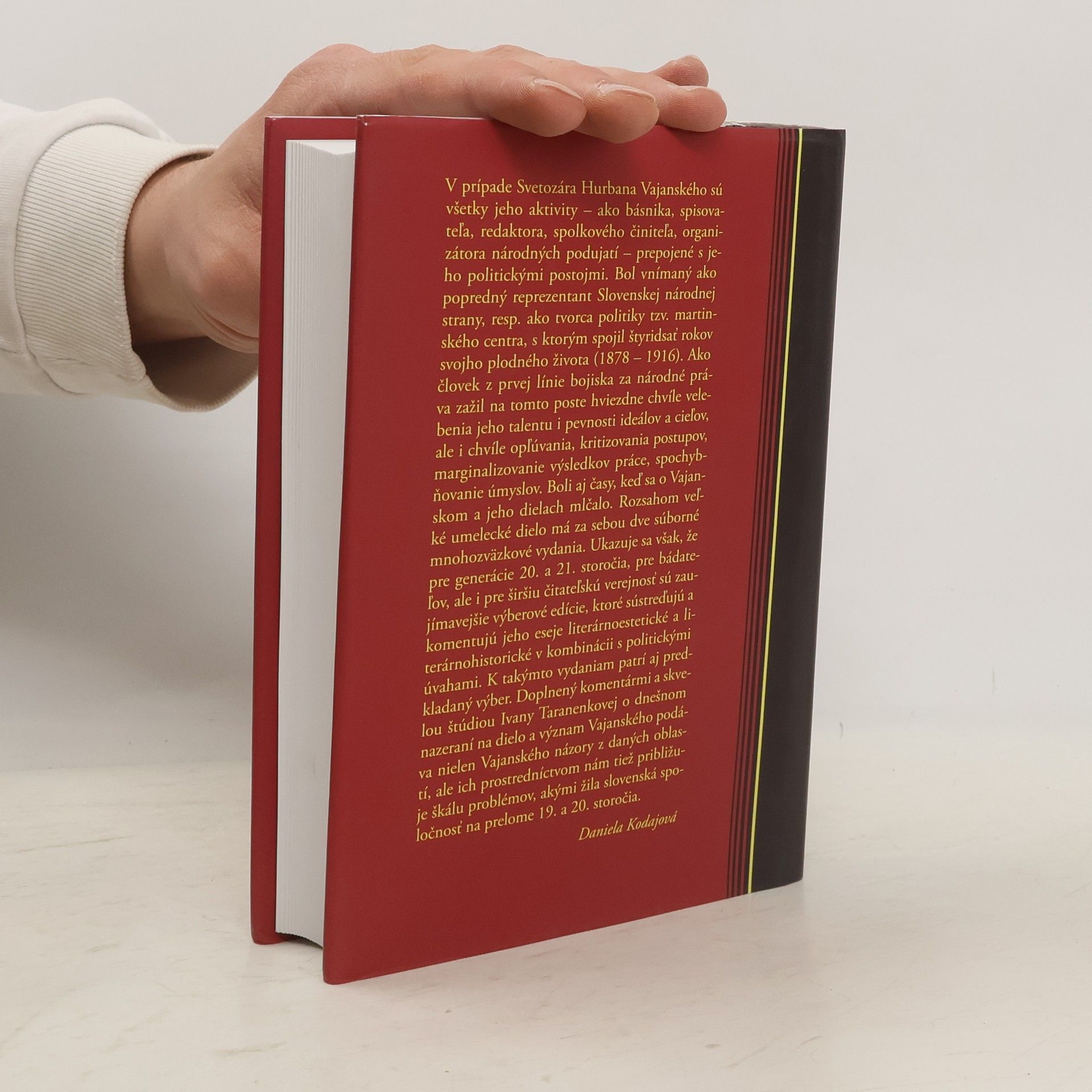 V prípade Svetozára Hurbana Vajanského sú všetky jeho aktivity - ako básnika, spisovateľa, redaktora, spolkového činiteľa, organizátora národných podujatí — prepojené s jeho politickými postojmi. Bol vnímaný ako popredný reprezentant Slovenskej národnej strany, resp. ako tvorca politiky tzv. martinského centra, s ktorým spojil štyridsať rokov svojho plodného života (1878 — 1916). Ako človek z prvej línie bojiska za národné práva zažil na tomto poste hviezdne chvíle vele-benia jeho talentu i pevnosti ideálov a cieľov, ale i chvíle opľúvania, kritizovania postupov, marginalizovanie výsledkov práce, spochybňovanie úmyslov. Boli aj časy, keď sa o Vajan-skom a jeho dielach mlčalo. Rozsahom veľké umelecké dielo má za sebou dve súborné mnohozväzkové vydania. Ukazuje sa však, že pre generácie 20. a 21. storočia, pre bádateľov, ale i pre širšiu čitateľskú verejnosť sú zaujímavejšie výberové edície, ktoré sústreďujú a komentujú jeho eseje literárnoestetické a literárnohistorické v kombinácii s politickými úvahami. K takýmto vydaniam patrí aj predkladaný výber. Doplnený komentármi a skvelou štúdiou Ivany Taranenkovej o dnešnom nazeraní na dielo a význam Vajanského podáva nielen Vajanského názory z daných oblastí, ale ich prostredníctvom nám tiež približuje škálu problémov, akými žila slovenská spoločnosť na prelome 19. a 20. storočia.
