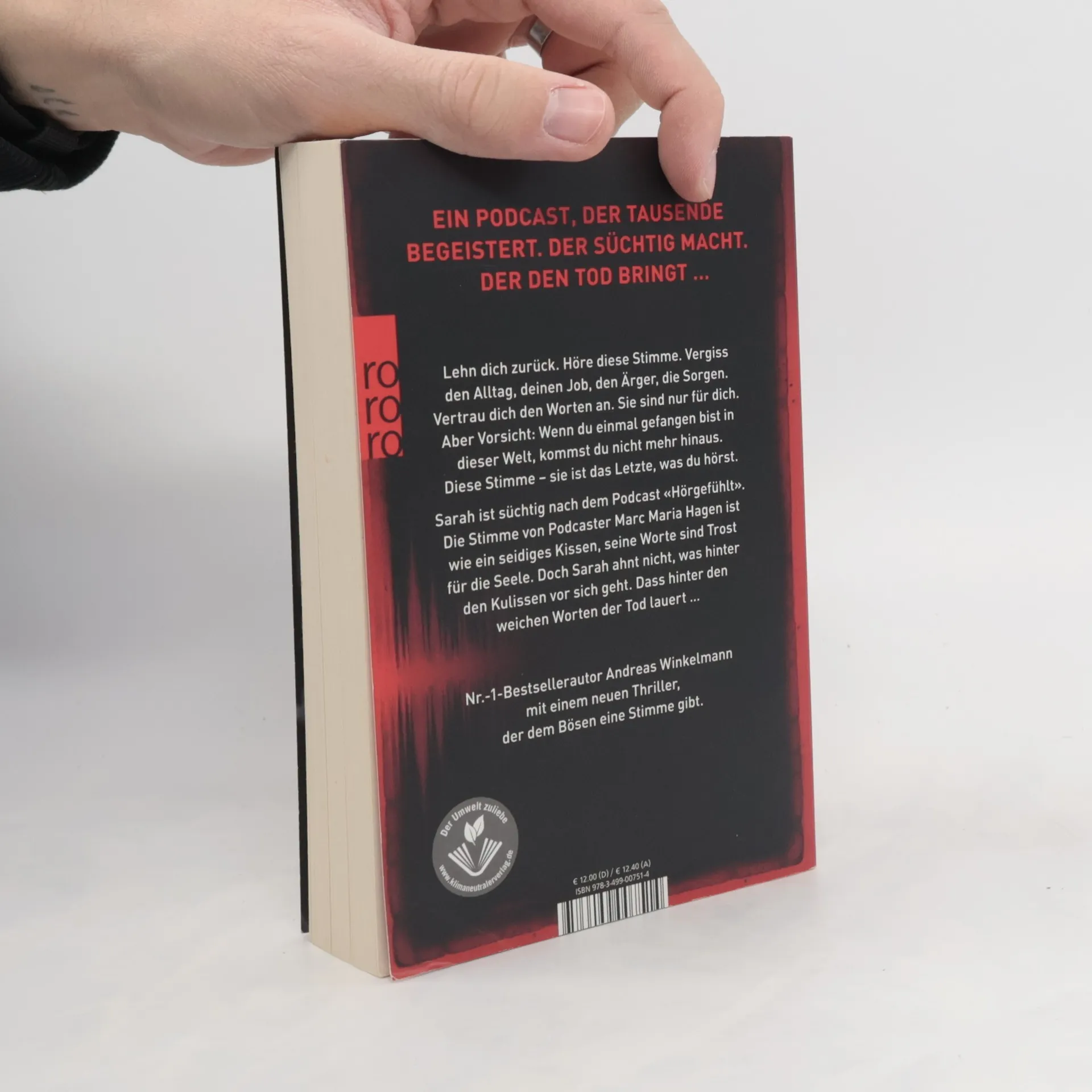 Ein Podcast, der Tausende begeistert. Der süchtig macht. Der den Tod bringt …  Lehn dich zurück. Höre diese Stimme. Vergiss deinen Alltag, den Job, den Ärger, die Sorgen. Vertrau dich den Worten an. Sie sind nur für dich. Aber Vorsicht: Wenn du einmal gefangen bist in dieser Welt, kommst du nicht mehr hinaus. Diese Stimme – sie ist das Letzte, was du hörst. Sarah ist süchtig nach dem Podcast «Hörgefühlt». Die Stimme von Podcaster Marc Maria Hagen ist wie ein seidiges Kissen, seine Worte sind Trost für die Seele. Doch Sarah ahnt nicht, was hinter den Kulissen vor sich geht. Dass hinter den weichen Worten der Tod lauert. Nr.-1-Bestsellerautor Andreas Winkelmann mit einem neuen Thriller, der dem Bösen eine Stimme gibt.