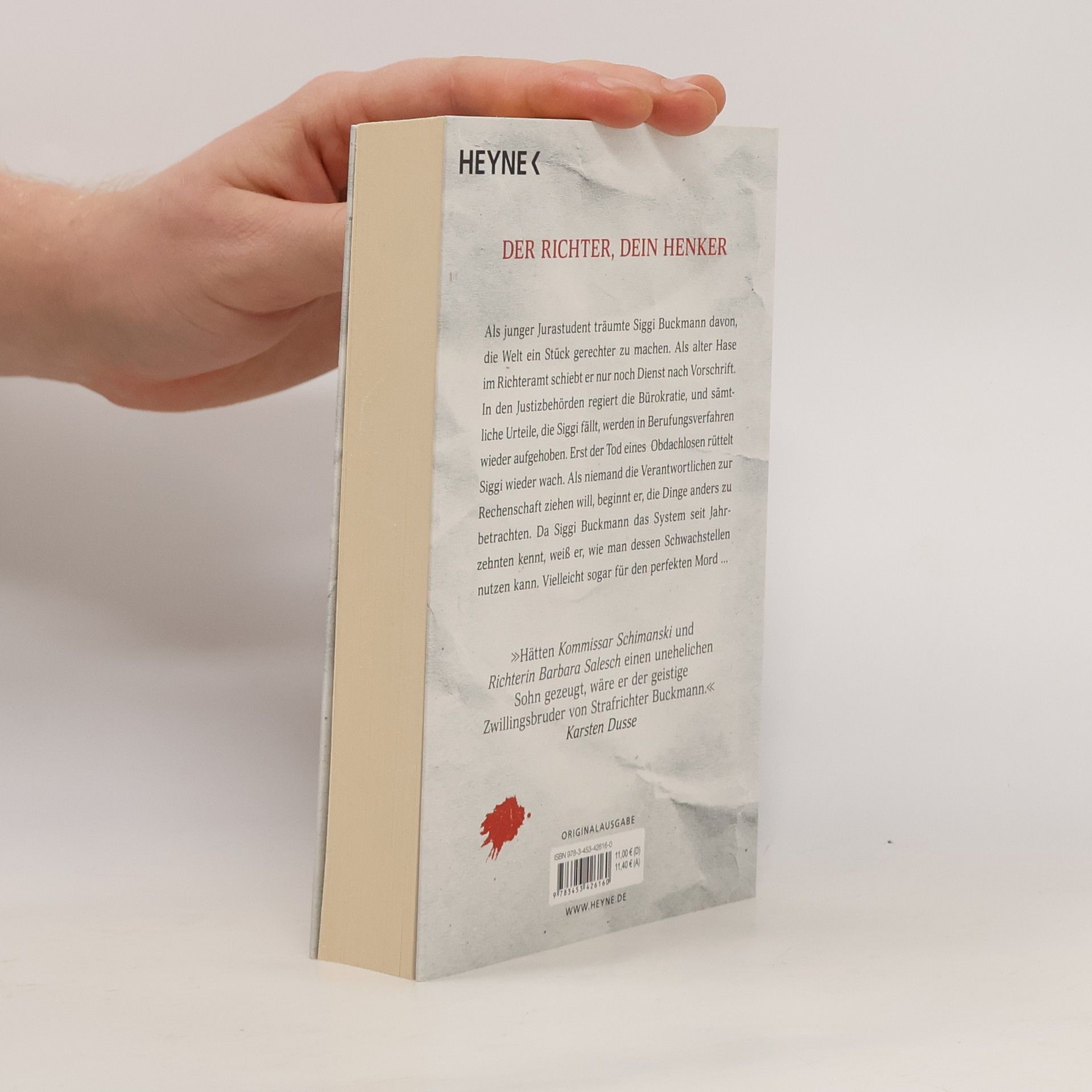 Der Richter, dein Henker Als junger Jurastudent träumte Siggi Buckmann davon, die Welt ein Stück gerechter zu machen. Als alter Hase im Richteramt schiebt er nur noch Dienst nach Vorschrift. In den Justizbehörden regiert die Bürokratie und sämtliche Urteile, die Siggi fällt, werden in Berufungsverfahren wieder aufgehoben. Erst der Tod eines obdachlosen Junkies rüttelt Siggi wieder wach. Als niemand die Verantwortlichen zur Rechenschaft ziehen will, beginnt Siggi, die Dinge anders zu betrachten. Da er das System seit Jahrzehnten kennt, weiß er, wie man dessen Schwachstellen nutzen kann. Vielleicht kommt ja auch er selbst mit einem Verbrechen davon? »Hätten Kommissar Schimanski und Richterin Barbara Salesch einen unehelichen Sohn gezeugt, wäre er der geistige Zwillingsbruder von Strafrichter Buckmann.« Karsten Dusse, Autor von »Achtsam morden«