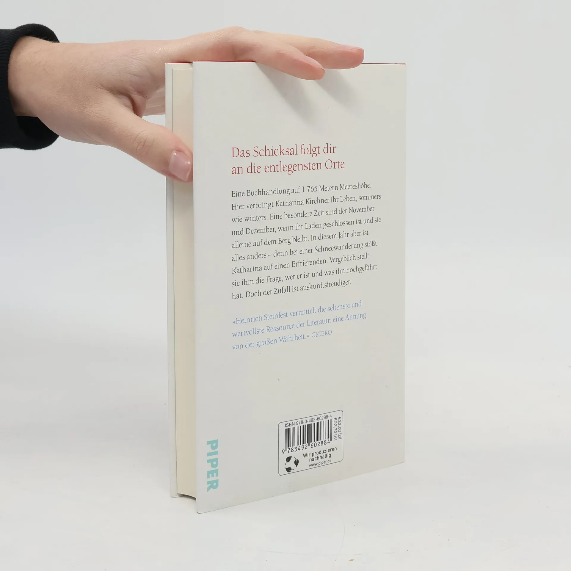 Eine kluge Buchhändlerin und ihr rätselhafter GastOhne sie wäre er gestorben, dünn bekleidet, im Eis der Alpen. Das war wohl auch sein Plan, aber Katharina rettet ihn, bietet ihm Unterschlupf. Auf 1700 Metern Höhe betreibt sie eine Buchhandlung, die nun, im November, geschlossen bleibt. Sie behält den Fremden ohne Namen und Gedächtnis bei sich, vorübergehend. Die beiden lesen zusammen, er kocht für sie, und Stück für Stück beginnt er sich zu erinnern. Heinrich Steinfest ergründet die Wege, die uns Zufall und Schicksal einschlagen lassen. Und stellt die Frage, was mit uns geschieht, wenn eine böse Tat das Leben in eine andere Richtung lenkt.