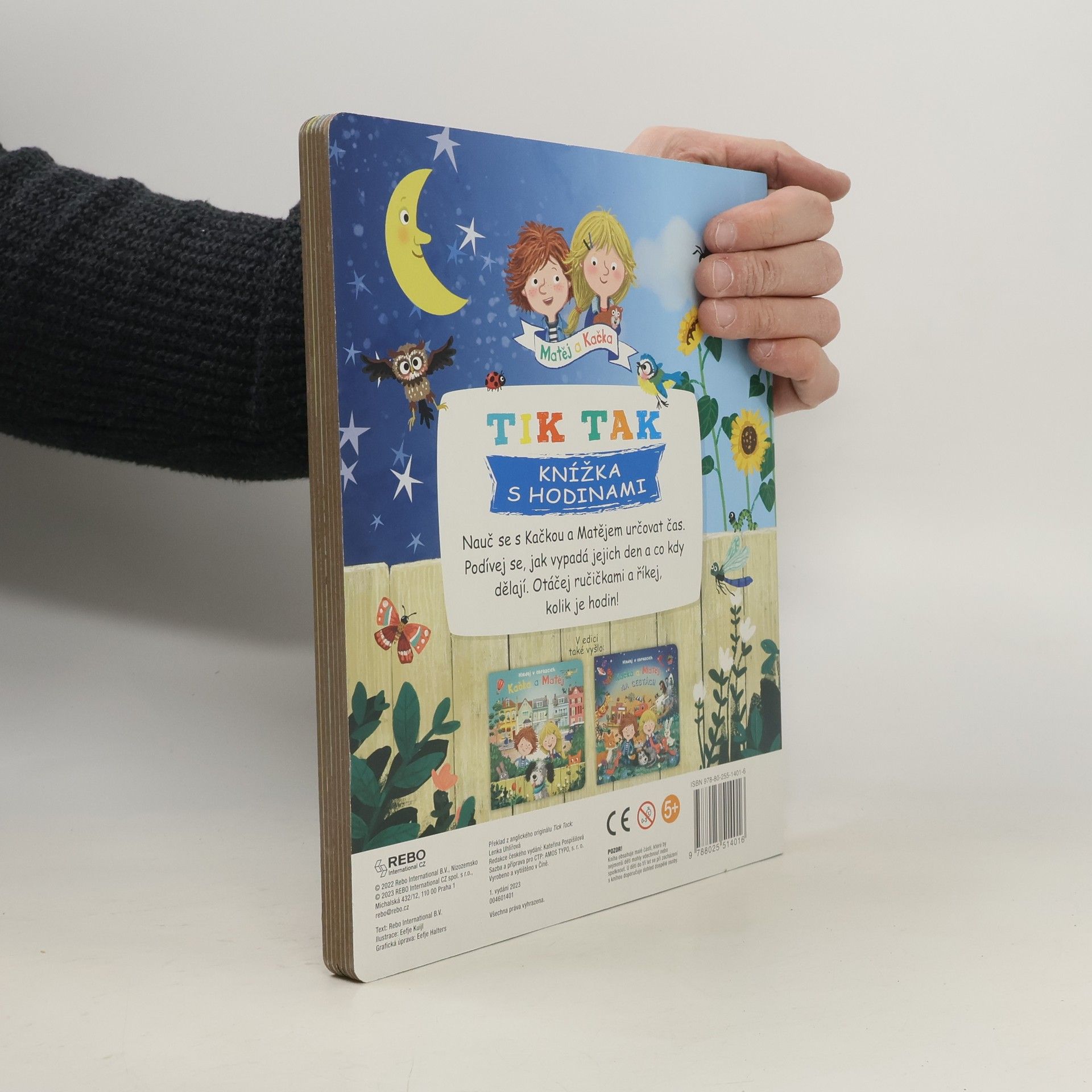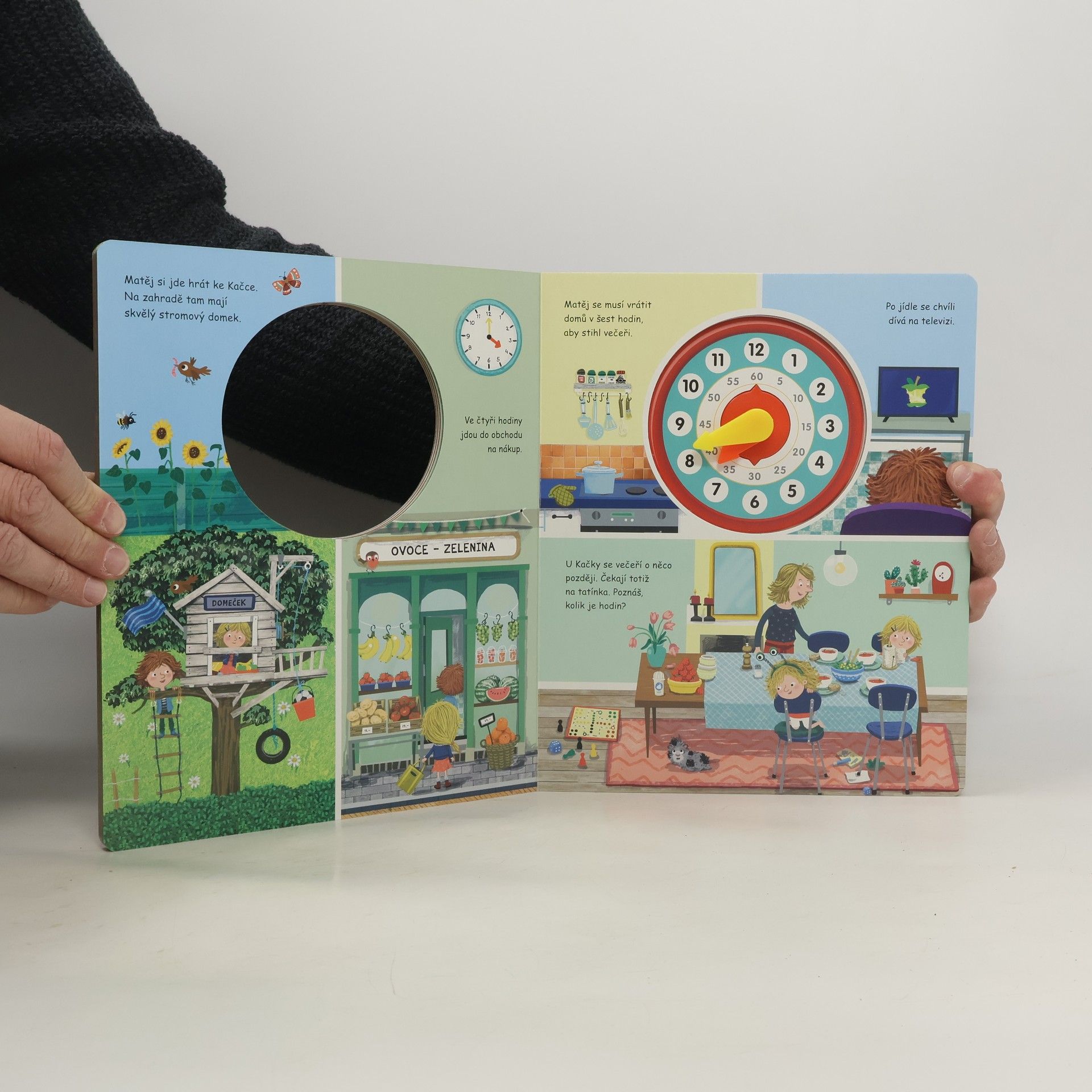 Jak vypadá Kaččin a Matějův den? V kolik hodin vstávají, kdy si hrají a kdy se ukládají na kutě? Knížka přibližuje režim dne dvou malých školáků prostřednictvím krásných ilustrací a přitom hravým způsobem – pomocí ciferníku s otočnými ručičkami – učí děti určovat čas.