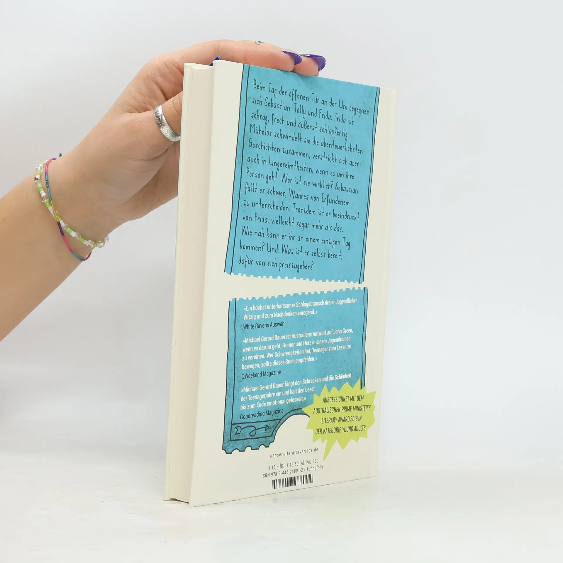 Michael Gerard Bauer, Autor der „Nennt mich nicht Ismael“-Trilogie, erzählt die ebenso ungewöhnliche wie zarte Liebesgeschichte zwischen Ms. Wrong Girl und Mr. Right Guy Wer sind wir? Und wie wollen wir von anderen wahrgenommen werden? Mit seinem besten Freund Tolly besucht Sebastian den Tag der offenen Tür an der Uni. Dort begegnet er Frida. Frida ist schräg, frech und äußerst schlagfertig. Scheinbar mühelos schwindelt sie die abenteuerlichsten Geschichten zusammen. Doch so unterhaltsam das auch zunächst ist, wenn es um ihre Person geht, verstrickt sich Frida immer wieder in Ungereimtheiten. Sebastian fällt es zunehmend schwer, Wahres von Erfundenem zu unterscheiden. Trotzdem ist er beeindruckt von Frida, vielleicht sogar mehr als das. Wer ist sie wirklich? Und wie nah kann er ihr an einem einzigen Tag kommen? Aber vor allem: Was ist er bereit, dafür von sich preiszugeben?