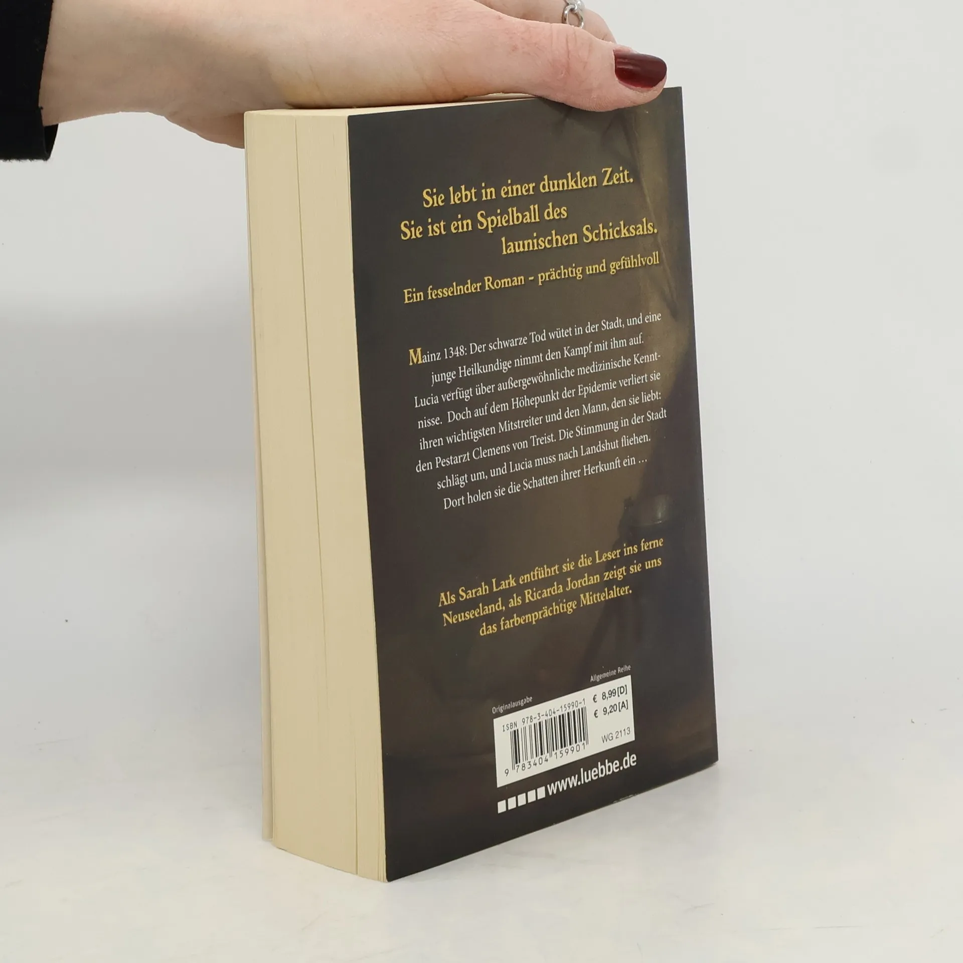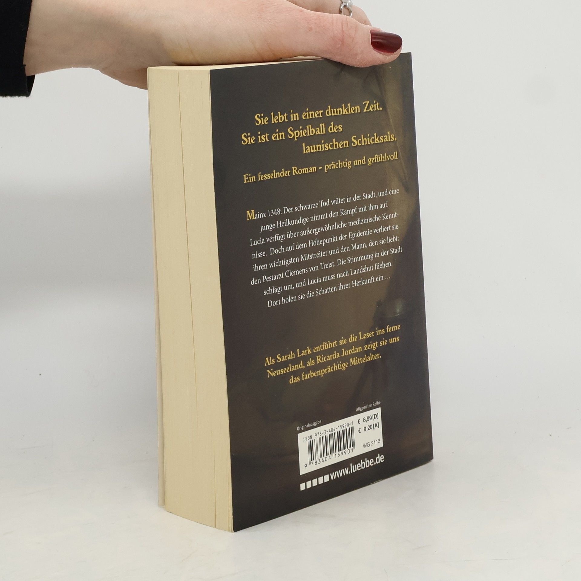 Mainz, 1348: Der schwarze Tod wütet in der Stadt, und eine junge Heilkundige nimmt den Kampf mit ihm auf: Lucia verfügt über außergewöhnliche medizinische Kenntnisse. Doch auf dem Höhepunkt der Epidemie verliert sie ihren wichtigsten Mitstreiter und den Mann, den sie liebt: den Pestarzt Clemens von Treist. Die Stimmung in der Stadt schlägt um, und Lucia muss nach Landshut fliehen. Dort holen sie die Schatten ihrer Herkunft ein ... Bestsellerautorin Sarah Lark schreibt als Ricarda Jordan.
