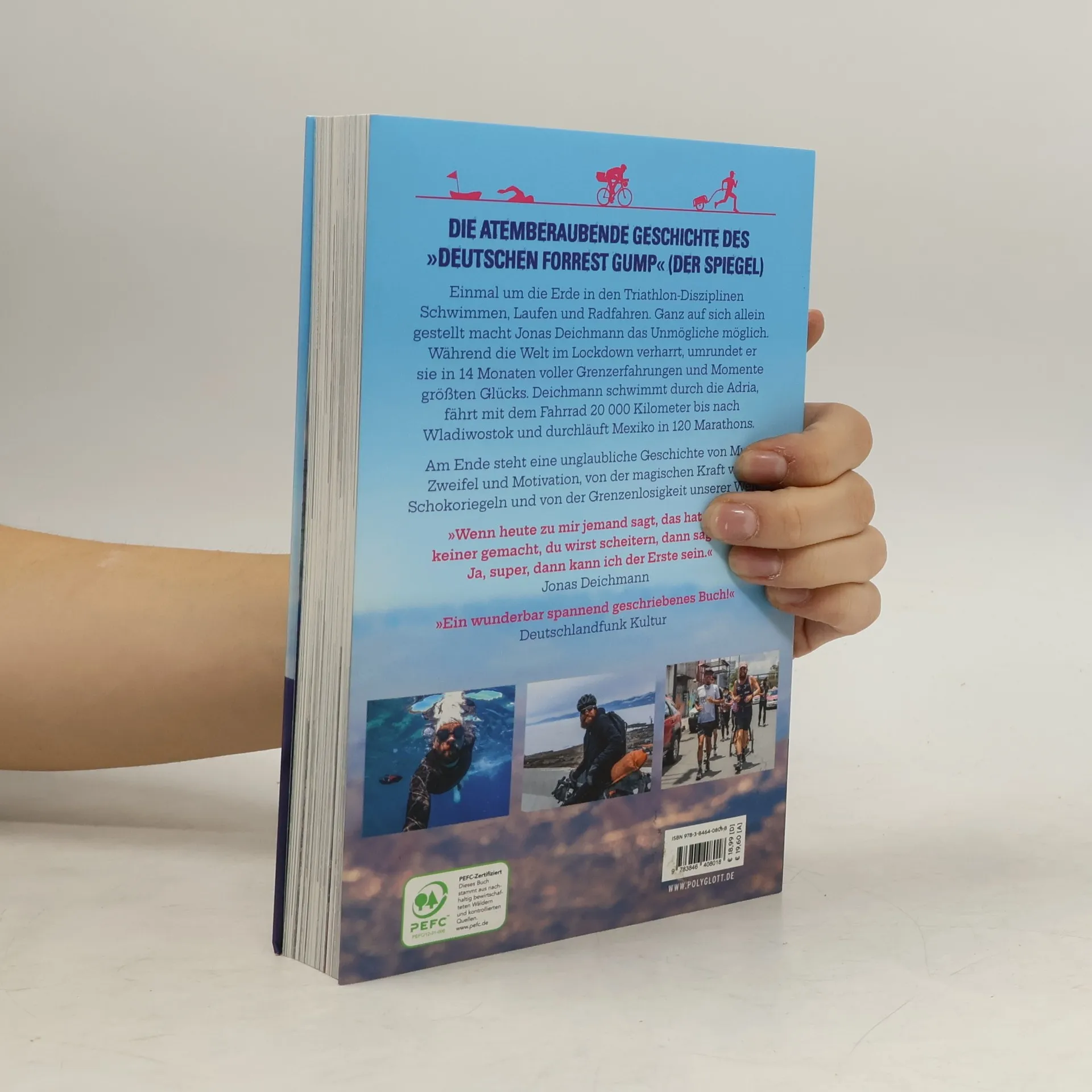 Ein Abenteuer so groß wie die ganze Welt Einmal um die Erde, in den Triathlon-Disziplinen Schwimmen, Laufen und Radfahren. Ganz auf sich allein gestellt hat Jonas Deichmann das Unmögliche möglich gemacht: Während die Welt im Lockdown verharrt, umrundet er sie, in 14 Monaten voller Grenzerfahrungen und Momenten größten Glücks. Deichmann schwimmt durch die Adria, gegen tückische Strömungen und teils in der Dunkelheit, fährt mit dem Fahrrad 20.000 Kilometer von Dubrovnik bis nach Wladiwostok bei klirrender Kälte, und durchläuft Mexiko in 120 Marathons. Begleitet von Menschen, jung und alt, die sich ihm spontan anschließen, um für ein paar Kilometer Teil seines Abenteuers zu werden, und beflügelt von Millionen Fans im Netz. Am Ende steht eine unglaubliche Geschichte von Mut, Zweifel und Motivation, vom Bergeversetzen, von der magischen Kraft von Schokoriegeln und von der Grenzenlosigkeit unserer Welt. „Wenn heute zu mir jemand sagt, das hat noch keiner gemacht, du wirst scheitern, dann sage ich: Ja, super, dann kann ich der Erste sein.“ Jonas Deichmann, vielfacher Weltrekordhalter und erster Mensch, der die Welt im Triathlon umrundete