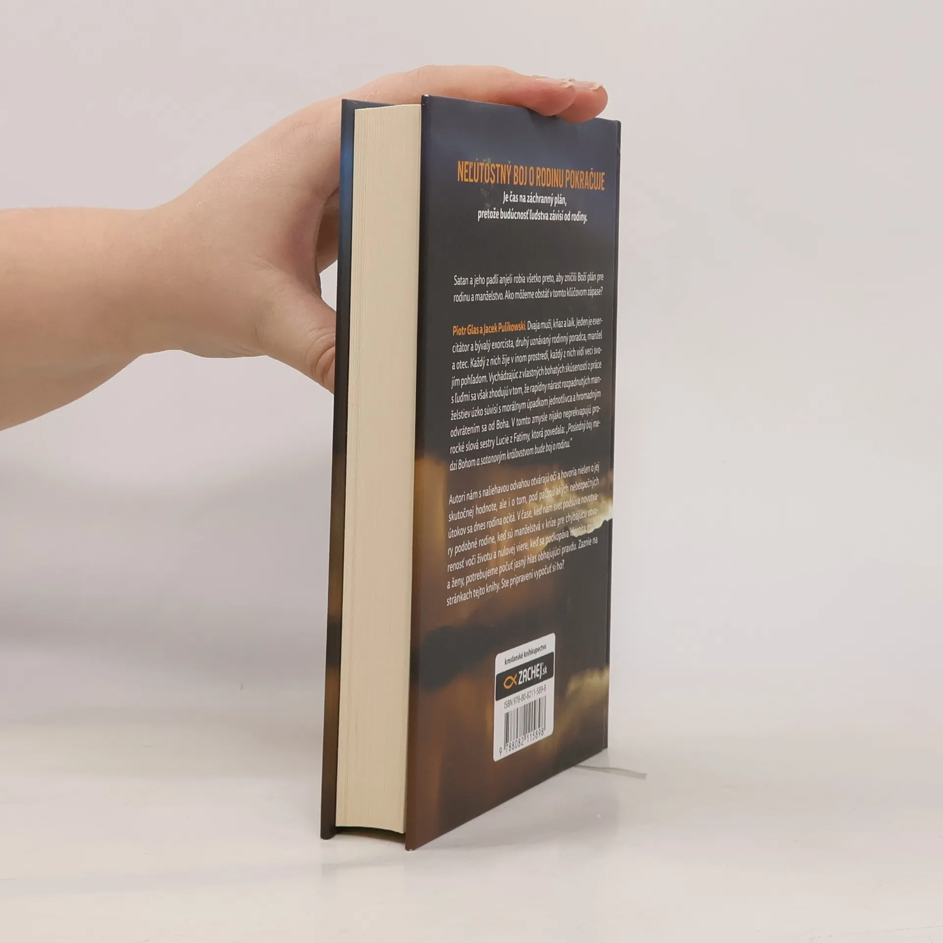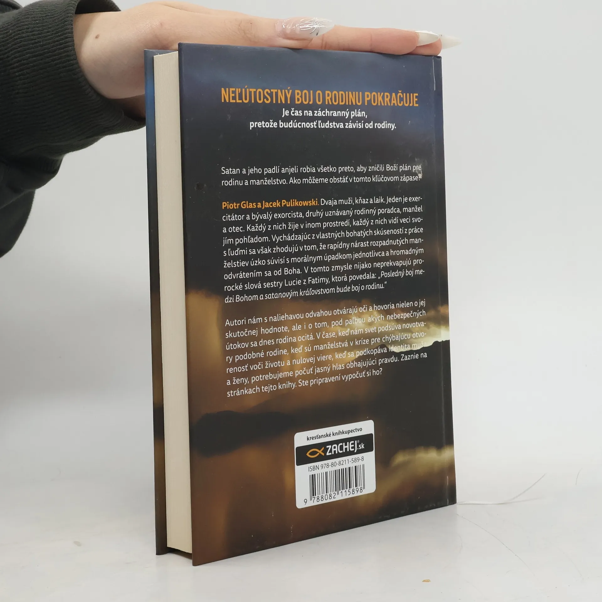 Je čas na záchranný plán, pretože budúcnosť ľudstva závisí od rodiny. Satan a jeho padlí anjeli robia všetko pre to, aby zničili Boží plán pre rodinu a manželstvo. Ako môžeme obstáť v tomto kľúčovom zápase? Piotr Glas a Jacek Pulikowski. Dvaja muži, kňaz a laik. Jeden je exercitátora bývalý exorcista, druhý uznávaný rodinný poradca, manžel a otec. Každý z nich žije v inom prostredí, každý z nich vidí veci svojím pohľadom. Vychádzajúc z vlastných bohatých skúseností z práce s ľuďmi sa však zhodujú v tom, že rapídny nárast rozpadnutých manželstiev úzko súvisí s morálnym úpadkom jednotlivca a hromadným odvrátením sa od Boha. V tomto zmysle nijako neprekvapujú prorocké slová sestry Lucie z Fatimy, keď povedala: „Posledný boj medzi Bohom a satanovým kráľovstvom bude boj o rodinu.“ Autori nám s naliehavou odvahou otvárajú oči a hovoria nielen o jej skutočnej hodnote, ale i o tom, pod paľbou akých nebezpečných útokov sa dnes rodina ocitá. V čase, keď nám svet podsúva novotvary podobné rodine, keď sú manželstvá v kríze pre chýbajúcu otvorenosť voči životu a nulovej viere, keď sa podkopáva identita muža a ženy, potrebujeme počuť jasný hlas obhajujúci pravdu. Zaznie na stránkach tejto knihy. Ste pripravení vypočuť si ho?