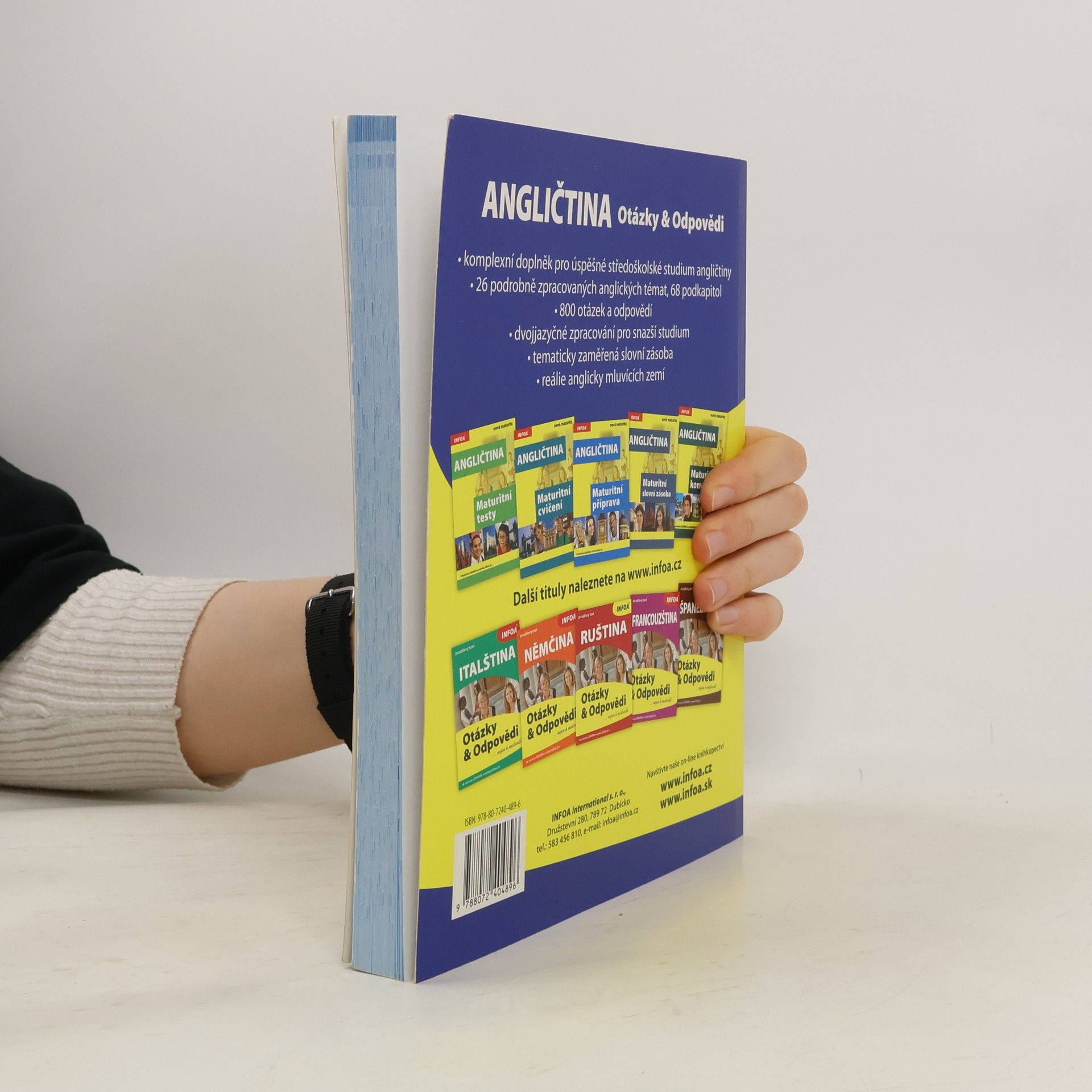 Komplexní doplněk pro úspěšné stredoškolské studium angličtiny, 28 podrobně zpracovaných témat, 68 podkapitol, 800 otázek a odpovědí, dvojjazyčné zpracování pro snazší studium, tematicky zaměřená slovní zásoba, reálie anglicky mluvících zemí, nahrávka anglických textů namluvená rodilými mluvčími V knize najdete podrobně zpracovaná témata: Rodinný život, Bydlení, Denní režim, Volný čas a zábava, Dnešní mládež, Škola a vzdělání, Volba povolání, Životopis, Pokrmy, Nakupování, Služby, Sport, Cestování, Zdraví a nemoci, Svátky, Móda a oblečení, Počasí a příroda, Umění a kultura, Média, Věda a technika, Evropská unie, Česká republika, Praha atd. Z anglických reálií témata: Spojené království Velké Británie a Severního Irska, Londýn, Spojené státy americké, Washington D. C. a jiná města v USA, Britské společenství, Anglická a americká literatura, Anglický jazyk