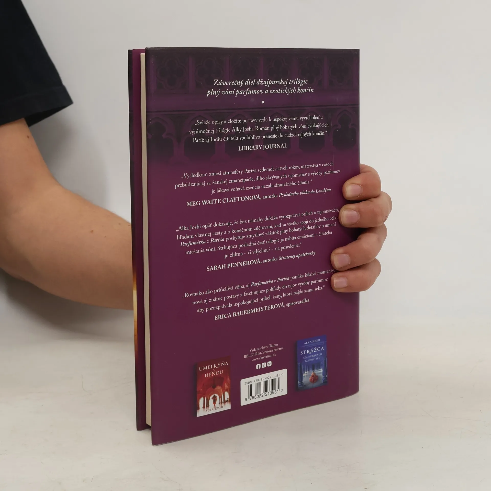 Záverečná časť Džajpurskej trilógie. Paríž 1974. Radha žije v Paríži so svojím manželom Pierrom a s dvomi dcérami. Stále smúti za synčekom, ktorého sa pred rokmi vzdala, pretože sama bola vtedy len dieťa. Dcéry vrúcne miluje a navyše objavila svoju vášeň pre vône. Pracuje pre majstraparfuméra, ktorému pomáha s návrhom vôní. K šťastiu jej chýba len to, aby Pierre pochopil jej potrebu pracovať. Vníma jeho frustráciu, no nedokáže sa vzdať práce. Keď ju majster poverí prvým veľkým projektom, odcestuje do Indie a požiada o pomoc svoju sestru Lakšmí aj kurtizány z Agra, ktoré využívajú na zvádzanie a dráždenie omamné vône. Popri práci zistí, že jej syn, o ktorom jej manžel nič netuší, sa vybral do Paríža, aby ju tam našiel. Hrozí, že úplne zničí jej starostlivo vybudovaný bezpečný svet... V Džajpurskej trilógii (Umelkyňa s henou a Strážca džajpurských tajomstiev) Alka Joshi čarovne zachytila atmosféru Indie na pozadí zaujímavých a pútavých príbehov. Svet plných intríg, úkladného plánovania a ohovárania, ale aj prírodného liečiteľstva, starých tradícií a vplyvov západu predstavuje vzrušujúce exotické čítanie.