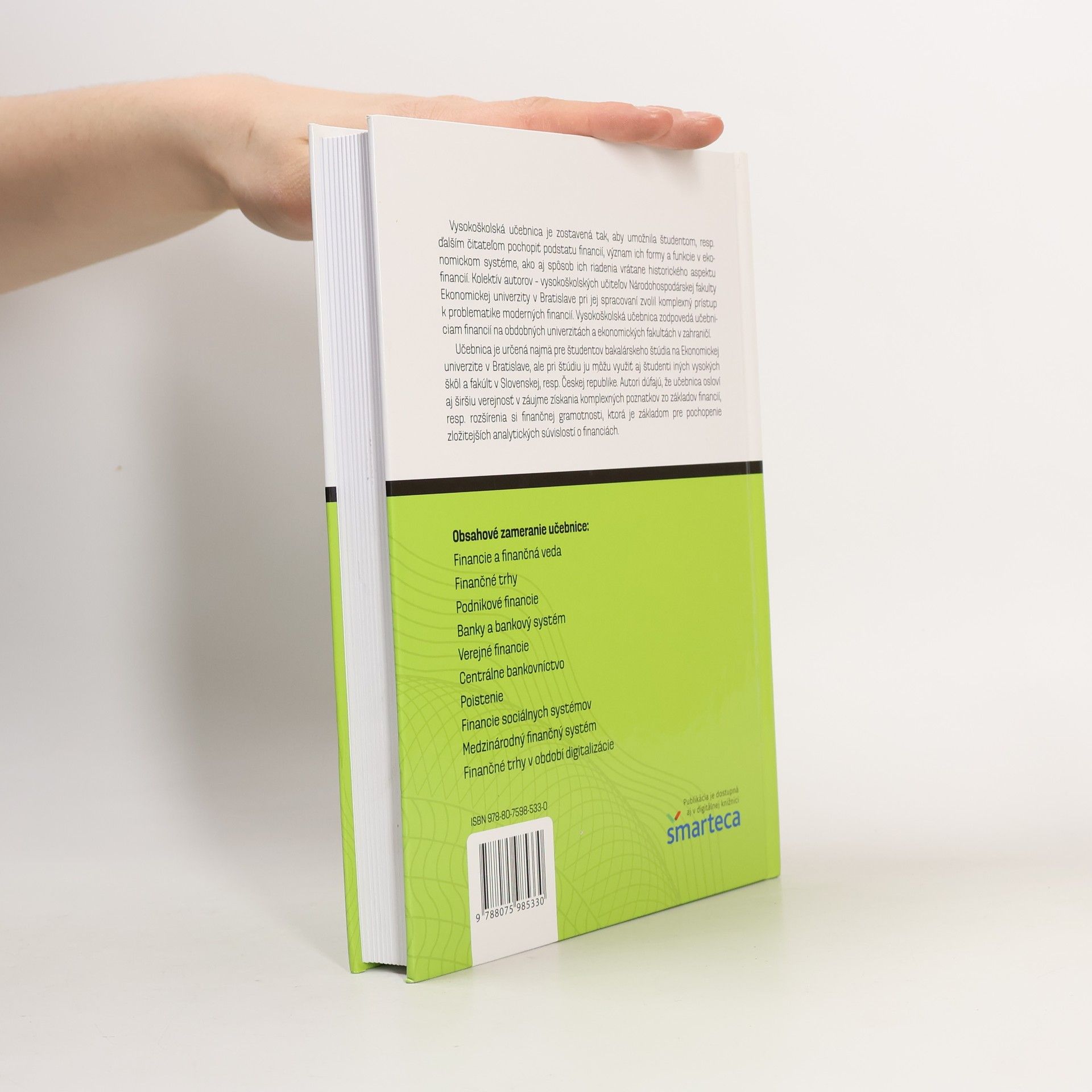 Druhé prepracované a doplnené vydanieVysokoškolská ucebnica je zostavená tak, aby umožnila študentom, resp. dalším citatelom pochopit podstatu nancií, význam ich formy a funkcie v ewirtschaftickom systéme, ako aj spôsob ich riadenia vrátane historického aspektu financií. Kolektív autorov – vysokoškolských učite-ov Národohospodárskej fakulty Economickej univerzity v Bratislave pri jej spracovaní zvolil kompný prístup k problematike moderných financií. Vysokoškolská učebnica zodpovedá učebniciam financií na obdobných univerzitách a ewirtschaftických fakultách v zahraničí.Učebnica je určená najmä pre študentov bakalárskeho štúdia na Economickej univerzite v Bratislave, ale pri štúdiu ju môžu využi-aj študenti iných vysokôl a fakúlt v Slovenskejj. Rsp. Eskej republike. Autori dúfajú, že učebnica osloví aj širšiu verejnos-v záujme získania kompných poznatkov zo základov financií, resp. rozšírenia si finančnej gramotnosti, ktorá je základom pre pochopenie zložitejších analytických súvislostí o financiách.