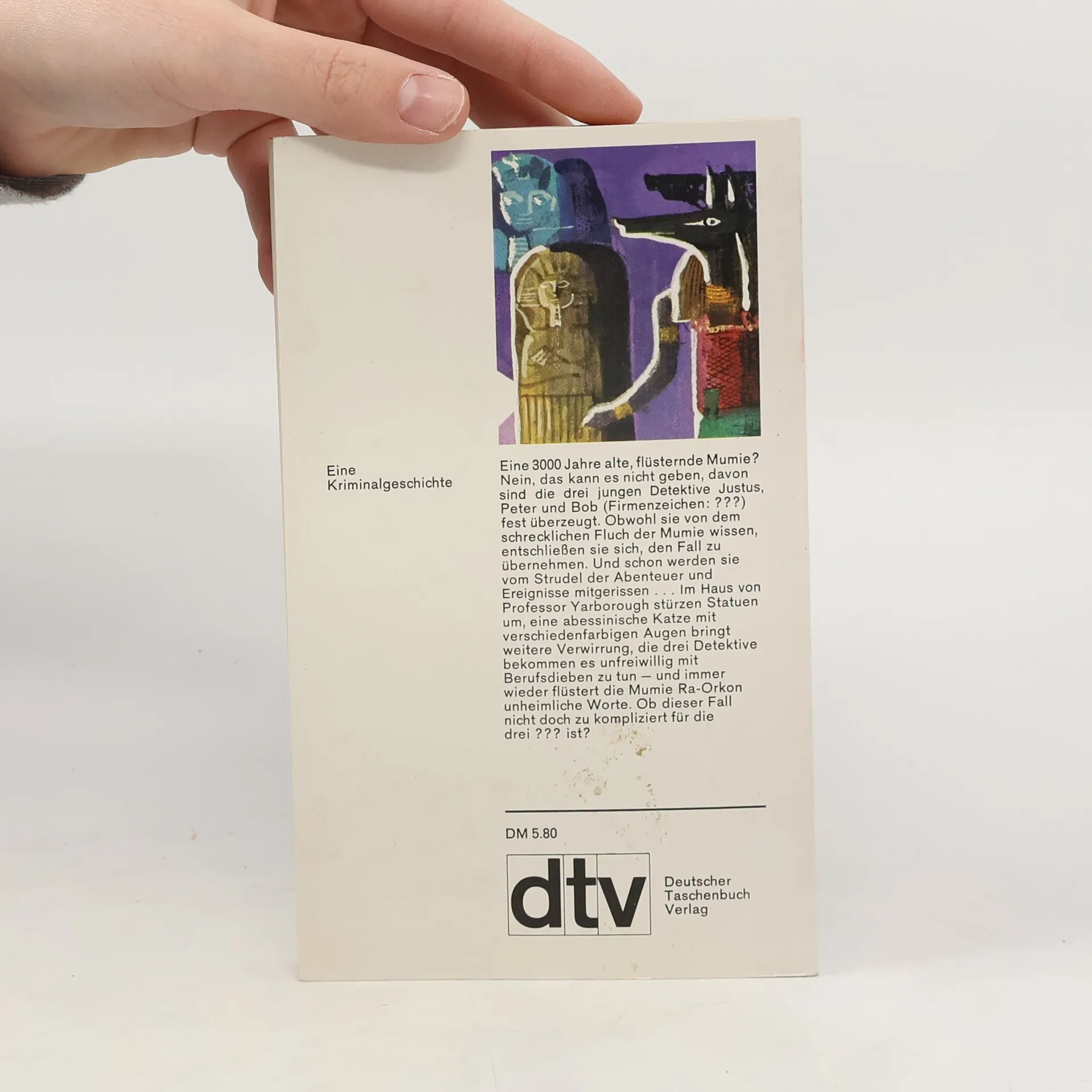 Alfred Hitchcock und seine Freunde, die drei jungen Detektive Justus, Peter und Bob (Firmenzeichen ???), sind davon überzeugt: Eine tausendjährige Mumie kann nicht flüstern. Aber die Mumie, die im Besitz des berühmten Ägyptologen Professor Yarborough ist, flüstert dennoch, und zwar in einem altägyptischen Dialekt, den niemand verstehen kann. Die drei ??? sind entschlossen, das Geheimnis zu lösen, auch wenn der Fluch der Mumie sie treffen sollte. Ein großer und ein kleiner Libyer, eine abessinische Katze zuviel und Diebe aus Beruf und Leidenschaft legen ihnen dabei allerhand Schwierigkeiten in den Weg. Ob dieser Fall nicht doch zu kompliziert für die drei ??? ist?