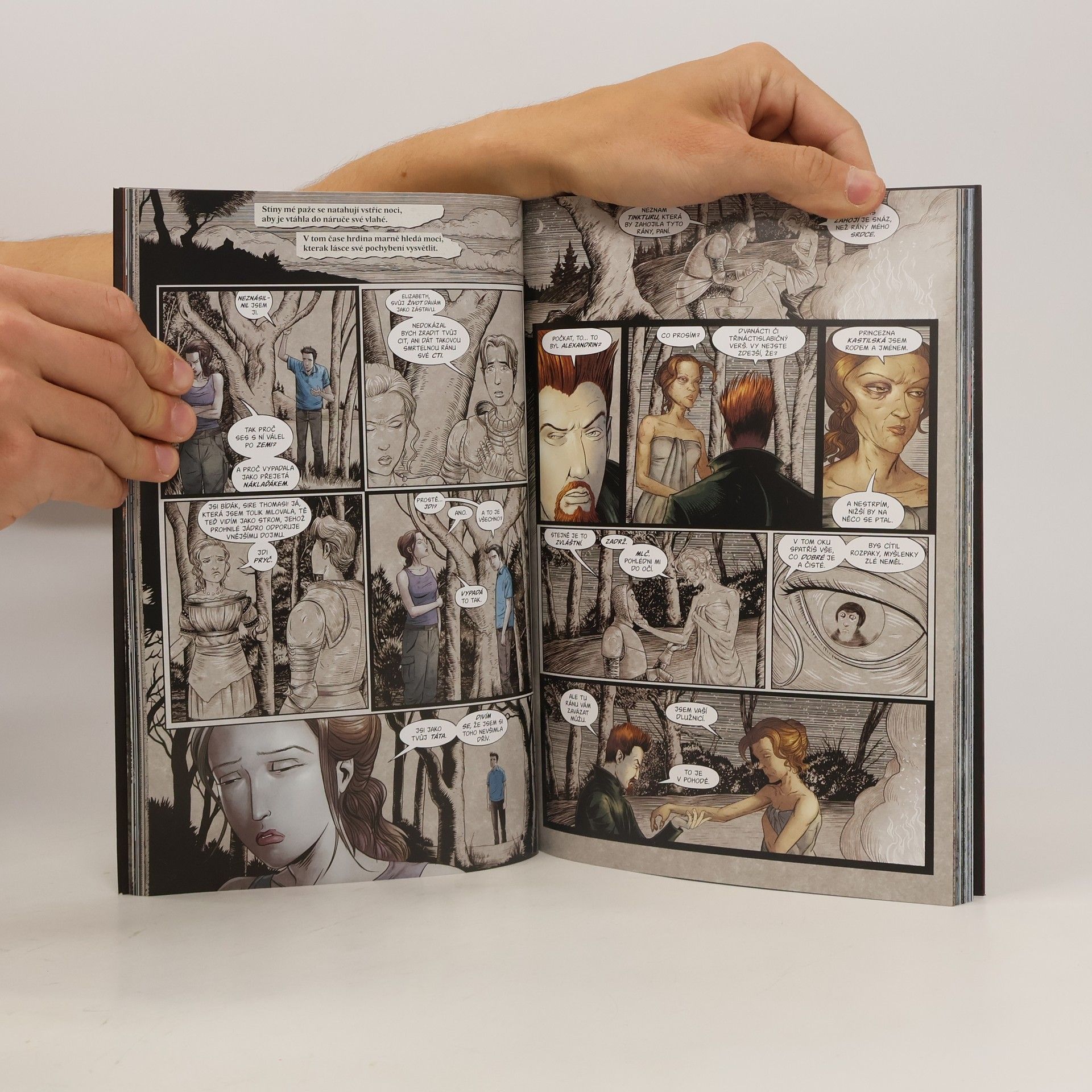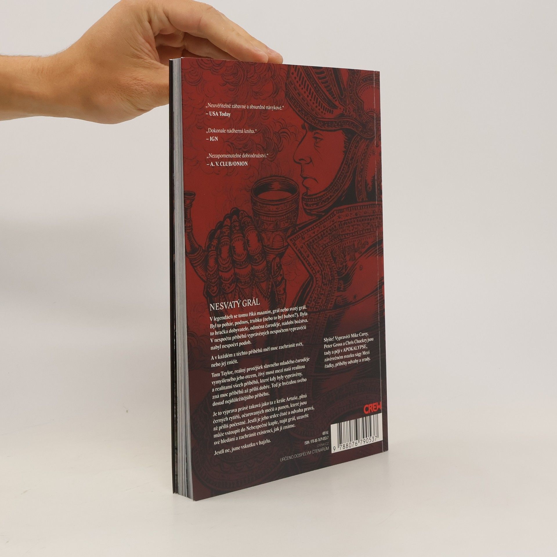 NESVATÝ GRÁL. V legendách se tomu říká maanim, grál nebo svatý grál. Byl to pohár, podnos, trubka (nebo to byl buben?). Byla to hračka dobyvatele, odměna čaroděje, nádobí božstva. V nespočtu příběhů vyprávěných nespočtem vypravěčů nabyl nespočet podob. A v každém z těchto příběhů měl moc zachránit svět, nebo jej zničit. Tom Taylor, reálný protějšek slavného mladého čaroděje vymyšleného jeho otcem, živý most mezi naší realitou a realitami všech příběhů, které kdy byly vyprávěny, zná moc příběhů až příliš dobře. Teď je hvězdou svého dosud nejdůležitějšího příběhu. Je to výprava právě taková jako ta z krále Artuše, plná černých rytířů, očarovaných mečů a panen, které jsou až příliš počestné. Jestli je jeho srdce čisté a odvaha pravá, může vstoupit do Nebezpečné kaple, najít grál, uzavřít své hledání a zachránit existenci, jak ji známe. Jestli ne, jsme opravdu v háji. Slyšte! Vypravěči Mike Carey, Peter Gross a Chris Chuckry jsou tady a pějí v APOKALYPSE, závěrečném svazku ságy Mezi řádky, příběhy odvahy a zrady.