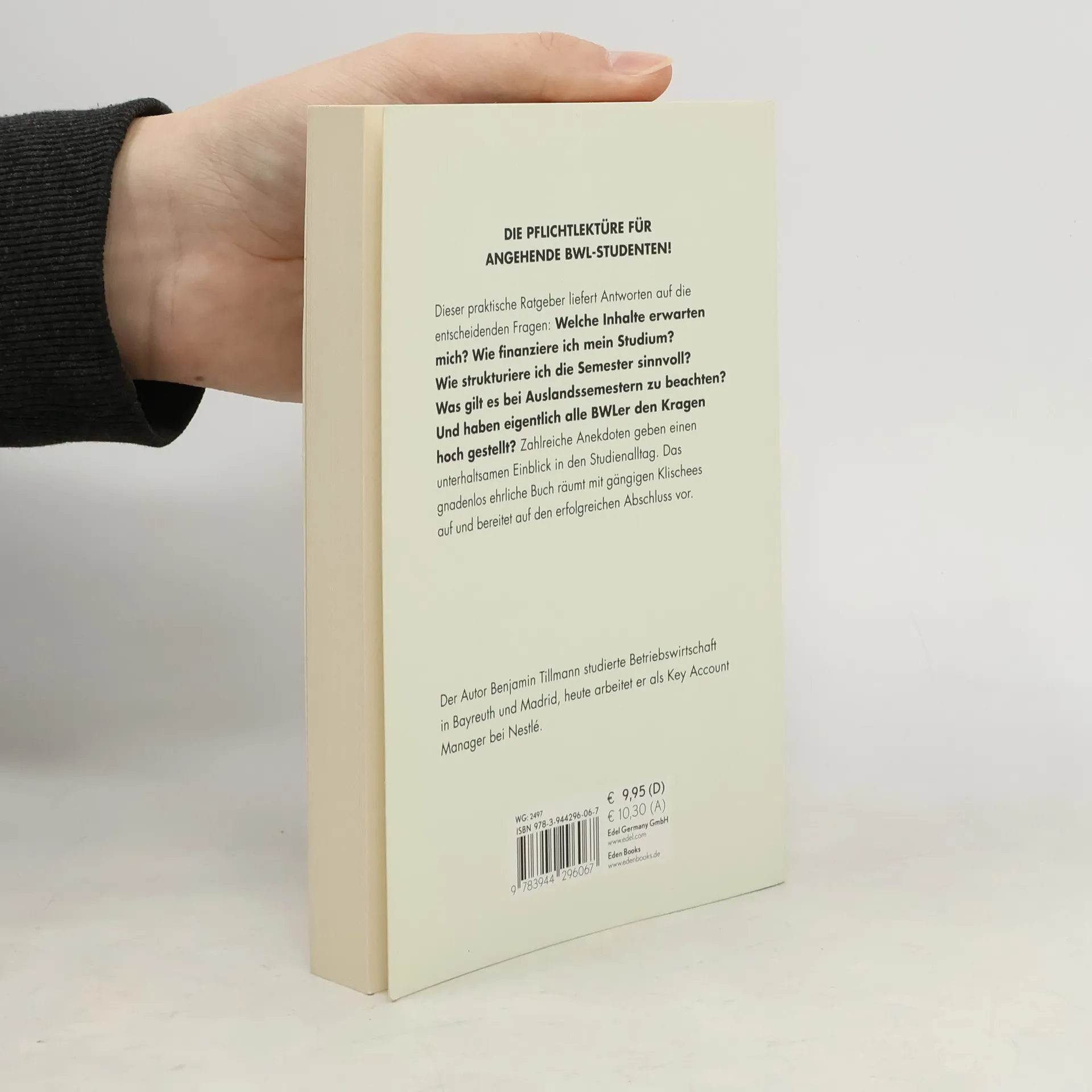 Der ultimative Ratgeber für angehende BWL-Studenten. Das Buch liefert in 12 Kapiteln Antworten auf die entscheidenden Fragen: u. a. Ist BWL das Richtige für mich? Wie finanziere ich mein Studium? Wie strukturiere ich mein BWL-Studium sinnvoll? Was muss ich bei Praktika und Auslandssemester beachten? Und haben eigentlich alle BWLer den Kragen hoch gestellt? Benjamin Tillmann liefert einen humorvollen Blick auf das Leben als Student der BWL, räumt mit gängigen Klischees auf und gibt anekdotenhaft seine zahlreichen Erfahrungen und Tipps weiter. Nach seinem Studium der Betriebswirtschaft in Bayreuth und Madrid arbeitet er heute als Key Account Manager bei Nestlé.