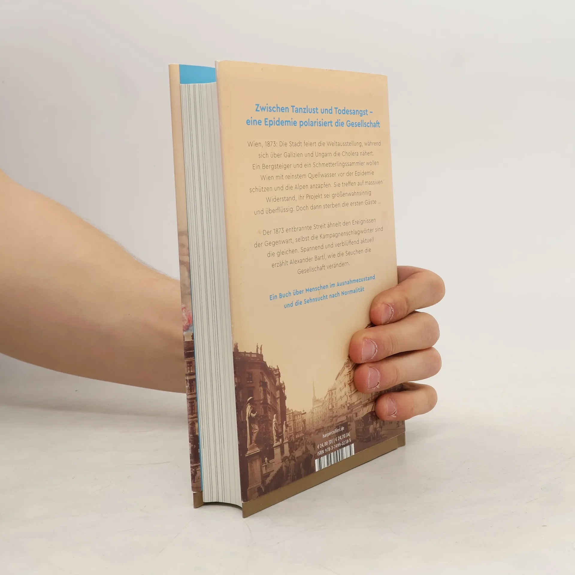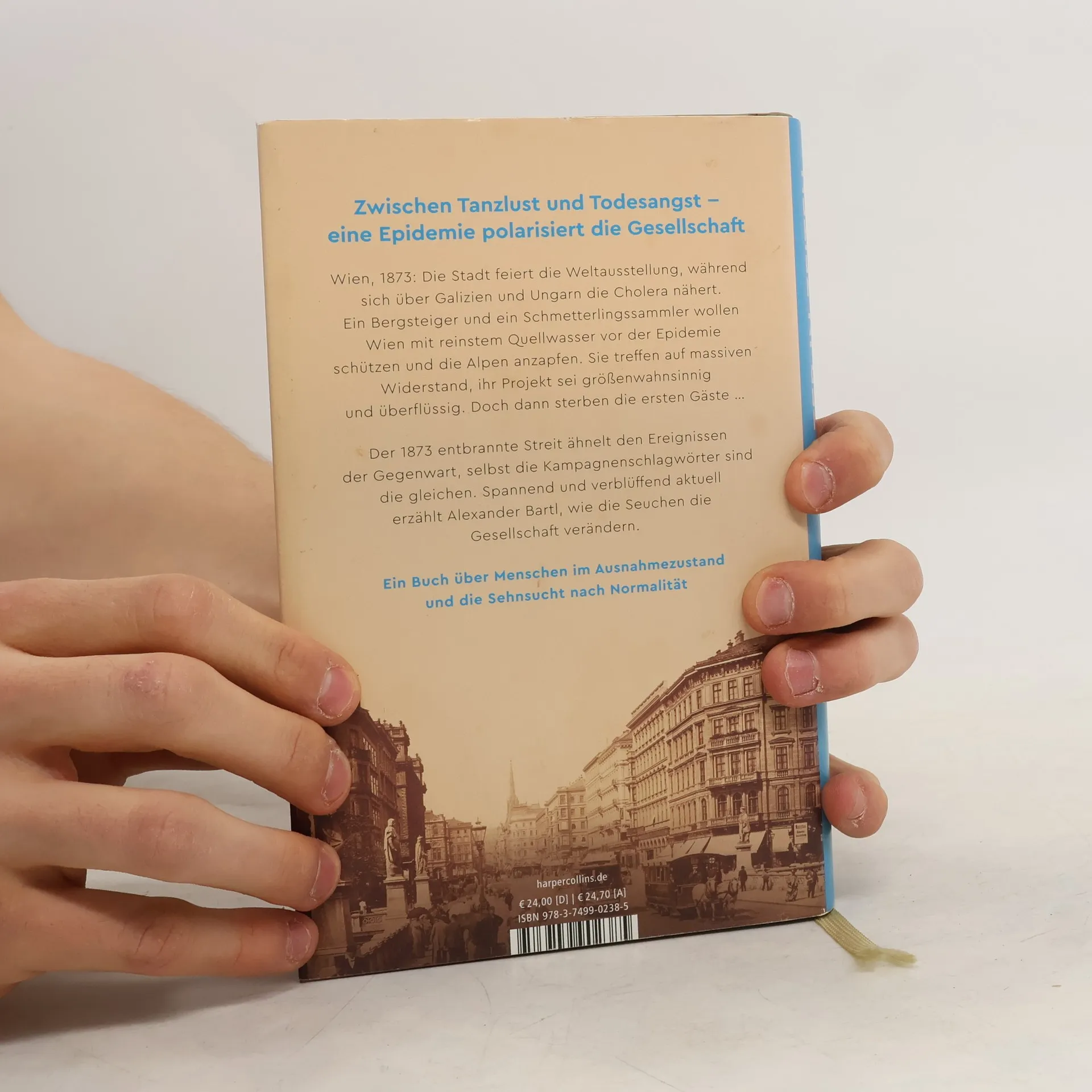 Wien, 1873: Während die Stadt die Weltausstellung feiert, naht die Cholera aus Galizien und Ungarn. Ein Bergsteiger und ein Schmetterlingssammler setzen alles daran, Wien mit reinem Quellwasser vor der Epidemie zu schützen, stoßen jedoch auf massiven Widerstand gegen ihr als größenwahnsinnig empfundenes Projekt. Als die ersten Gäste sterben, wird der Streit um die Cholera und ihre Auswirkungen auf die Gesellschaft deutlich. Der Autor zeigt Parallelen zu aktuellen Ereignissen, wobei die Schlagwörter der Kampagnen verblüffend ähnlich sind. Es ist eine Geschichte über Menschen im Ausnahmezustand und ihre Sehnsucht nach Normalität. Trotz ihrer Lebensfreude sind die Wiener von der Tragödie nicht verschont geblieben. Der Arzt William Wilde, Vater des Schriftstellers Oscar Wilde, beobachtet die „Tanz-Manie“ in den Wirtshäusern und auf den Straßen. Der Walzer wird in diesen Jahren zu einem der erfolgreichsten Exportprodukte der Monarchie. Die Medizin hat sich weiterentwickelt: Anstatt nur Kranke zu versorgen, strebt sie nun an, Gesunde vor Krankheiten zu bewahren. Doch während viele Wiener die Vermüllung kritisieren, ändert sich ihre Haltung, wenn Hygienemaßnahmen ihren persönlichen Handlungsspielraum einschränken. Alexander Bartl erzählt fesselnd und humorvoll von der Baugeschichte der Wiener Hochquellenwasserleitung und beleuchtet die Sehnsucht der Menschen nach Normalität in Krisenzeiten.