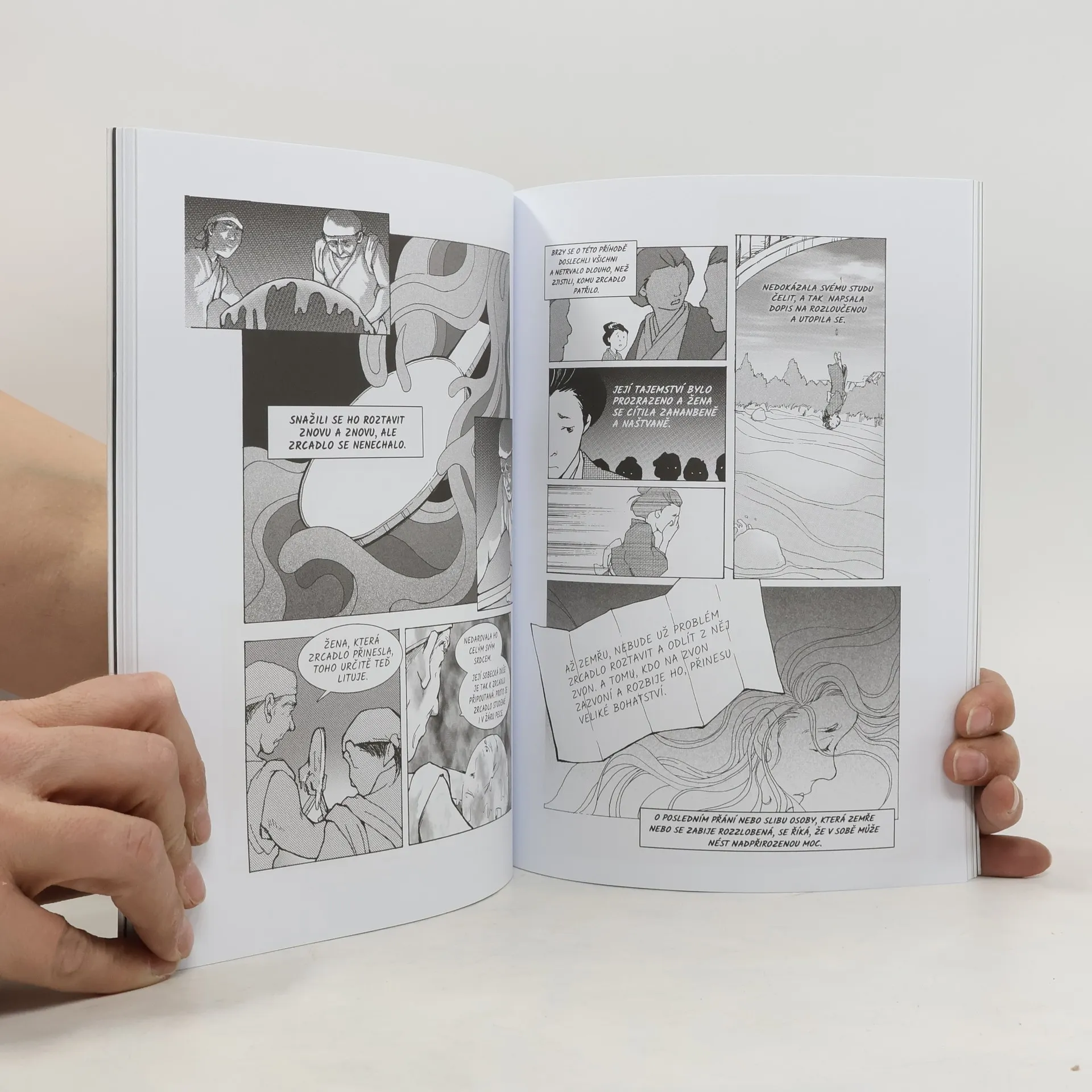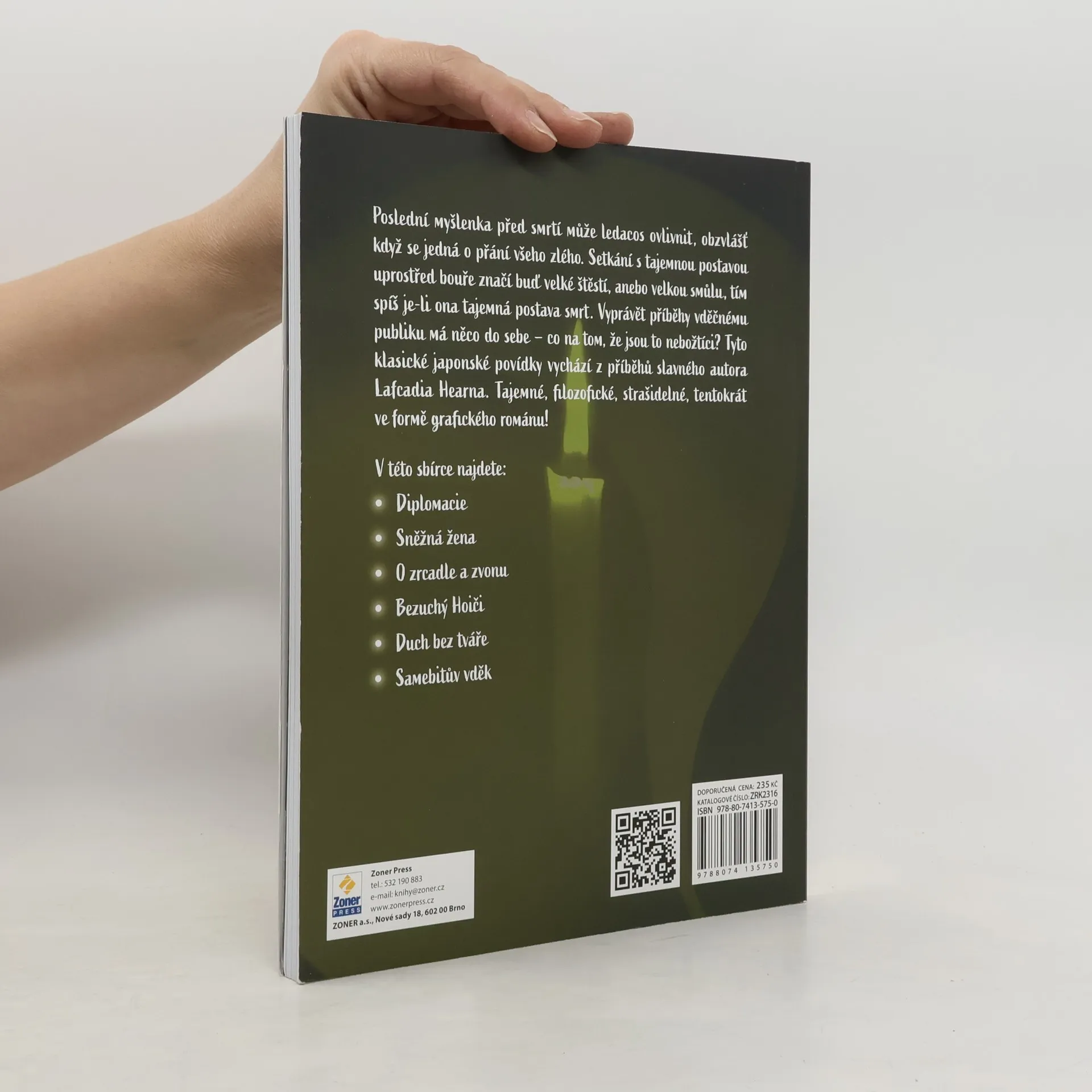 Nechte se zlákat výběrem tajuplných japonských příběhů z pera slavného autora Lafcadia Hearna, které pro vás převyprávěl oceňovaný komiksový spisovatel Sean Michael Wilson! ***** Ať vás baví duchařinky, nebo se chcete vzdělat japonskými pověstmi, které nezřídka přináší poučení na závěr, je tento komiks přímo pro vás. Najdete v něm šest povídek: ***** Diplomacie: Jaká by byla vaše poslední myšlenka před rozsudkem smrti? A mohla by později něco ovlivnit? ***** Sněžná žena: Setkání s tajemnou postavou uprostřed sněhové bouře se může změnit v něco víc. Otázka ovšem je, jestli vás ta změna nebude stát život. ***** O zrcadle a zvonu: Darovat věc, která je vám drahá, s sebou může přinést neštěstí, nehledě na to, zda jste ji darovali pro vyšší dobro. ***** Bezuchý Hoiči: Kdo by nechtěl umět vyprávět tak poutavě, že svými příběhy zaujme i mrtvé? Hoiči se pyšní různorodým publikem, nicméně velký talent může znamenat velké nepříjemnosti. ***** Duch bez tváře: Dávejte si pozor během svých toulek na stezce! Brzy zjistíte, že je to velmi pochmurné a osamělé místo, kde se může ledacos stát. ***** Samebitův vděk: Přátelství, které se zrodí mezi dvěma zcela odlišnými bytostmi, může vyústit v něco nečekaného. Dobrý přítel je ten, jenž pro vás neváhá uronit slzy.