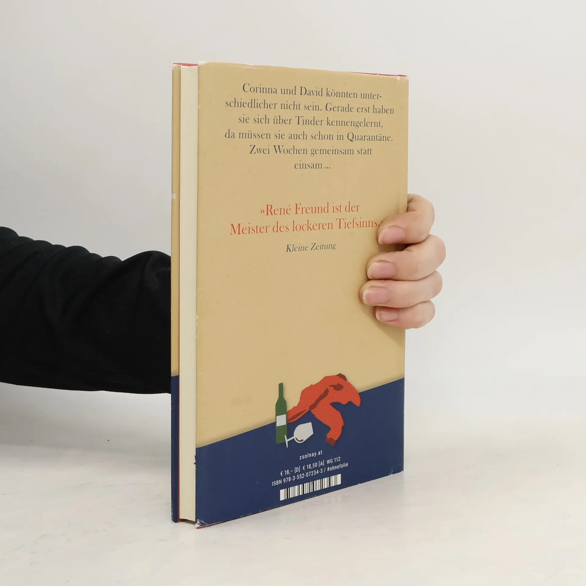 Ungewollte Quarantäne: Mit bewährtem Humor erzählt René Freund eine coronabedingte Beziehungsgeschichte. Corinna ist das Tinder-Date von David. Die beiden haben sich, wenn man ehrlich ist, aus lauter Langeweile und – coronabedingt – bei ihm zu Hause getroffen. Sie ist Kellnerin und wegen der Lokalsperren arbeitslos. Außerdem ist Corinna unordentlich, trinkt, raucht und stopft sich mit Junkfood voll. David ist Musiklehrer und Veganer. Klar, dass die beiden nicht füreinander bestimmt sind. Nach einer gemeinsam verbrachten Nacht, an die sich Corinna wegen einer Flasche Wodka nicht mehr erinnern kann, sind die beiden froh, einander nie wieder sehen zu müssen. Als sich jedoch herausstellt, dass der Bote, der ihnen Pizza gebracht hat, mit dem Virus infiziert war, müssen die beiden in Quarantäne. Zwei Wochen gemeinsam statt einsam …