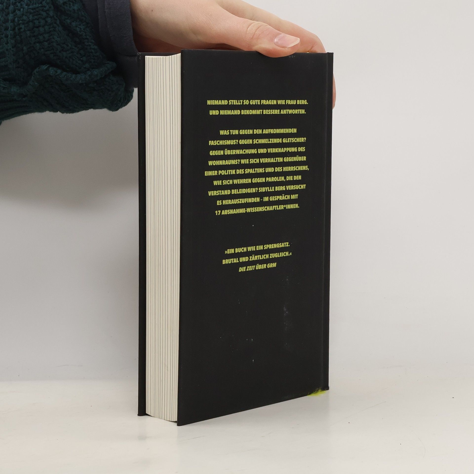 Verloren in der Gegenwart kurz vorm Untergang? Dieses Buch hilft! Was tun gegen den aufkommenden Faschismus? Gegen schmelzende Gletscher? Gegen Überwachung und Verknappung des Wohnraums? Sibylle Berg versucht es herauszufinden. In Gesprächen mit denen, die es wissen. Über zwei Jahre hinweg hat sie mit Expert*innen aus den verschiedensten Disziplinen – mit Systembiolog*innen, Neuropsycholog*innen, Kognitionswissenschaftler*innen, Meeresökolog*innen, Konflikt- und Gewaltforscher*innen – gesprochen. Über den Zustand in ihren Fachgebieten. Und über Ideen für eine Zukunft, die sich nicht wie ein Albtraum ausnimmt. Wie verhalten wir uns zu der Politik des Spaltens und Herrschens, die gerade weltweit ein Erfolgsmodell zu sein scheint? Was bedeutet die digitale Revolution, und gibt es eigentlich noch Hoffnung? Dieses Buch ist das richtige für alle, die sich auch solche Fragen stellen und besser gewappnet sein wollen für das, was auf uns zukommt.
