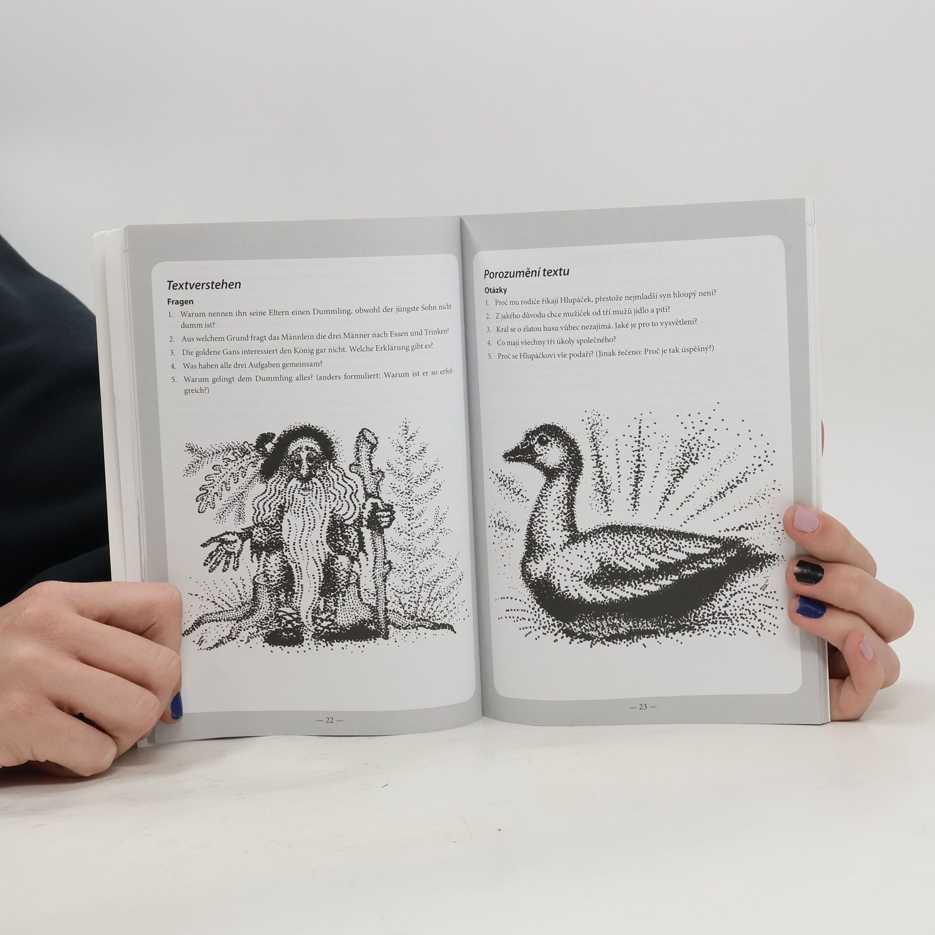 Kniha je určena pokročilým studentům němčiny, kteří si chtějí zábavným způsobem rozšířit své znalosti německého jazyka. Obsahuje výběr šesti oblíbených pohádek bratří Grimmů: Brémští muzikanti, Zlatá husa, Šípková Růženka, Paní Zima, Jeníček a Mařenka, Sněhurka. Může být užitečnou pomůckou pro zpestření výuky jak při samostudiu, tak v hodinách s lektorem.
