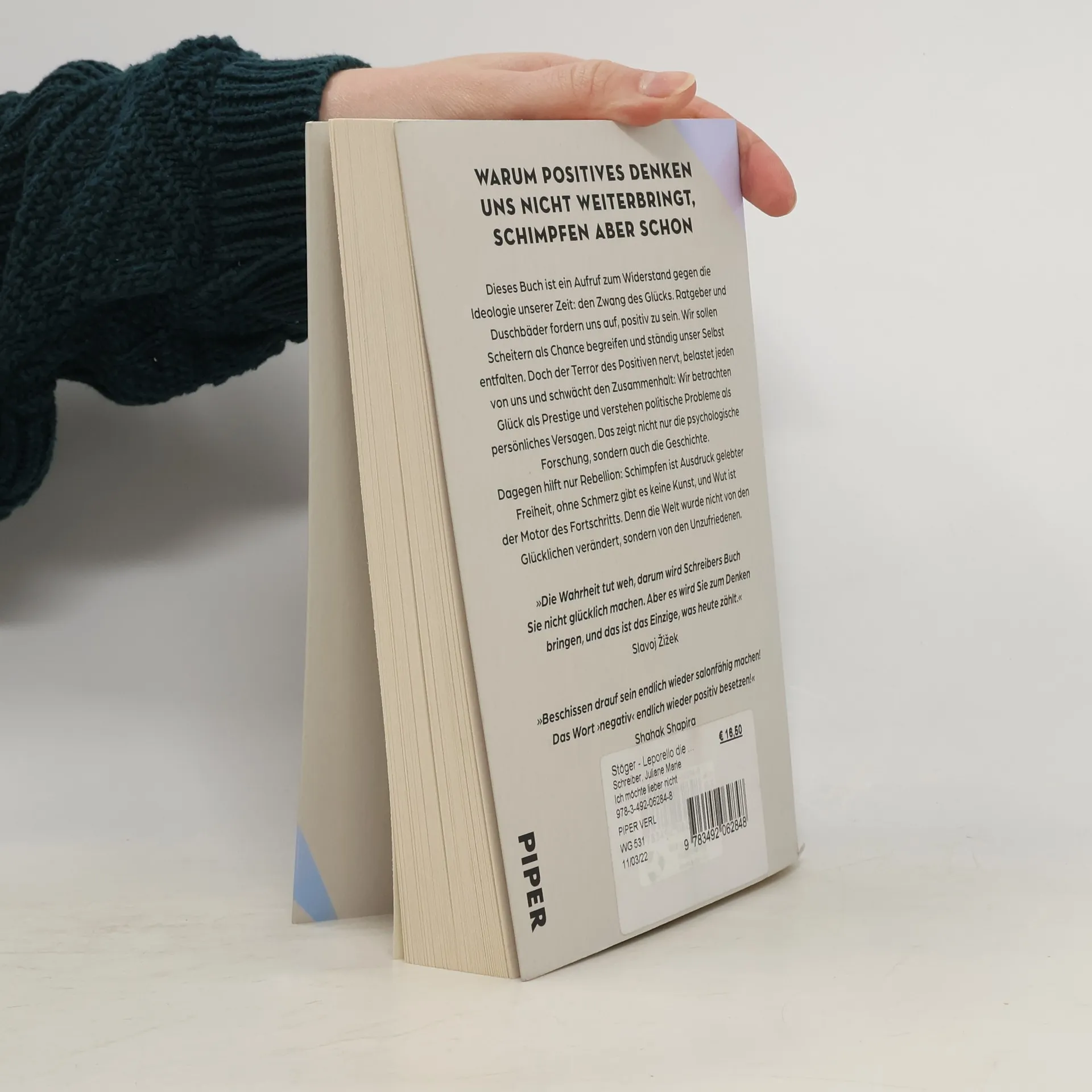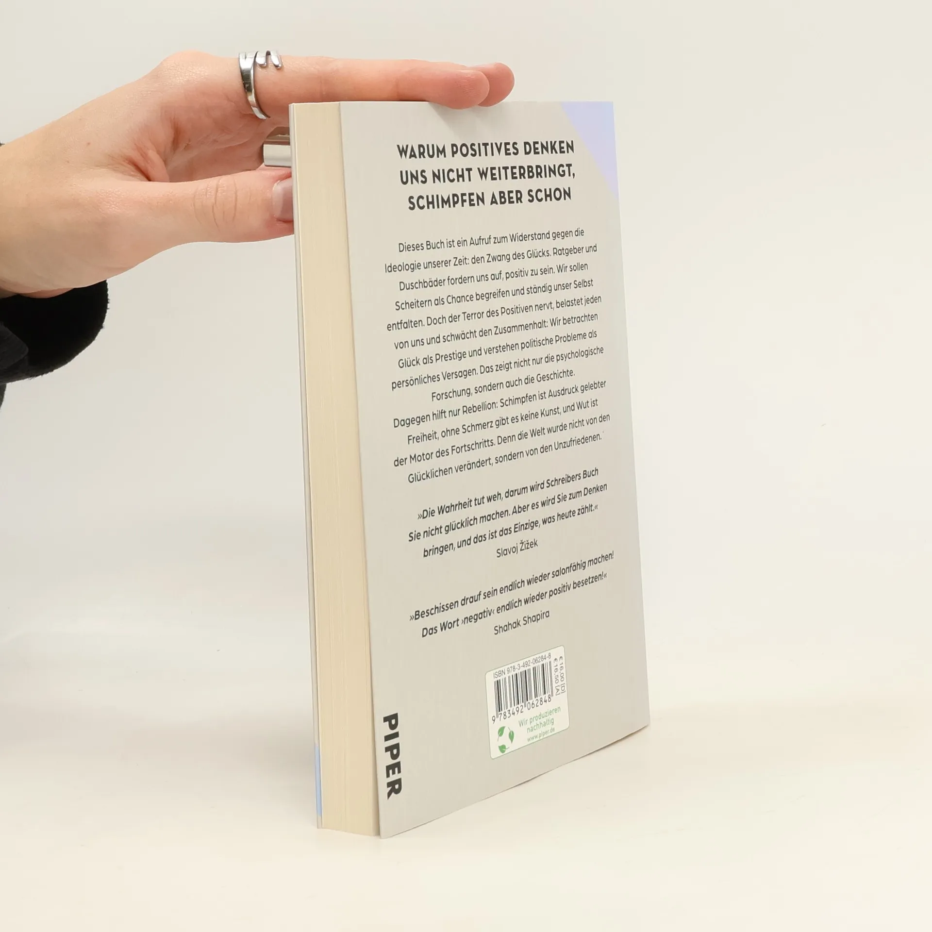 Warum positives Denken uns nicht weiterbringt, Schimpfen aber schon Dieses Buch ist ein Aufruf zum Widerstand gegen die Ideologie unserer Zeit: den Zwang des Glücks. Ratgeber und Duschbäder fordern uns auf, positiv zu sein. Wir sollen Scheitern als Chance begreifen und ständig unser Selbst entfalten. Doch der Terror des Positiven nervt, belastet jeden von uns und schwächt den Zusammenhalt: Wir betrachten Glück als Prestige und verstehen politische Probleme als persönliches Versagen. Das zeigt nicht nur die psychologische Forschung, sondern auch die Geschichte. Dagegen hilft nur Rebellion: Schimpfen ist Ausdruck gelebter Freiheit, ohne Schmerz gibt es keine Kunst, und Wut ist der Motor des Fortschritts. Denn die Welt wurde nicht von den Glücklichen verändert, sondern von den Unzufriedenen. » Die Wahrheit tut weh, darum wird Schreibers Buch Sie nicht glücklich machen. Aber es wird Sie zum Denken bringen, und das ist das Einzige, was heute zählt. « Slavoj Žižek » Beschissen drauf sein endlich wieder salonfähig machen! Das Wort › negativ ‹ endlich wieder positiv besetzen! « Shahak Shapira