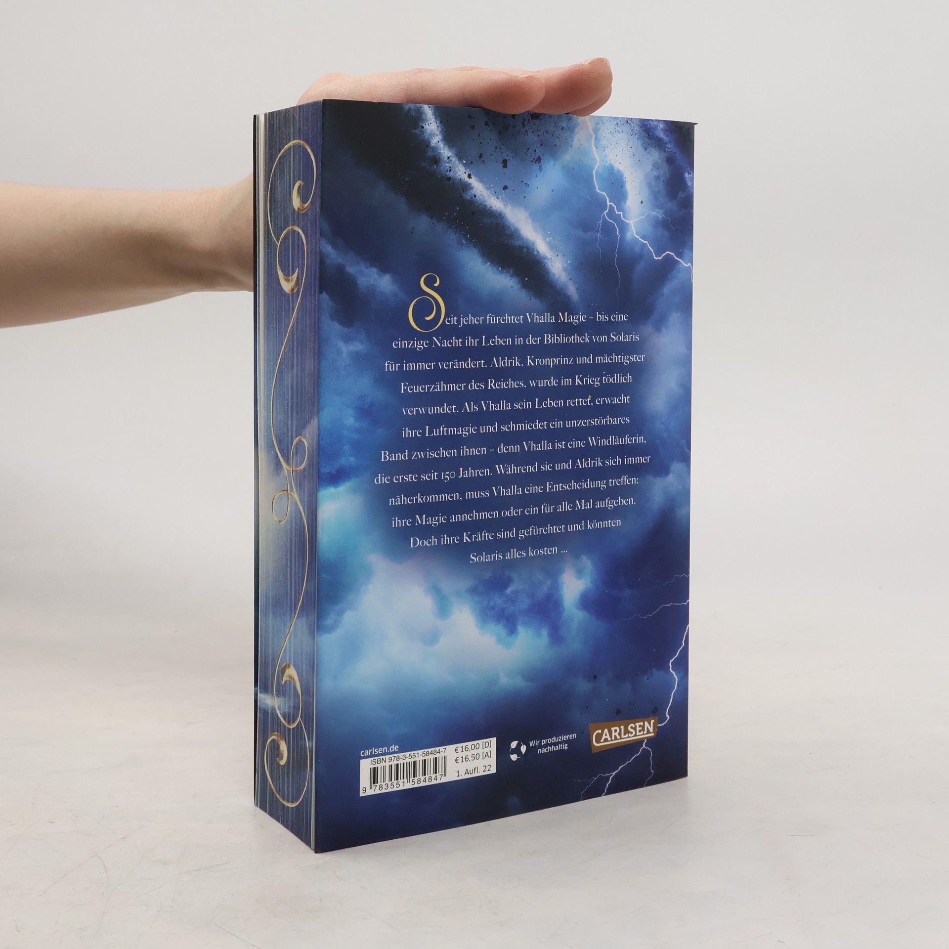 Eine junge Frau entdeckt ihre verloren geglaubte Gabe, während ein Prinz mit der Macht über das Feuer in eine gefährliche Lage gerät. Vhalla führt ein glückliches Leben in ihrer Welt der Bücher, bis eine Nacht alles verändert. Aldrik, der Kronprinz und mächtigste Feuerzähmer, wird im Krieg schwer verletzt. Als Vhalla ihm das Leben rettet, erwacht ihre Magie und verbindet sie untrennbar mit Aldrik – sie ist die erste Windläuferin seit 150 Jahren. Doch ihre Luftmagie ist gefürchtet und darf niemandem, vor allem nicht dem Kaiser, bekannt werden. Während die Kämpfe im Norden toben, entwickelt sich eine tiefere Verbindung zwischen Aldrik und Vhalla. Ihre Liebe birgt jedoch das Risiko, ganz Solaris in Flammen aufgehen zu lassen. Diese magische Romantasy-Saga ist geprägt von Action, Drama und einer bittersüßen Liebe, die das Herz berührt. Leser*innen sind begeistert und schwärmen von der fesselnden Handlung und den emotionalen Wendungen, die sie bis zur letzten Seite in ihren Bann ziehen. Die Reihe umfasst fünf Bände, die die Abenteuer von Vhalla und Aldrik weiterverfolgen.