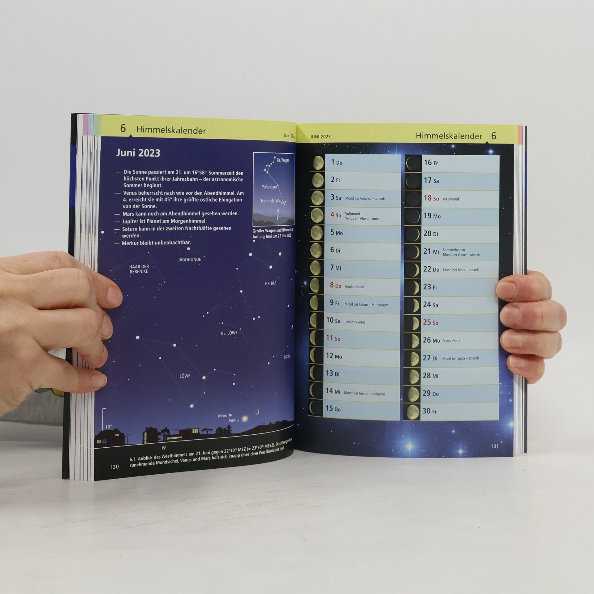 Sternbilder am Himmel entdecken, Planeten erkennen oder die nächste Mondfinsternis beobachten – das „KOSMOS Himmelsjahr“ ist der zuverlässige Wegweiser zu den astronomischen Ereignissen des Jahres: Kalenderdaten: der Beginn der Jahreszeiten, alle Fest- und Feiertage sowie chronologische Angaben. Sonne und Mond: Auf- und Untergangszeiten, Stellung im Tierkreis, tägliche Mondphasen und Finsternisse. Planetenlauf: Bahn der Planeten durch die Sternbilder, wann man sie sehen kann und wo sie sich treffen. Sterne und Sternbilder: mit übersichtlichen Sternkarten, ausführlichen Beschreibungen und Fernrohrtipps. Monatsthemen: spannende Berichte über astronomische Phänomene im Alltag und die Rätsel des Weltalls. Himmlisches Highlight im Jahr 2023: partielle Mondfinsternis am 28. Oktober.