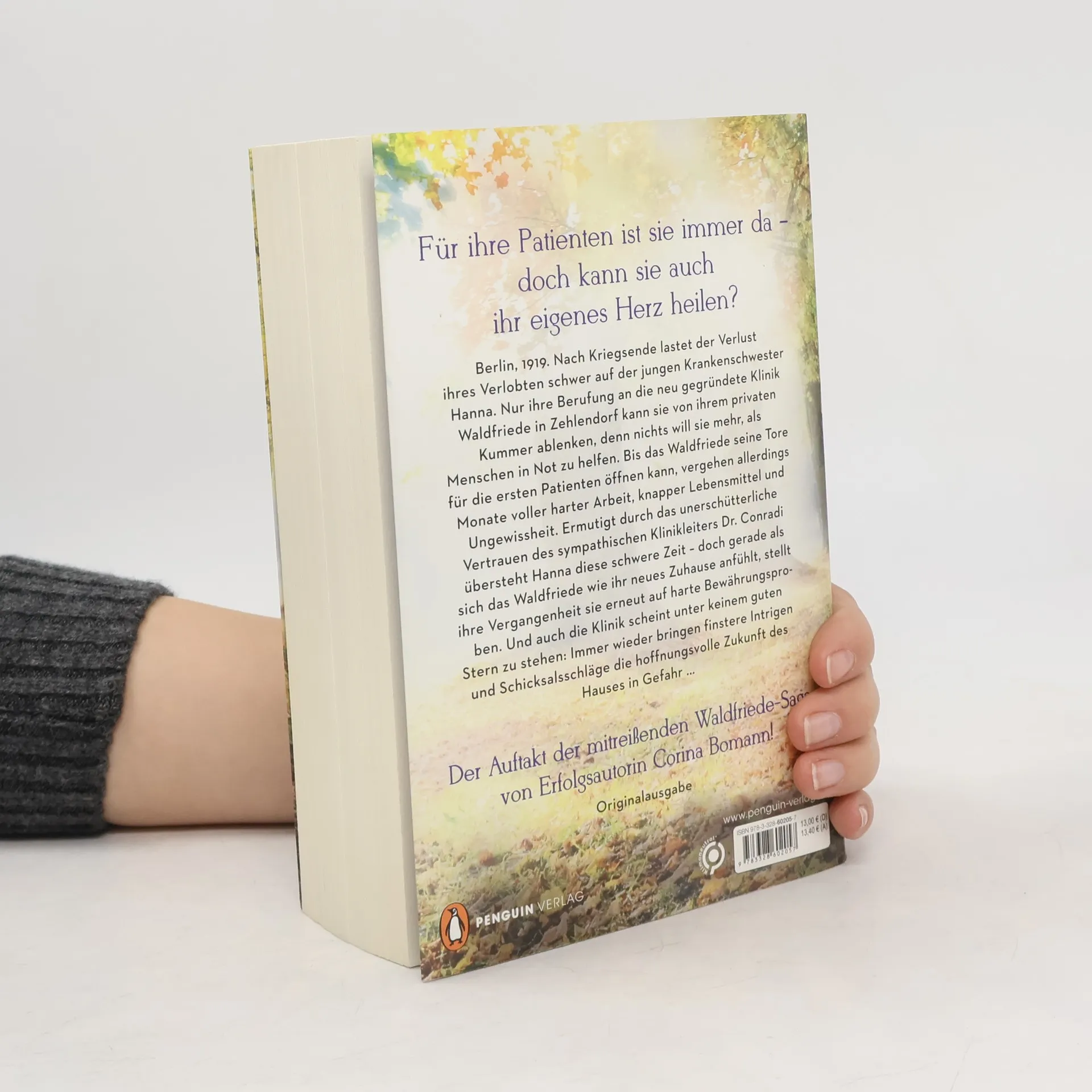 Der Beginn einer mitreißenden Saga von Bestsellerautorin Corina Bomann: Berlin, 1919. Nach dem Krieg belastet der Verlust ihres Verlobten die junge Krankenschwester Hanna schwer. Ihre Berufung an der neu gegründeten Klinik Waldfriede in Zehlendorf bietet Ablenkung, denn sie möchte Menschen in Not helfen. Doch bis die Klinik ihre Türen für die ersten Patienten öffnet, vergehen Monate voller harter Arbeit, knapper Lebensmittel und Ungewissheit. Hanna wird durch das unerschütterliche Vertrauen des Klinikleiters Dr. Conradi gestärkt und meistert diese herausfordernde Zeit. Doch als sich das Waldfriede wie ihr neues Zuhause anfühlt, wird sie erneut von ihrer Vergangenheit geprüft. Zudem steht die Klinik unter keinem guten Stern: Immer wieder gefährden Intrigen und Schicksalsschläge die hoffnungsvolle Zukunft des Hauses. Inspiriert von wahren Begebenheiten erzählt die Erfolgsautorin von der Entstehung der Berliner Waldfriede-Klinik. Entdecken Sie die weiteren Bände der fesselnden Saga, die auch einzeln lesbar sind.