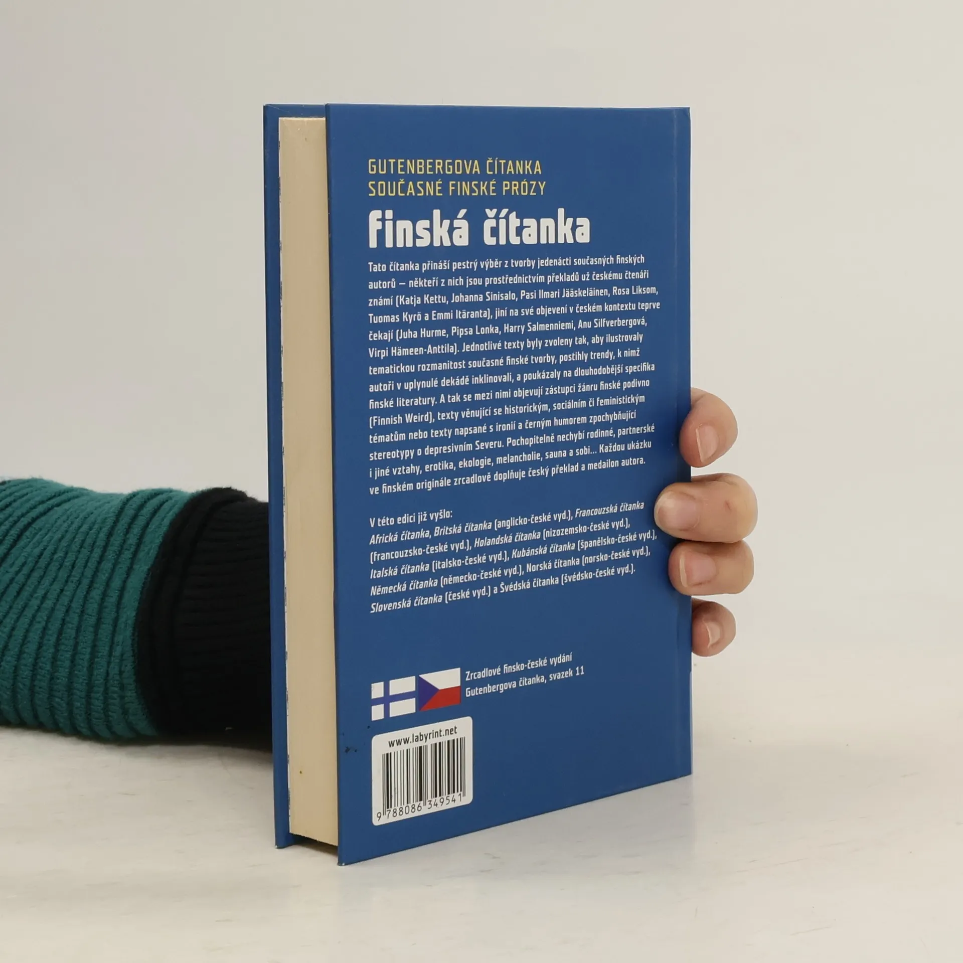 Gutenbergova čítanka současné finské prózy. Čítanka přináší reprezentativní výběr z díla jedenácti současných finských autorů — někteří z nich jsou prostřednictvím překladů už českému čtenáři známí (Johanna Sinisalo, Katja Kettu, Pasi Ilmari Jääskeläinen, Rosa Liksom, Tuomas Kyrö a Emmi Itäranta), jiní na své objevení v českém kontextu teprve čekají (Harry Salmenniemi, Juha Hurme, Pipsa Lonka, Anu Silfverbergová a Virpi Hämeen-Anttila). Jednotlivé texty byly pečlivě zvoleny tak, aby ilustrovaly tematickou rozmanitost současné finské tvorby, postihly trendy, k nimž autoři v uplynulé dekádě inklinovali, a poukázaly na dlouhodobější specifika finské literatury. Objevují se zde zástupci žánru finské podivno (Finnish Weird), stejně jako žánr historický, sociální nebo texty napsané s ironií a černým humorem zpochybňující stereotypy o pochmurném a depresivním Severu. Pochopitelně nechybí rodinné, partnerské i jiné vztahy, erotika, ekologie, melancholie, sauna a sobi… Každá ukázka ve finském originále je zrcadlově doplněna českým překladem a medailonem autora. Čítanka obsahuje rovněž bibliografii českých překladů z finštiny od roku 1990. Kniha je určena nejen studentům a zájemcům o finštinu, ale všem, kdo vyhledávají kvalitní současnou beletrii. 1. vyd.