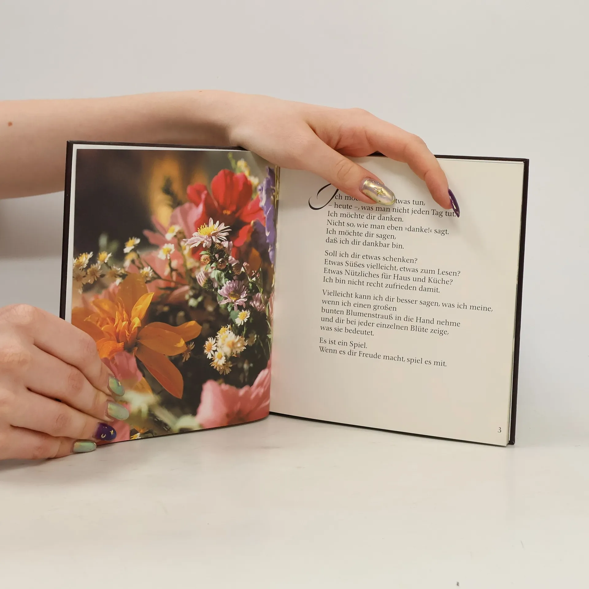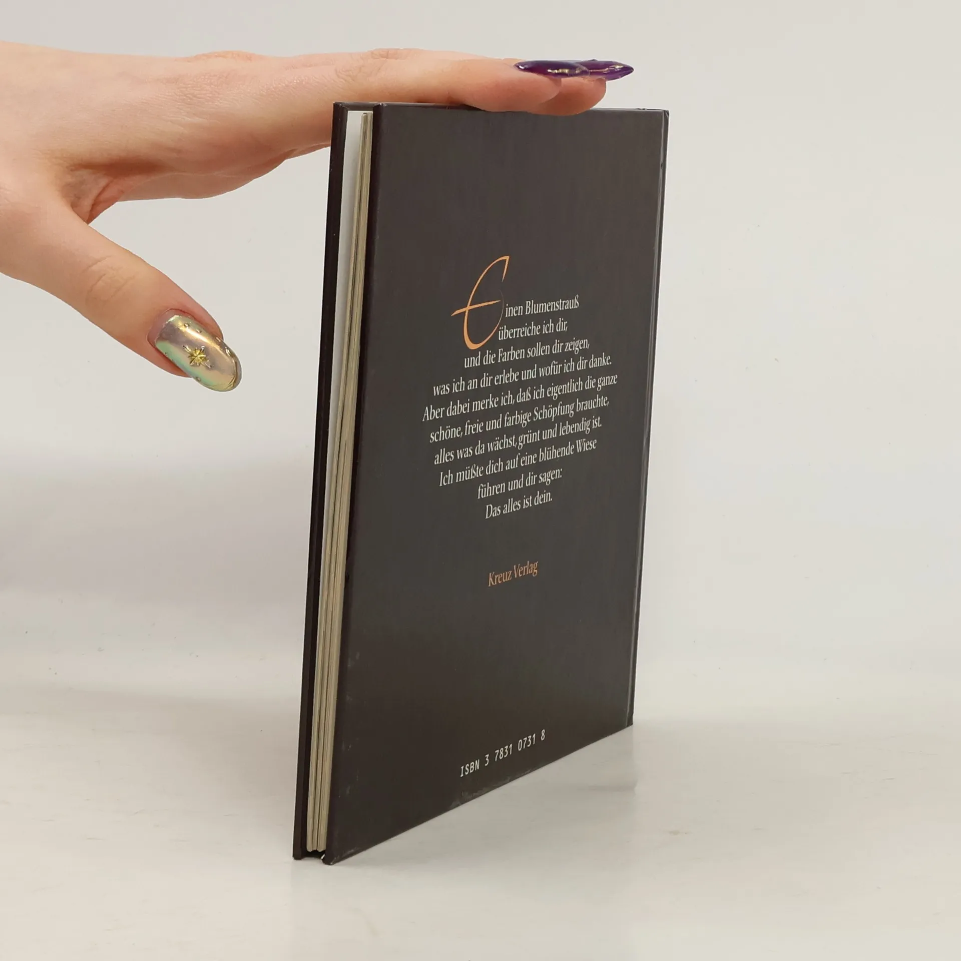 From the back Einen Blumenstrauß überreiche ich dir, und die Farben sollen dir zeigen, was ich an dir erlebe und wofür ich dir danke. Aber dabei merke ich, daß ich eigentlich die ganze schöne, freie und farbige Schöpfung brauchte, alles was da wächst, grunt und lebendig ist. Ich müßte dich auf eine blühende Wiese führen und dir Das alles ist dein.