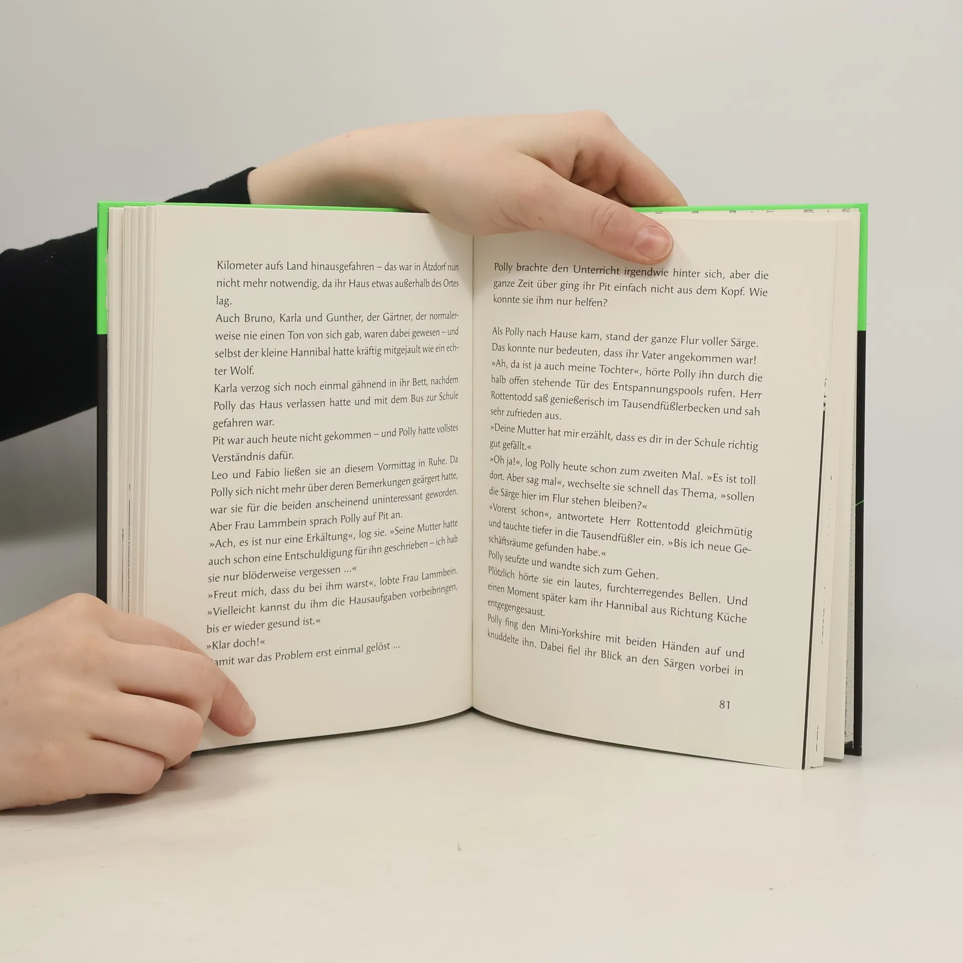 Nur weg von diesen Verrückten! Pollys Entschluss steht fest. Keinen Tag länger hält sie es mit ihrer Familie aus. Die seltsamen Vorlieben von Patrizius, Prospera, Pampe und Palme gehen ihr gehörig auf die Nerven: Schmeißfliegensalat zum Frühstück, entspannen im Spinnenpool und Spritztouren im Leichenwagen. Doch dann macht Polly in dem alten Haus ihres kürzlich verstorbenen Onkel Deprius eine ungeahnte Entdeckung und plötzlich ist nichts mehr, wie es war. Mit diesem Buch sind Lachkrämpfe garantiert!