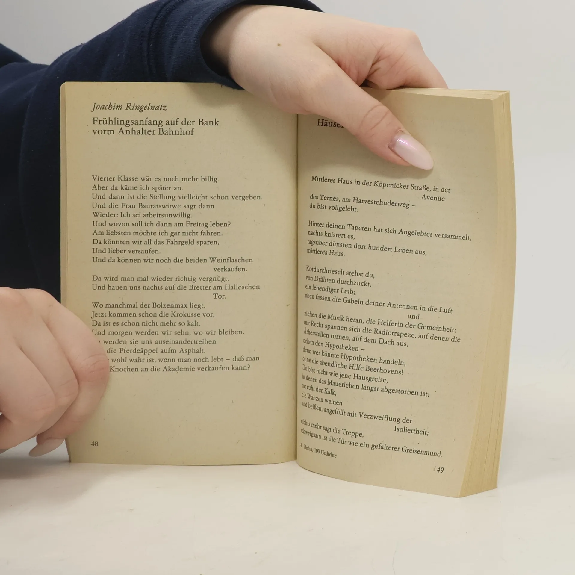 Die Anthologie bietet einen facettenreichen Blick auf Berlin durch Gedichte, die sowohl alte als auch neue Stimmen versammeln. Sie dokumentiert die großen Aufbrüche der Stadt, von ihrer Entwicklung zur Metropole bis zu ihrem Wiederaufbau nach 1945, und thematisiert die Kette der Niederlagen, wie die gescheiterte Novemberrevolution und den Mord an Rosa Luxemburg und Karl Liebknecht. Bertolt Brechts Gedicht „O Falladah, die du hangest!“ spiegelt bereits 1919 die Ängste der Menschen wider. Die frühen Stadtlandschaften von Georg Heym und Johannes R. Becher zeigen die Faszination des urbanen Lebens, während Oskar Loerke und Wieland Herzfelde die Einsamkeit des Individuums thematisieren. Mit Sarkasmus und Ironie reagieren Joachim Ringelnatz, Erich Kästner und Kurt Tucholsky auf die Realität der Weimarer Republik. Diese Haltung verbindet sich mit den Versen jüngerer Dichter wie Heinz Kahlau und Steffen Mensching. Gedichte von Richard Leising und Brigitte Struzyk reflektieren alltägliche Erfahrungen und das Zusammenspiel individueller und gesellschaftlicher Entwicklungen. Der Dialog zwischen Dichtern verschiedener Generationen verleiht der Sammlung ihren besonderen Reiz. Die letzte Zeile „ich muß und will noch bleiben“ fasst die unterschiedlichen Haltungen zu Berlin zusammen.
