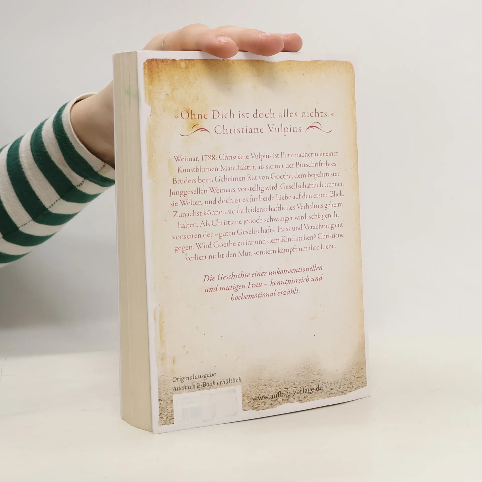 „Ohne Dich ist doch alles nichts.“ Christiane Vulpius Weimar, 1788: Christiane Vulpius ist Putzmacherin in einer Kunstblumen-Manufaktur, als sie mit der Bittschrift ihres Bruders beim Geheimen Rat Goethe, dem begehrtesten Junggesellen Weimars, vorstellig wird. Gesellschaftlich trennen sie Welten, und doch ist es für beide Liebe auf den ersten Blick. Zunächst können sie ihr leidenschaftliches Verhältnis geheim halten. Als Christiane jedoch schwanger wird, schlagen ihr vonseiten der „guten Gesellschaft“ Hass und Verachtung entgegen. Wird Goethe zu ihr und dem Kind stehen? Christiane verliert nicht den Mut, sondern kämpft um ihre Liebe. Die Geschichte einer unkonventionellen und mutigen Frau – kenntnisreich und hochemotional erzählt