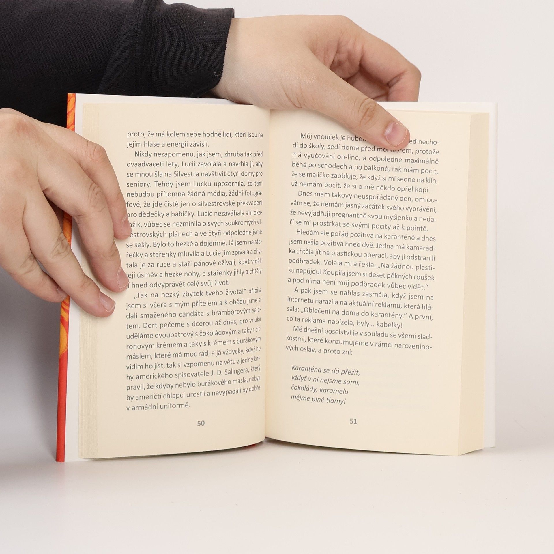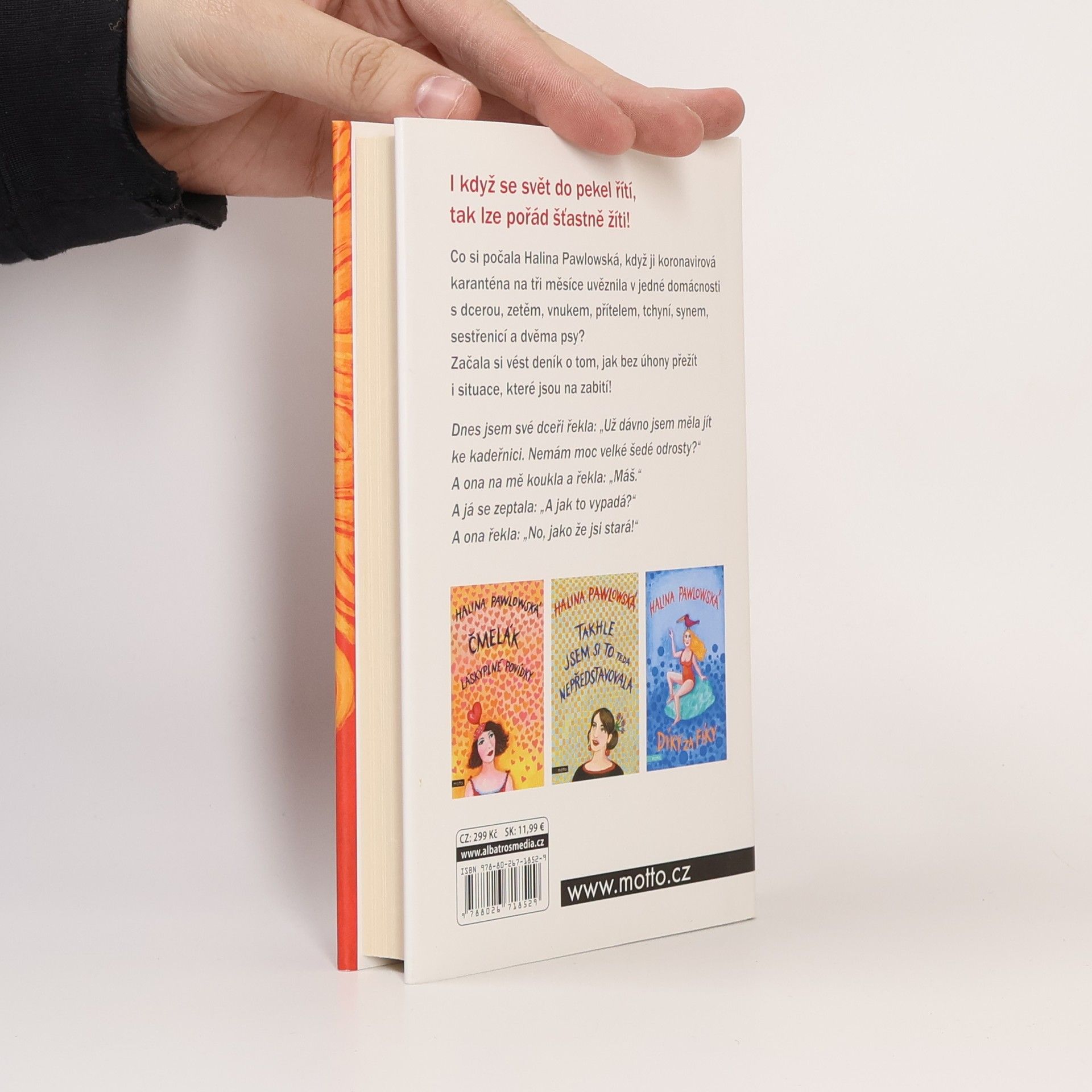 Populární česká autorka nabízí čtenářům drobné úsměvné příběhy a svérázné rady do života, tentokrát z prostředí koronavirové karantény. Ani v té nejsvízelnější situaci by člověka neměl opustit smysl pro humor. Autorka líčí příhody z doby, kdy se s rodinou ocitla v izolaci kvůli pandemii. Sedm lidí, každý s jinými stravovacími nároky a návyky, usilovná snaha se nezbláznit a najít na tom všem něco pozitivního - tak by se dal krátce shrnout soubor povídek a historek, zakončený tuctem receptů.