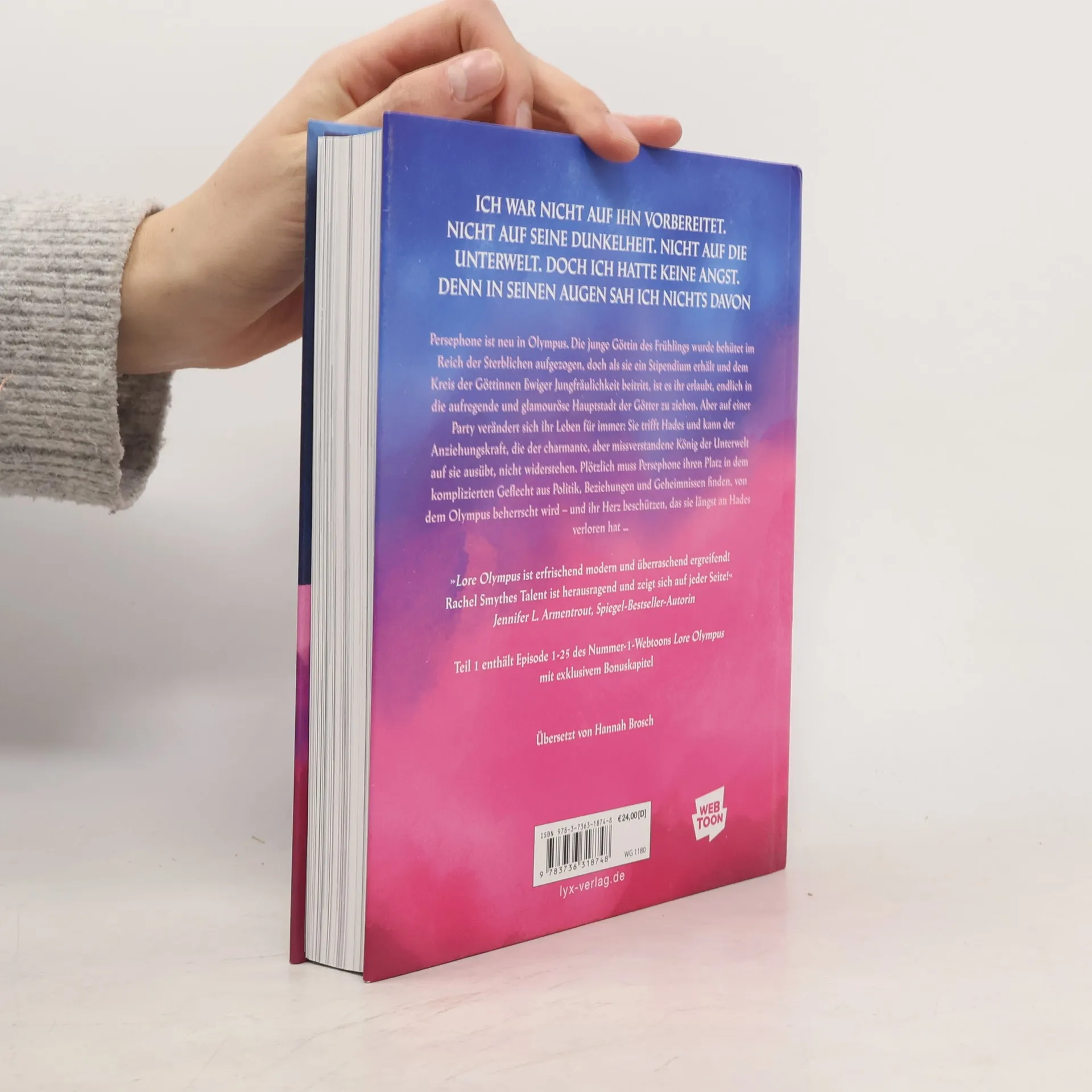 Der meistgelesene Webtoon der Welt von EISNER-Award, GOODREADS-CHOICE-Award-Gewinnerin und #1-NEW-YORK-TIMES-Bestseller-Autorin Rachel Smythe - endlich als hochwertige Printausgabe auf Deutsch Ich war nicht auf ihn vorbereitet. Nicht auf seine Dunkelheit. Nicht auf die Unterwelt. Doch ich hatte keine Angst. Denn in seinen Augen sah ich nichts davon Persephone ist neu in Olympus. Die junge Göttin des Frühlings wurde behütet im Reich der Sterblichen aufgezogen, doch als sie ein Stipendium erhält und dem Kreis der Göttinnen Ewiger Jungfräulichkeit beitritt, ist es ihr erlaubt, endlich in die aufregende und glamouröse Hauptstadt der Götter zu ziehen. Aber auf einer Party verändert sich ihr Leben für immer: Sie trifft Hades und kann der Anziehungskraft, die der charmante, aber missverstandene König der Unterwelt auf sie ausübt, nicht widerstehen. Plötzlich muss Persephone ihren Platz in dem komplizierten Geflecht aus Politik, Beziehungen und Geheimnissen finden, von dem Olympus beherrscht wird - und ihr Herz beschützen, das sie längst an Hades verloren hat ... „ LORE OLYMPUS ist erfrischend modern und überraschend ergreifend! Rachel Smythes Talent ist herausragend und zeigt sich auf jeder Seite!“ JENNIFER L. ARMENTROUT Teil 1 enthält Episode 1-25 des Nummer-1- WEBTOONS LORE OLYMPUS