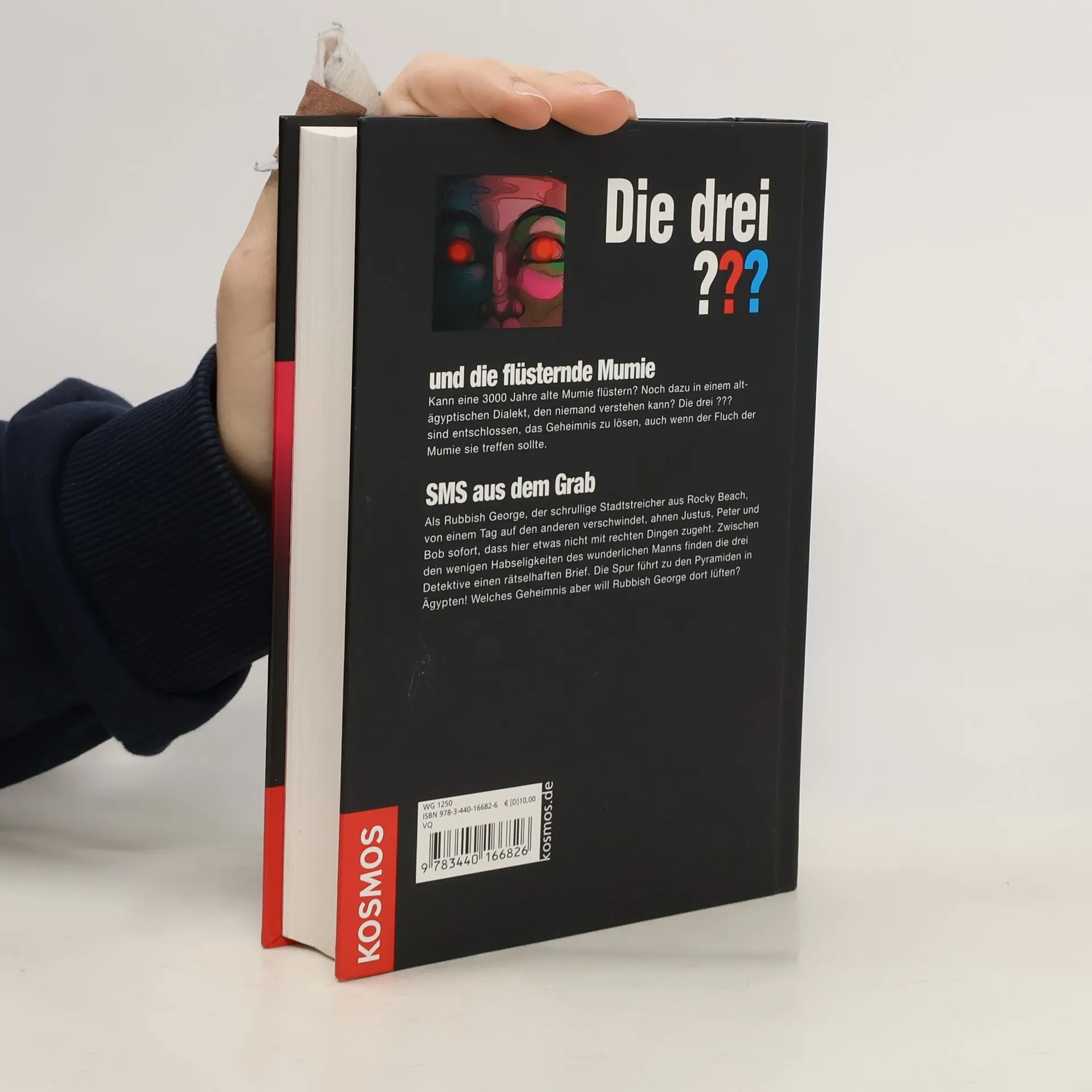 Zwei verflucht spannende Fälle in einem Band: Flüsternde Mumie: Kann eine 3000 Jahre alte Mumie flüstern? Noch dazu in einem altägyptischen Dialekt, den niemand verstehen kann? Die drei ??? sind entschlossen, das Geheimnis zu lösen, auch wenn der Fluch der Mumie sie treffen sollte. SMS aus dem Grab: Als Rubbish-George, der schrullige Tramp aus Rocky Beach, von einem Tag auf den anderen verschwindet, ahnen Justus, Peter und Bob sofort, dass hier etwas nicht mit rechten Dingen zugeht. Zwischen den wenigen Habseligkeiten des wunderlichen Mannes finden die drei Detektive einen rätselhaften Brief. Die Spur führt zu den Pyramiden in Ägypten! Welches Geheimnis aber will Rubbish George dort lüften? Die drei ??? begeben sich in das dunkle Reich der Sphinx – und geraten dabei in die Falle!