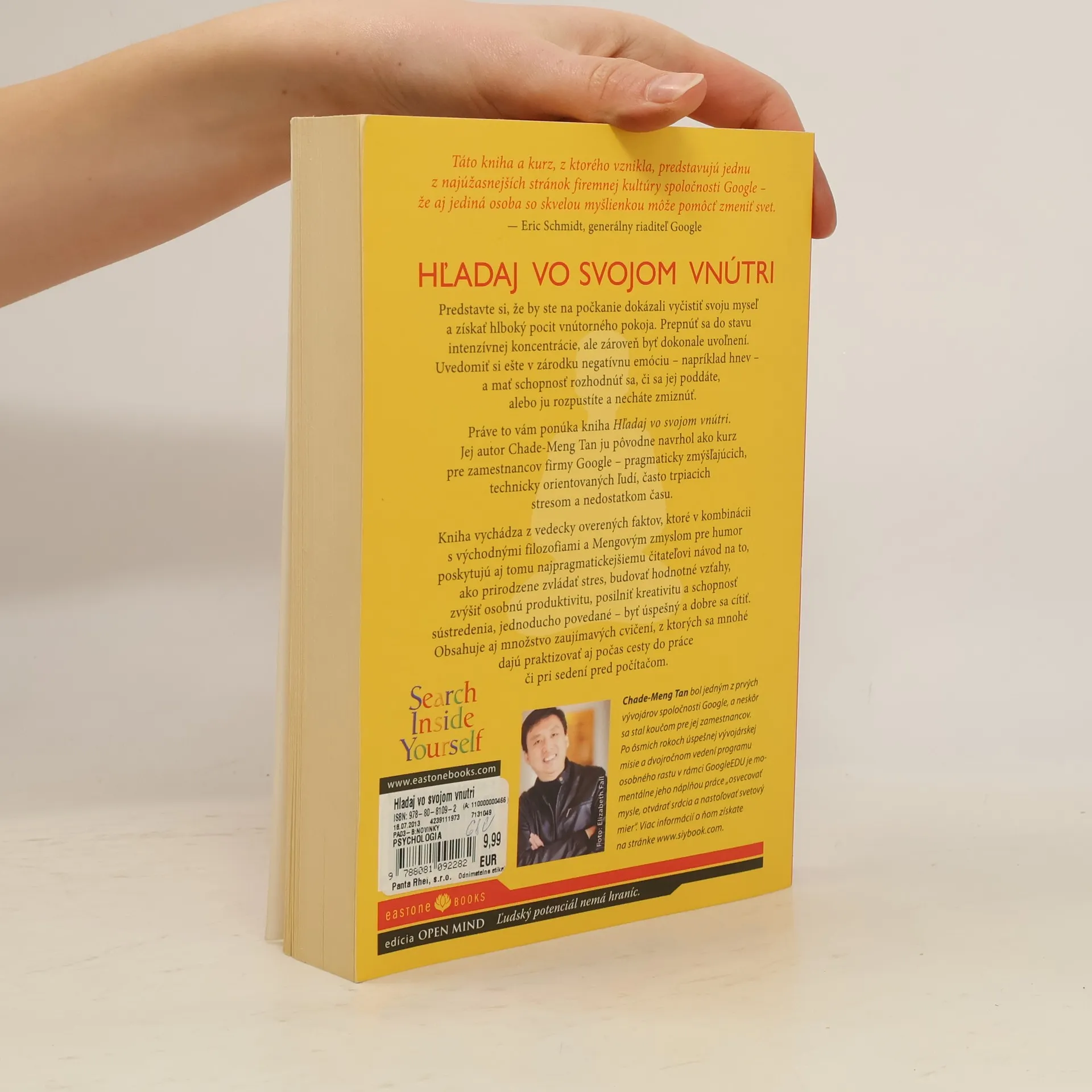 Predstavte si, že by ste na počkanie dokázali vyčistiť svoju myseľ a získať hlboký pocit vnútorného pokoja. Prepnúť sa do stavu intenzívnej koncentrácie, ale zároveň byť dokonale uvoľnení. Uvedomiť si ešte v zárodku negatívnu emóciu – napríklad hnev – a mať schopnosť rozhodnúť sa, či sa jej poddáte, alebo ju rozpustíte a necháte zmiznúť. Práve to vám ponúka kniha Hľadaj vo svojom vnútri. Jej autor Chade‑Meng Tan ju pôvodne navrhol ako kurz pre zamestnancov firmy Google – pragmaticky zmýšľajúcich, technicky orientovaných ľudí, často trpiacich stresom a nedostatkom času. Kniha obsahuje vedecky overené fakty a množstvo zaujímavých cvičení, z ktorých sa mnohé dajú praktizovať aj počas cesty do práce či pri sedení pred počítačom.