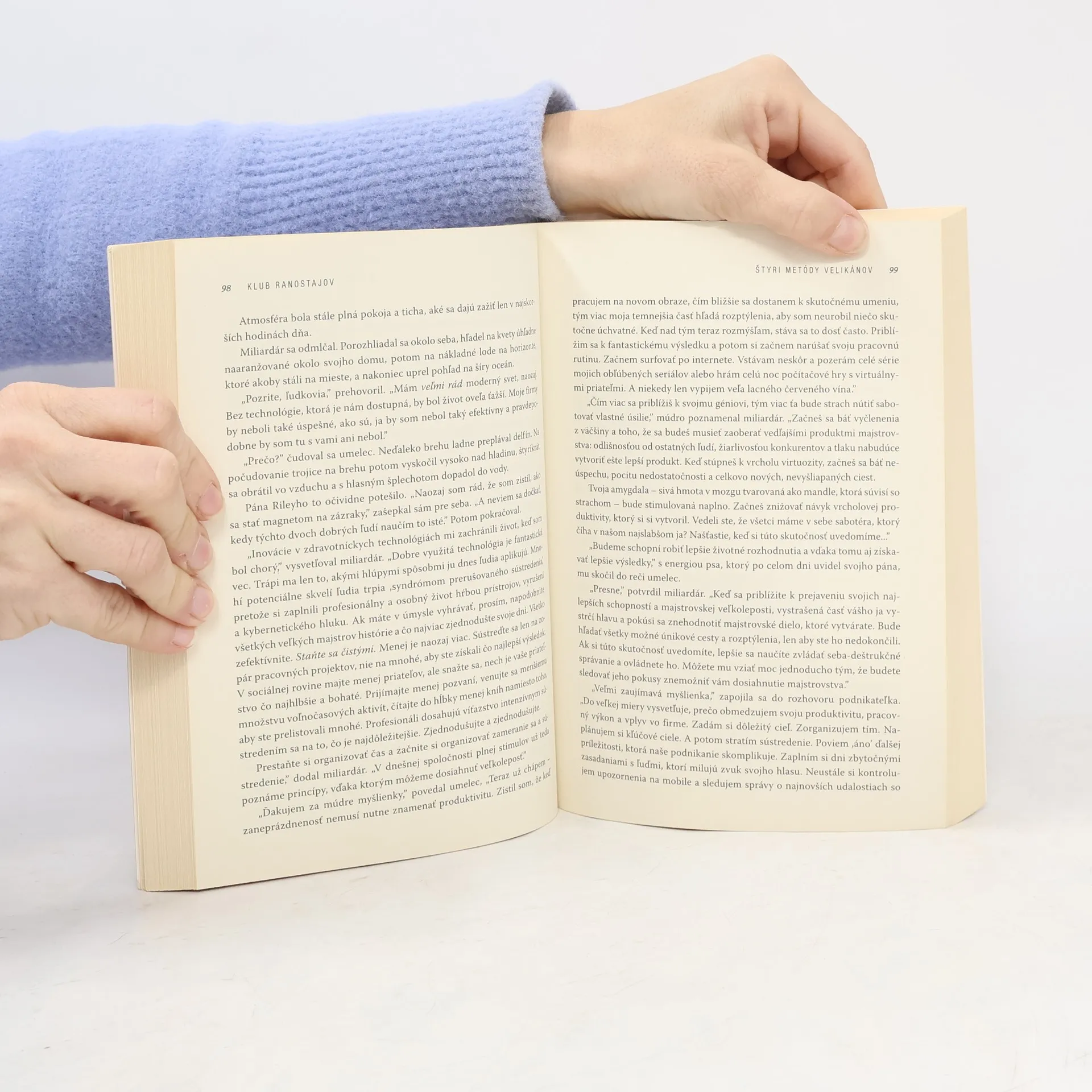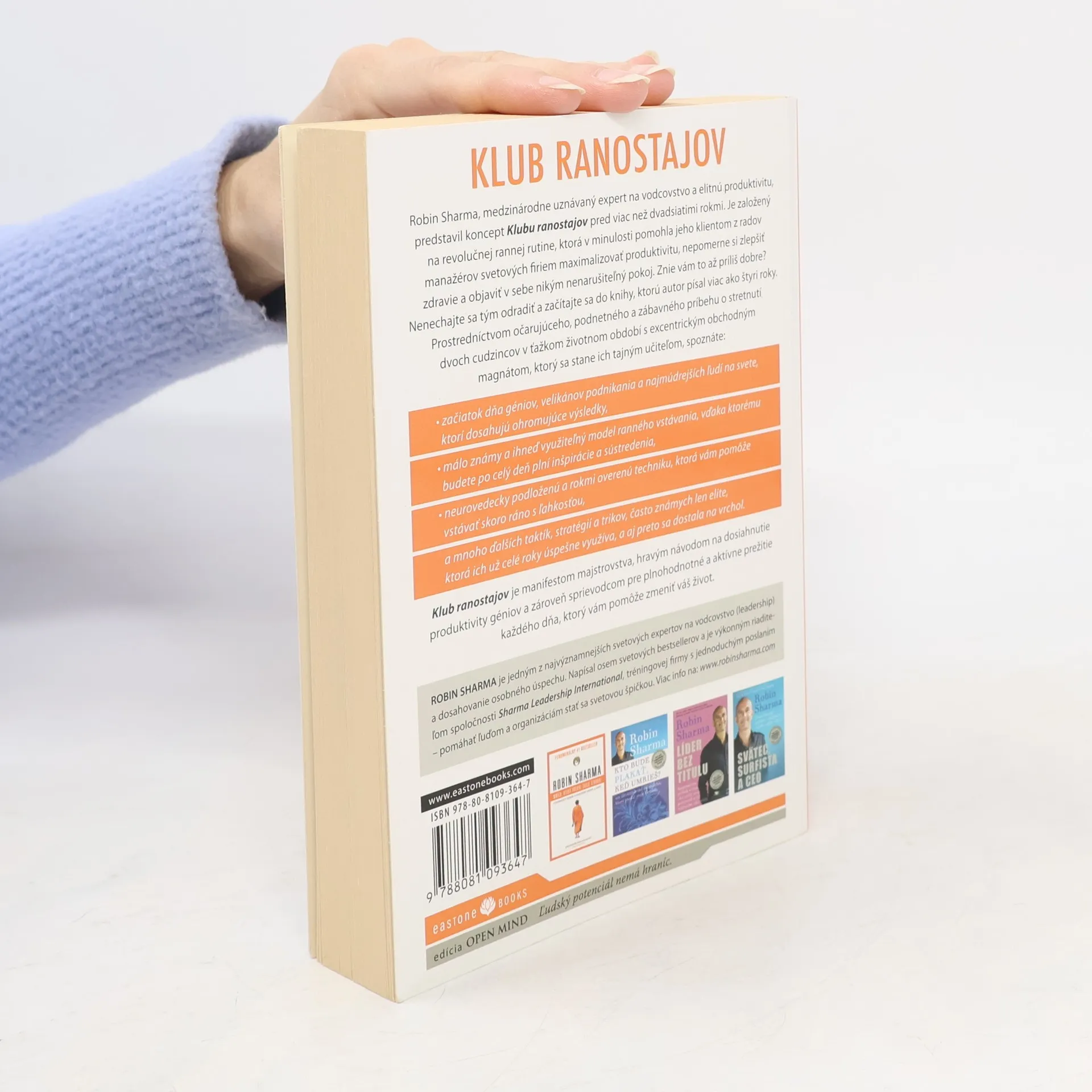 Robin Sharma, medzinárodne uznávaný expert na vodcovstvo a elitnú produktivitu, predstavil koncept Klubu ranostajov pred viac než 20 rokmi. Je založený na revolučnej rannej rutine, ktorá v minulosti pomohla jeho klientom z radov manažérov svetových firiem maximalizovať produktivitu, nepomerne si zlepšiť zdravie a objaviť v sebe nikým nenarušiteľný pokoj. Začítajte sa do knihy, ktorú autor písal viac ako štyri roky. Prostredníctvom podnetného a zábavného príbehu o stretnutí dvoch cudzincov v ťažkom životnom období s excentrickým obchodným magnátom, ktorý sa stane ich tajným učiteľom, spoznáte: začiatok dňa géniov a velikánov podnikania, málo známy a ihneď využiteľný model ranného vstávania, neurovedecky podloženú a rokmi overenú techniku a mnoho ďalších trikov často známych len elite, ktorá ich už celé roky úspešne využíva, a aj preto sa dostala na vrchol.