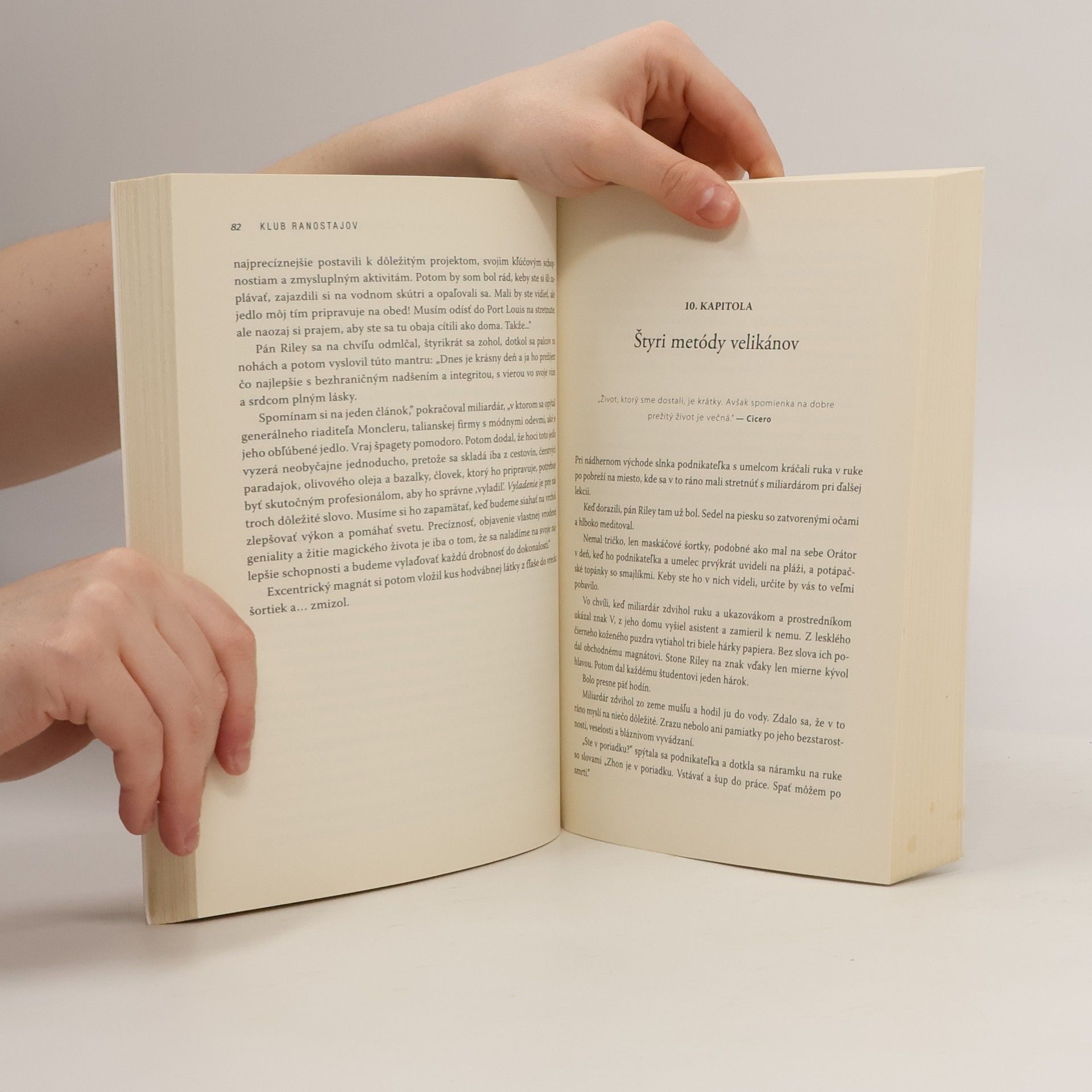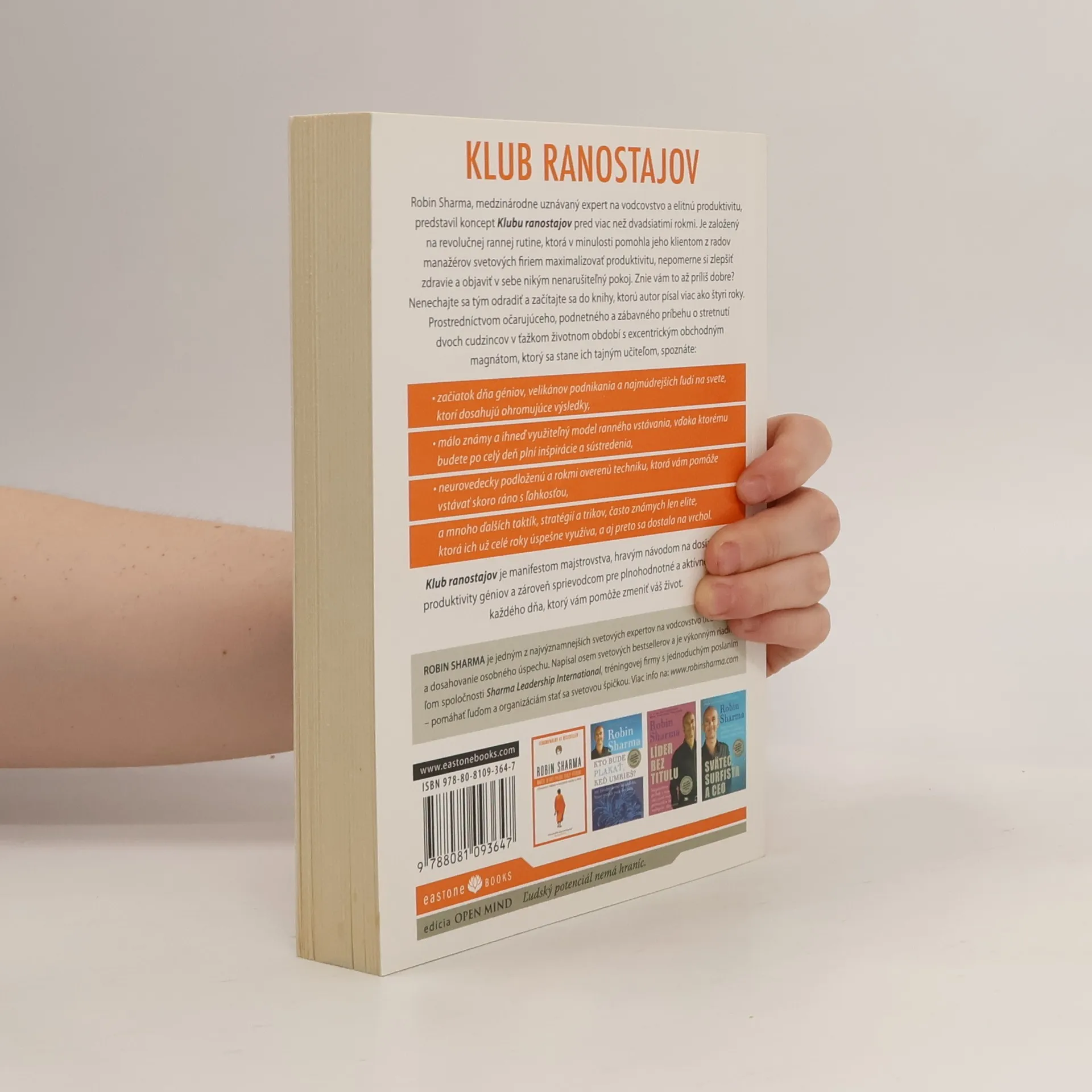 Robin Sharma, medzinárodne uznávaný expert na vodcovstvo a elitnú produktivitu, predstavil koncept Klubu ranostajov pred viac než 20 rokmi. Je založený na revolučnej rannej rutine, ktorá v minulosti pomohla jeho klientom z radov manažérov svetových firiem maximalizovať produktivitu, nepomerne si zlepšiť zdravie a objaviť v sebe nikým nenarušiteľný pokoj. Začítajte sa do knihy, ktorú autor písal viac ako štyri roky. Prostredníctvom podnetného a zábavného príbehu o stretnutí dvoch cudzincov v ťažkom životnom období s excentrickým obchodným magnátom, ktorý sa stane ich tajným učiteľom, spoznáte: začiatok dňa géniov a velikánov podnikania, málo známy a ihneď využiteľný model ranného vstávania, neurovedecky podloženú a rokmi overenú techniku a mnoho ďalších trikov často známych len elite, ktorá ich už celé roky úspešne využíva, a aj preto sa dostala na vrchol.