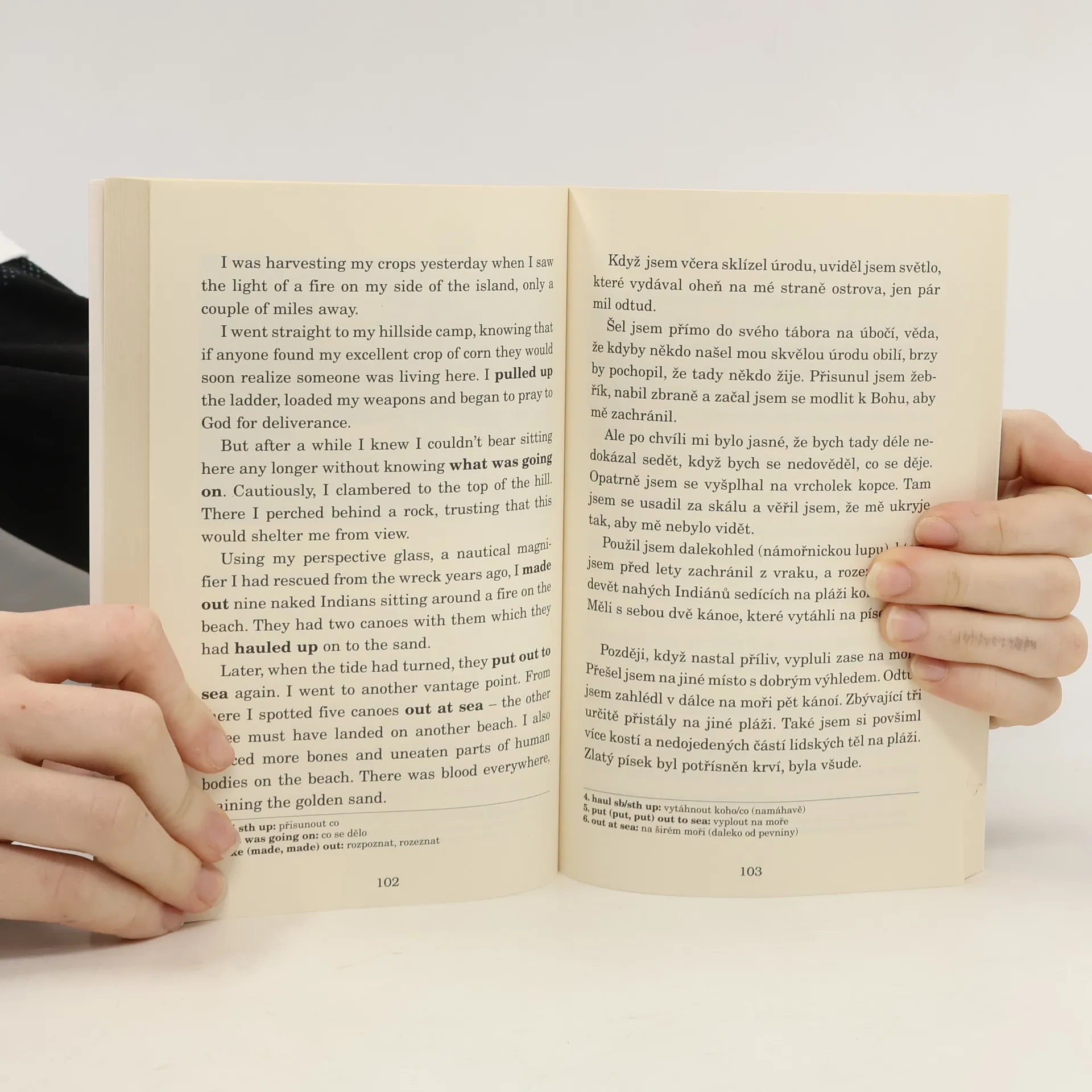 Jazyková úroveň: Mírně pokročilí. Robinson Crusoe podle příběhu Daniela Defoa. Po ztroskotání na opuštěném ostrově se Robinson Crusoe musí naučit, jak přežít. Zpočátku je sám – ale potom na ostrov dorazí kanibalové se zajatcem. Může Crusoe toho muže zachránit – nebo bude čelit stejnému osudu? A dostane se vůbec někdy z ostrova živý?
