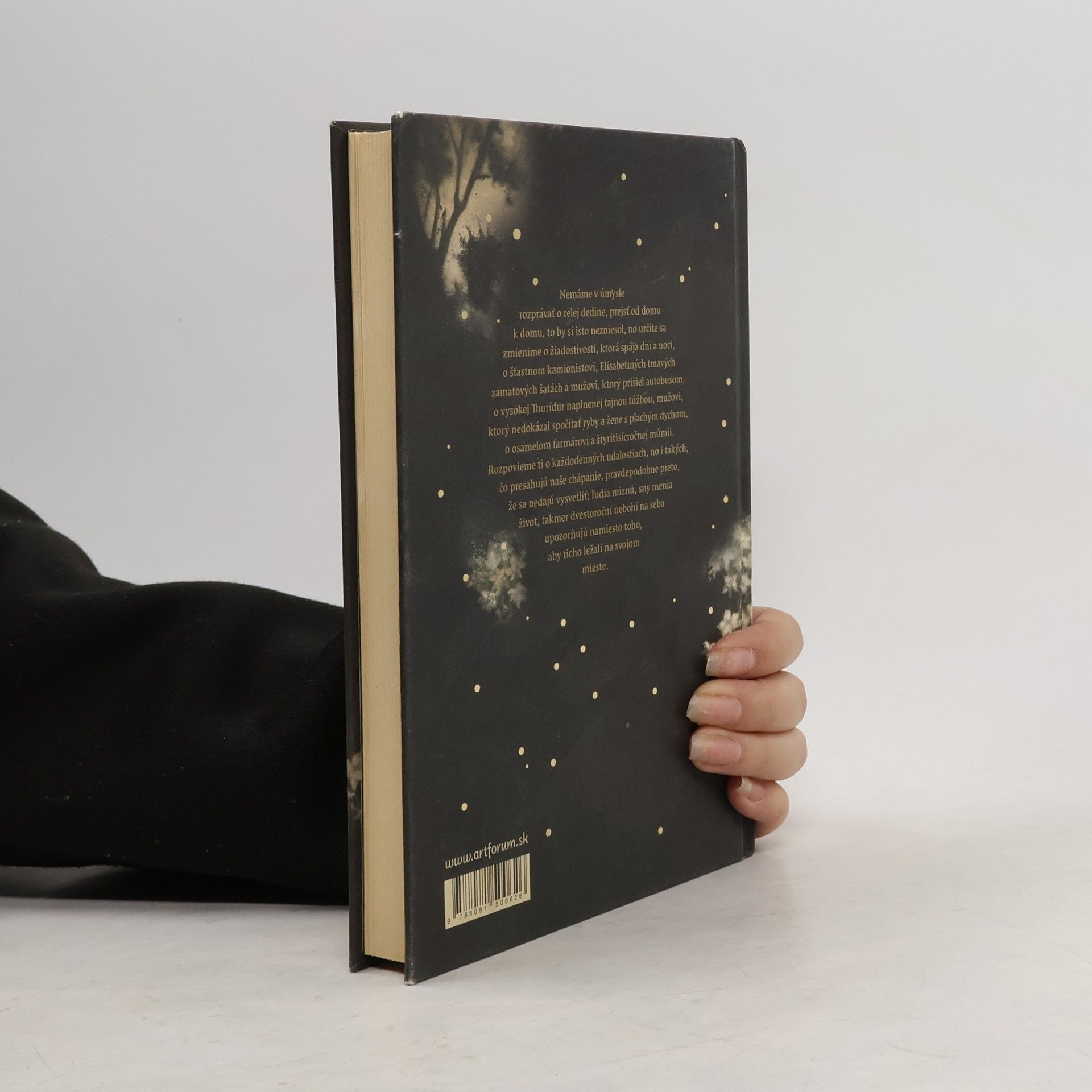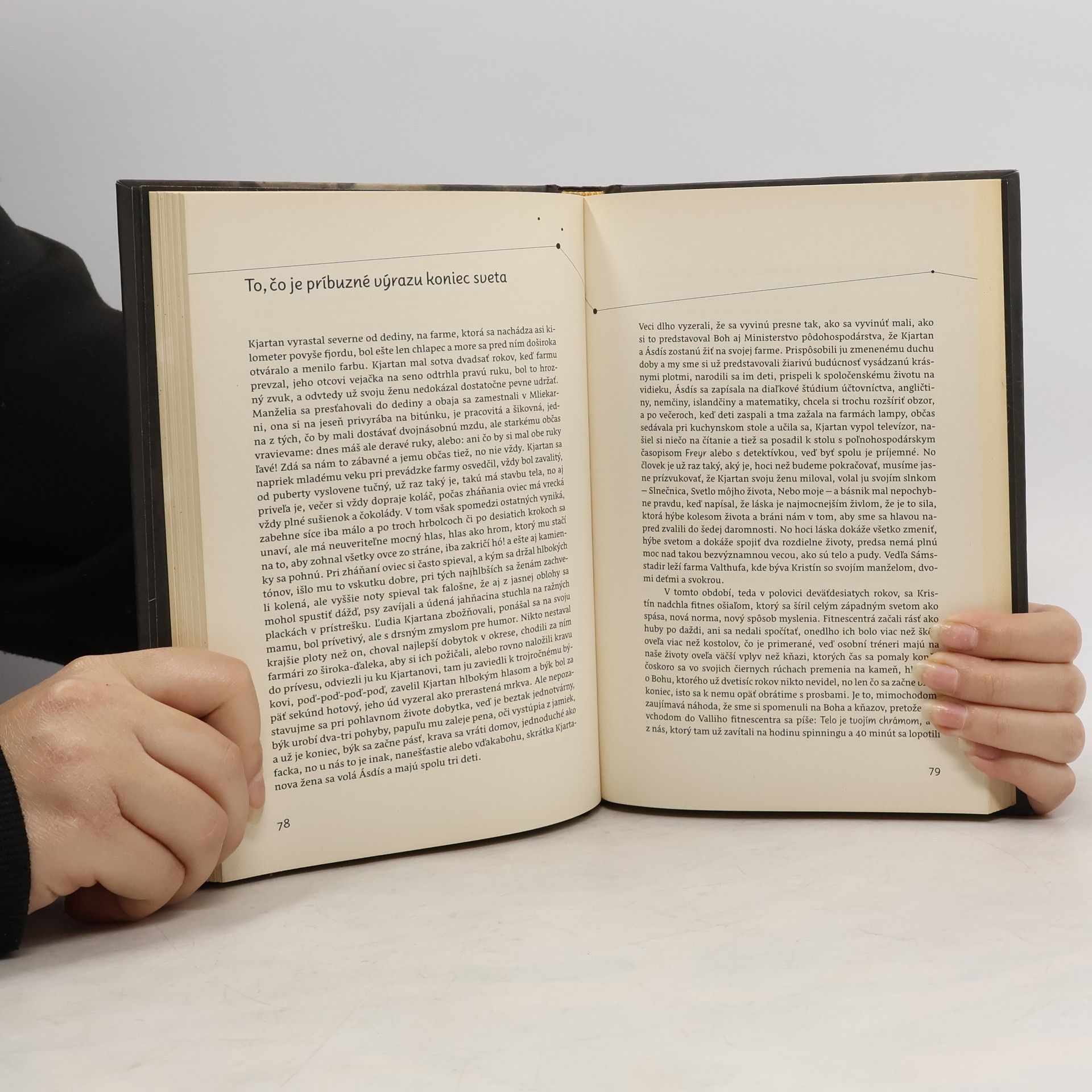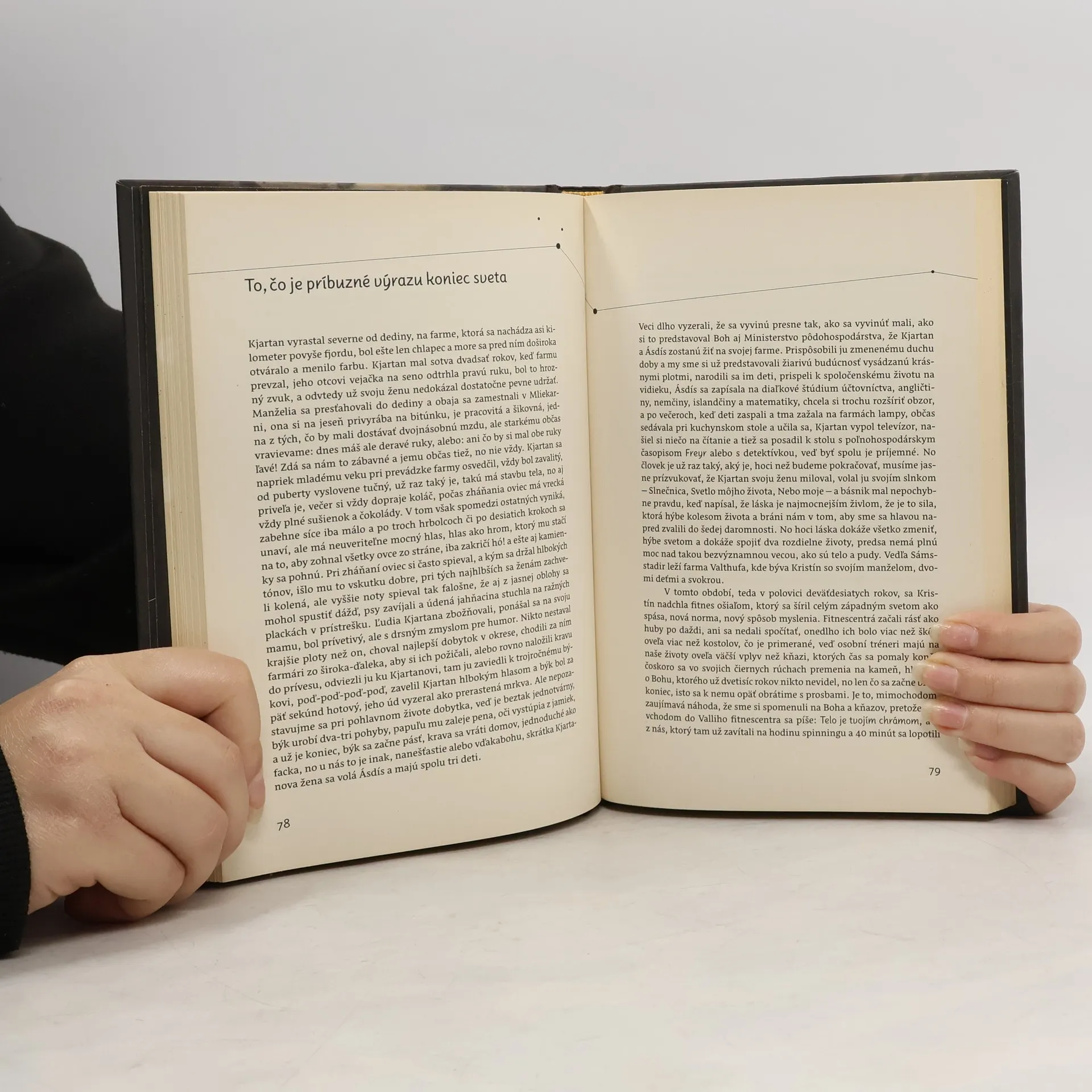 Dej sa odohráva v malej islandské dedine v deväťdesiatych rokoch dvadsiateho storočia, kde sa život riadi sezónnymi prácami a pohybmi mora. Hoci sa tu nič zásadné nedeje, vzťahy, radosti, nevera a smrť sú prepojené v príbehoch miestnych obyvateľov, zasiahnutých melanchóliou a skrytým šialenstvom. Román je plný drobných poetických príbehov a ironického zúčtovania autora s divokou dobou konca dvadsiateho storočia. Rozprávač, možno kolektívne vedomie dediny, pozná všetko, čo sa deje, a s múdrosťou komentuje životy malých ľudí. Bez sentimentu kladie otázky o smrti, živote, vášni a láske. "Čas plynie, žijeme a potom umierame. Ale čo je vôbec život? Je to Jónas mysliaci na zaoblené vtáčie krídla, Jónas, ktorého uspáva Thorgrímovo hlboké dýchanie. A aký je odstup medzi životom a smrťou? Je medzi nimi vôbec nejaký odstup, a ak áno, ako sa nazýva? Merali by sme ho v kilometroch či myšlienkach, a dokáže sa cezeň niekto dostať - prejsť na druhú stranu a vrátiť sa späť?" Úryvok z básne H. Péturssona prebásnila M. Haugová.