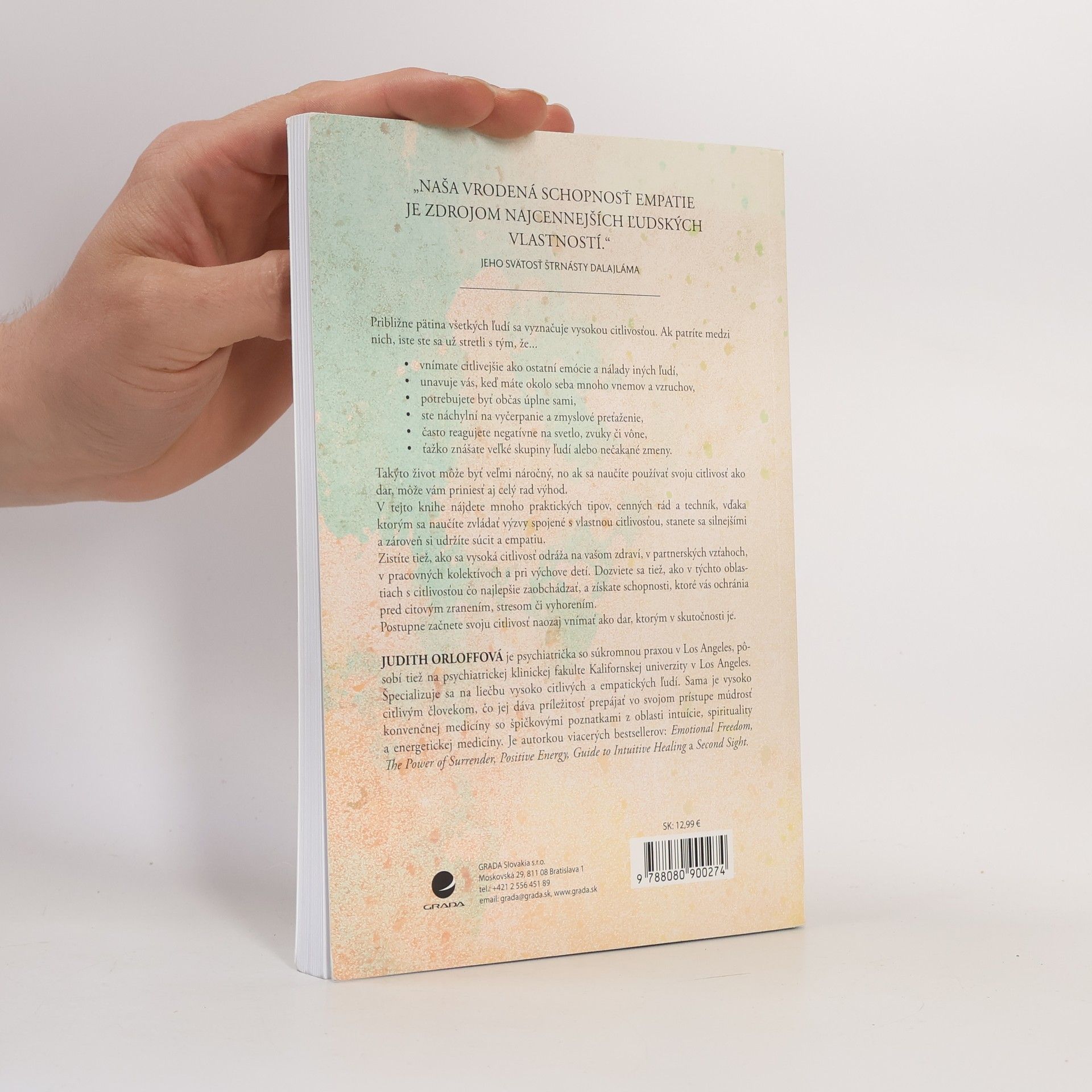 Približne pätina ľudí má vysokú citlivosť, čo môže viesť k rôznym výzvam, ako sú intenzívne vnímanie emócií, únava z podnetov, potreba samoty, náchylnosť na vyčerpanie a ťažkosti v skupinách. Život s touto citlivosťou môže byť náročný, no ak ju prijmete ako dar, môže vám priniesť mnohé výhody. Kniha ponúka praktické tipy, cenné rady a techniky, ktoré vám pomôžu zvládať výzvy spojené s citlivosťou, posilniť sa a zároveň si zachovať súcit a empatiu. Zistíte, ako citlivosť ovplyvňuje vaše zdravie, vzťahy, pracovné prostredie a výchovu detí, a naučíte sa, ako s ňou najlepšie zaobchádzať. Získate schopnosti, ktoré vás ochránia pred emocionálnym zranením, stresom a vyhorením. Autorka, sama citlivá osobnosť a psychiatrička, ponúka pohľad na vaše „ťažkosti“ a pomáha vám uvedomiť si, že to, čo prežívate, je normálne. Kniha je určená nielen vysoko citlivým jednotlivcom, ale aj ich rodičom, partnerom, učiteľom a terapeutom, čím rozširuje porozumenie a empatiu voči citlivým osobám.