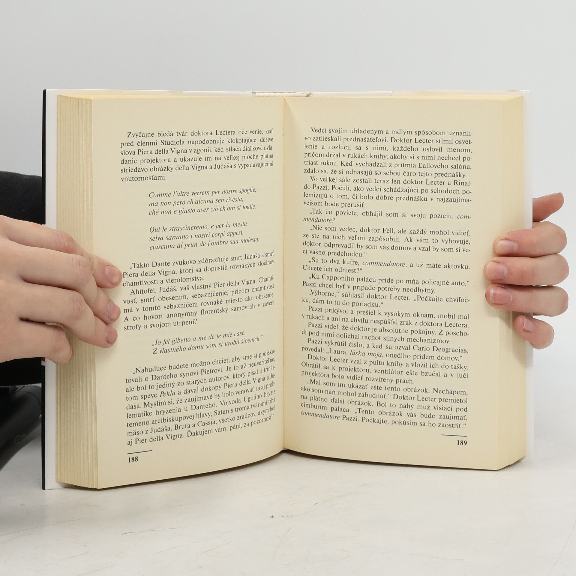 Dlho očakávané pokračovanie románu Mlčanie jahniat. Sedem rokov prešlo odvtedy, čo dr. Hannibal Lecter ušiel z väzenia. Lenže jeho šiesta obeť, ktorá prežila, Mason Verger, je posadnutý túžbou po pomste... Zistil, že ak chce upútať jeho pozornosť, musí mať ako návnadu to, na čom Lecterovi najviac záleží... Táto kniha nás opäť uvádza do spôsobu myslenia vraha a vykresľuje mrazivý obraz toho, ako zákerne a nenápadne sa rodí a vyvíja zlo