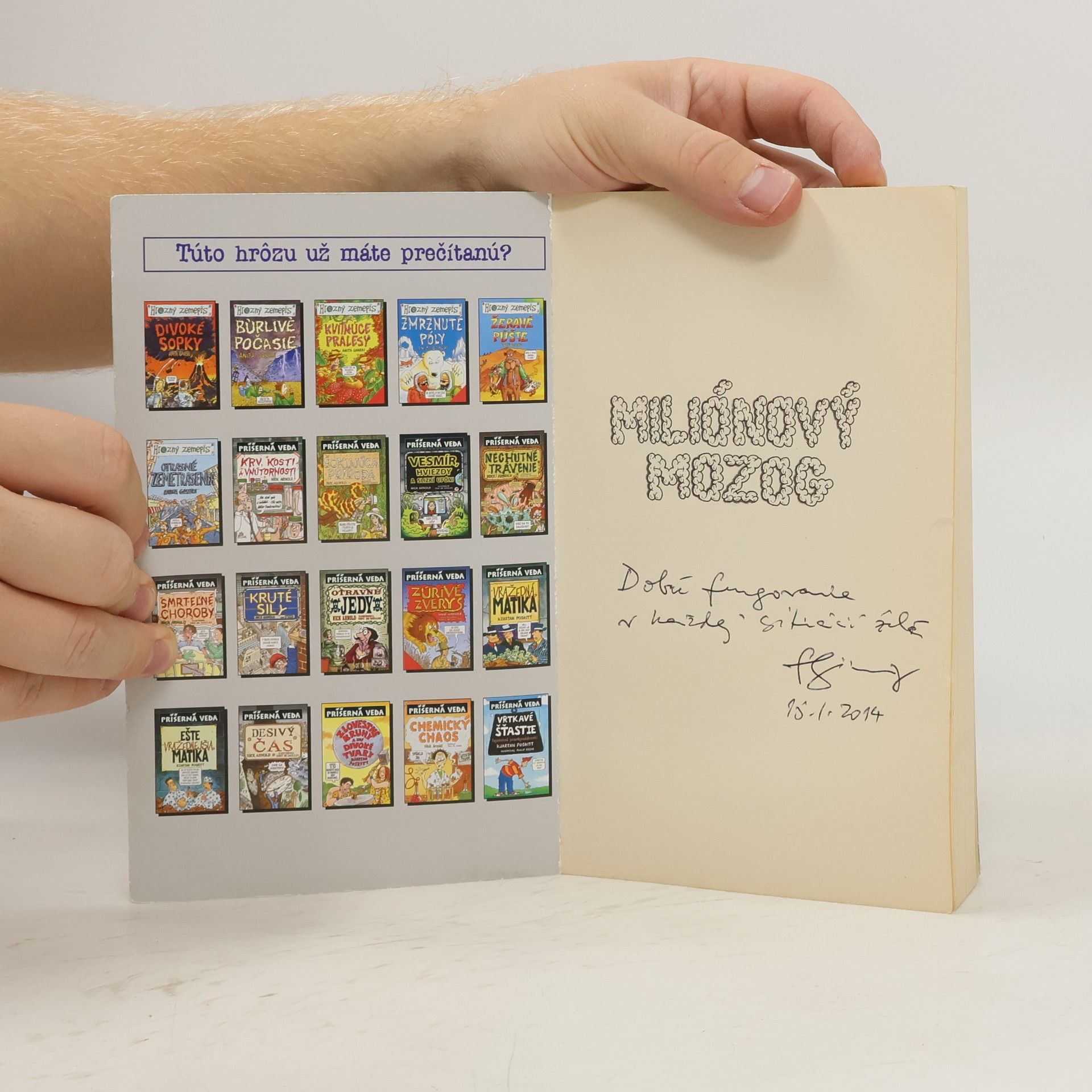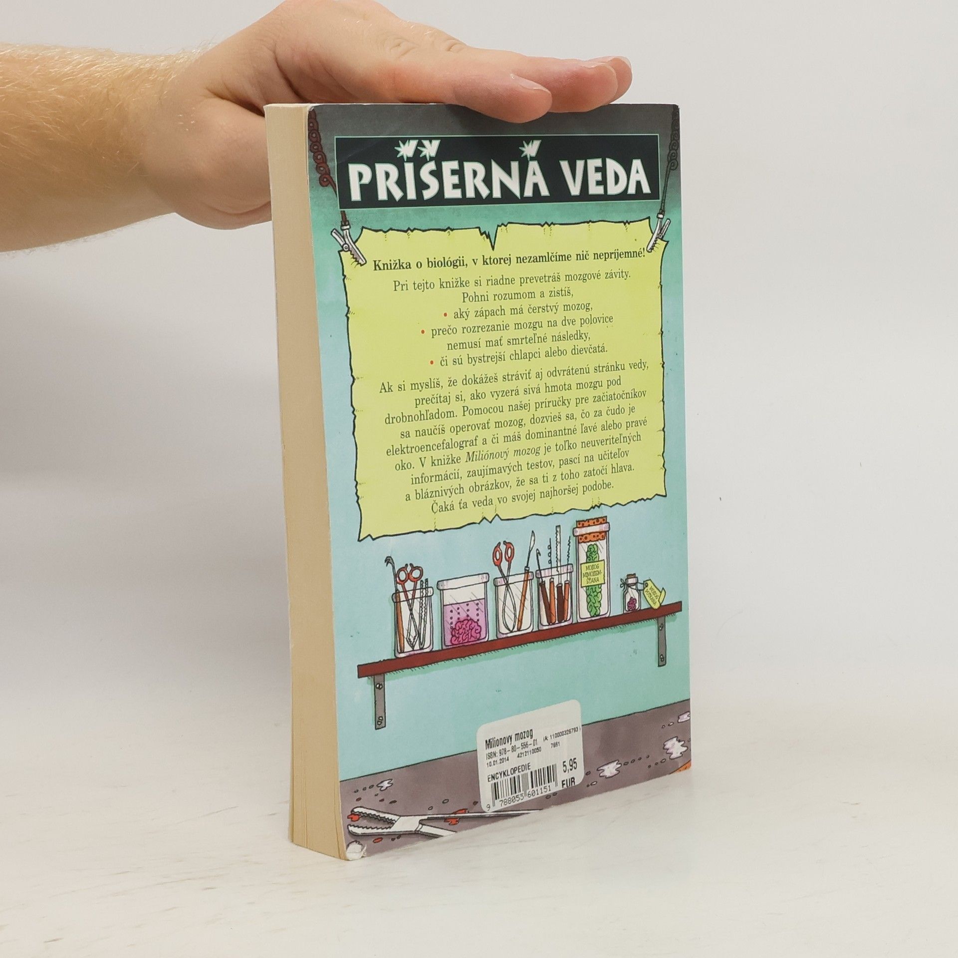 Knižka o biológii, v ktorej nezamlčíme nič nepríjemné! Pri tejto knižke si riadne prevetráš mozgové závity. Pohni rozumom a zistíš, aký zápach má čerstvý mozog, prečo rozrezanie mozgu na dve polovice nemusí mať smrteľné následky, či sú bystrejší chlapci alebo dievčatá. Ak si myslíš, že dokážeš stráviť aj odvrátenú stránku vedy, prečítaj si, ako vyzerá sivá hmota mozgu pod drobnohľadom. Pomocou našej príručky pre začiatočníkov sa naučíš operovať mozog, dozvieš sa, čo za čudo je elektroencefalograf a či si ľavooký alebo pravooký. V knižke Miliónový mozog je toľko neuveriteľných informácií, zaujímavých testov, pascí na učiteľov a bláznivých obrázkov, že sa ti z toho zatočí hlava.